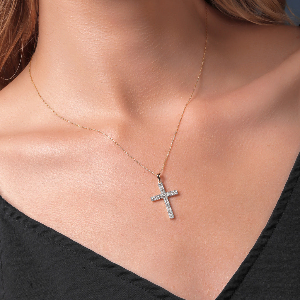 ELEGANT CROSS CRUCIFIX PENDANT: This exquisite pendant is a symbol of faith and style, featuring a beautifully crafted 10K yellow gold cross adorned with 55 lab-grown diamonds in a stunning 2-line design.