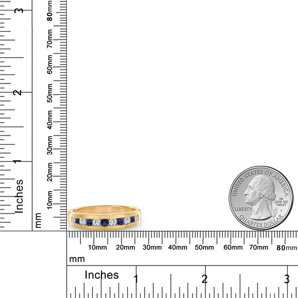 PRECISION-CUT GEMSTONES: The meticulous arrangement of white lab-grown diamonds and blue sapphires, totaling 0.63 Cttw, showcases precision and attention to detail. Each stone, set within the band, contributes to the ring's overall brilliance and elegance.