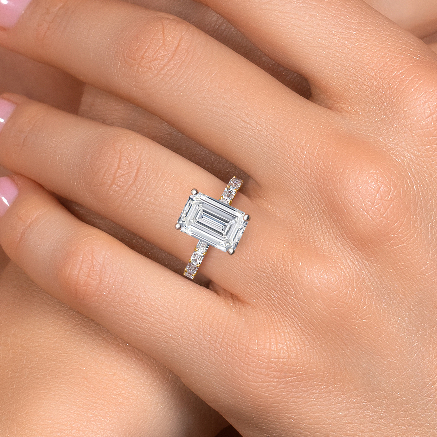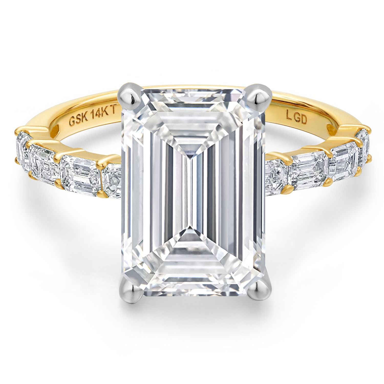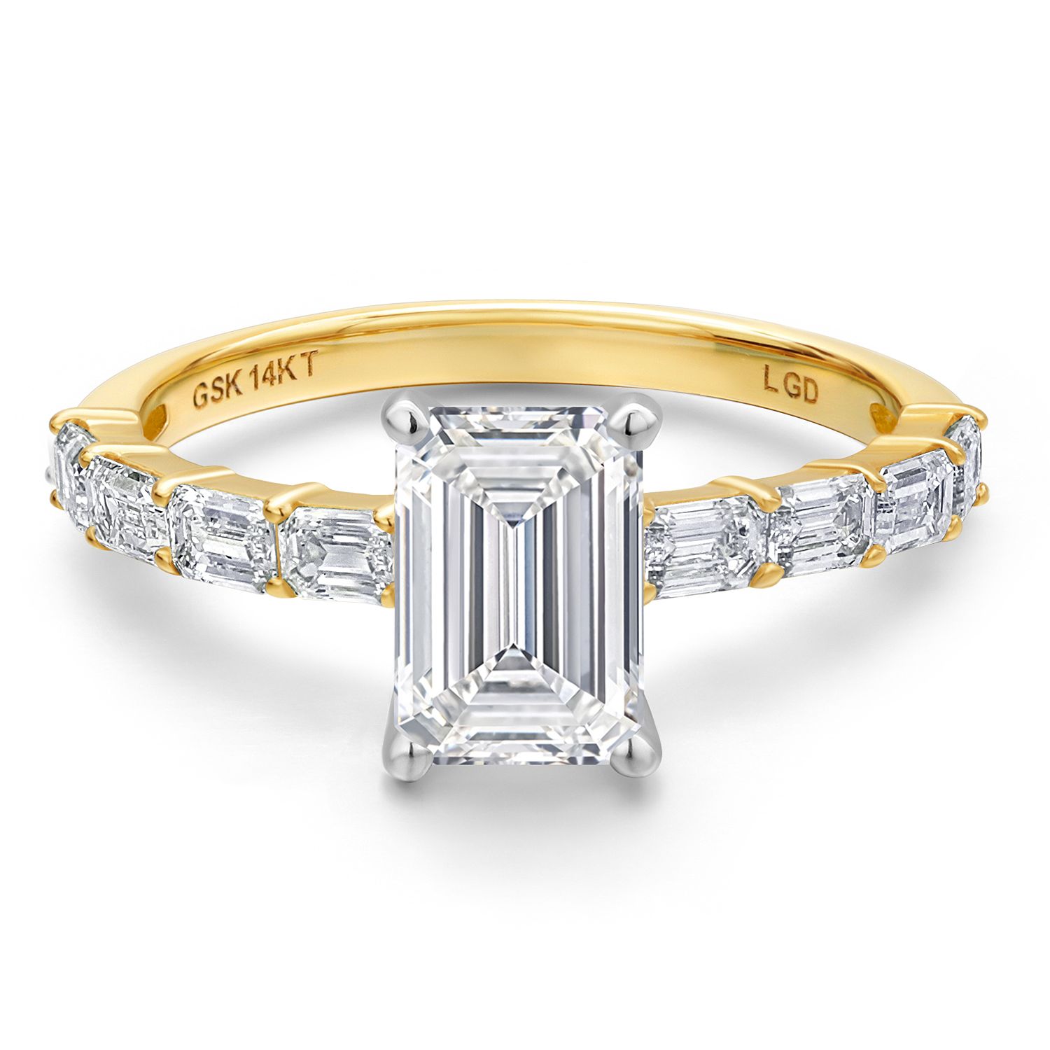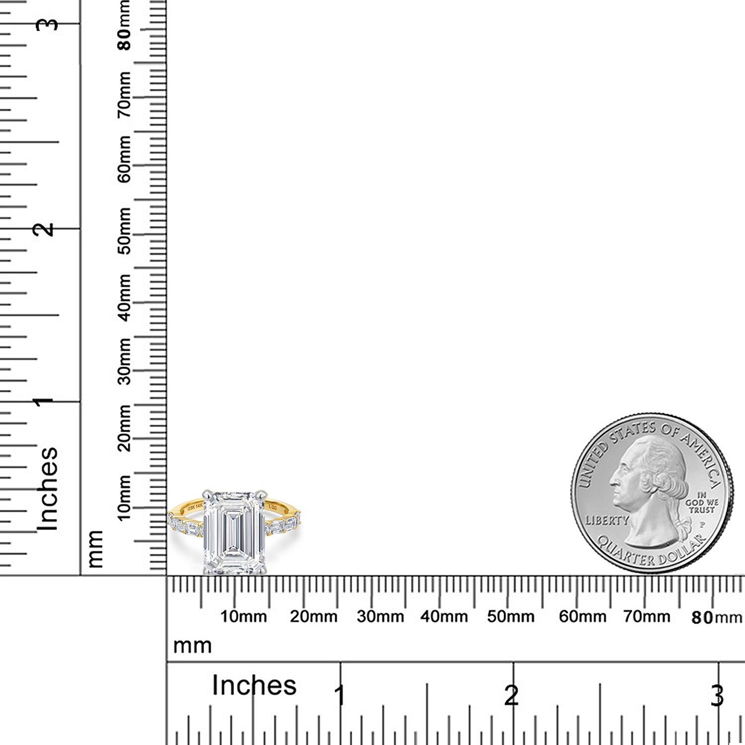 EMERALD-CUT CENTER DIAMOND WITH F-G COLOR AND VS1 CLARITY: This ring features a stunning emerald-cut lab-grown diamond as the centerpiece, showcasing a near-colorless F-G color grade and exceptional VS1 clarity. The emerald cut emphasizes the diamond’s clarity and brilliance, creating a timeless and sophisticated look that captures light beautifully and exudes elegance.