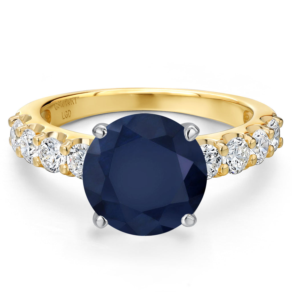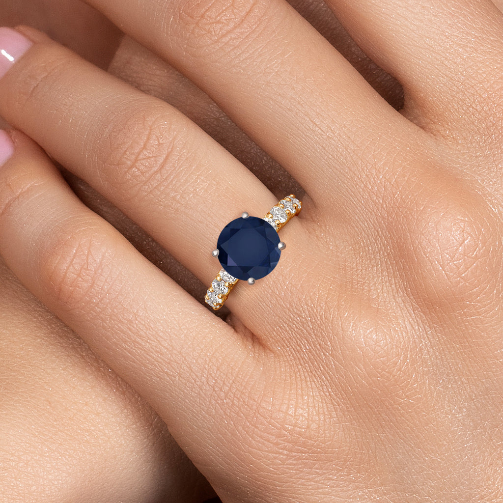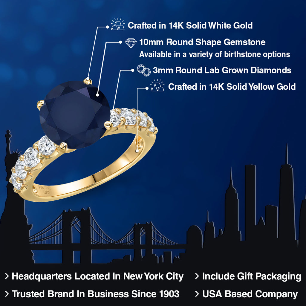 MEASUREMENTS: 10x10mm Round Diffused Blue Sapphire, 3x3mm Round E - F Lab Grown Diamond. Total Carat Weight is 5.83 cttw