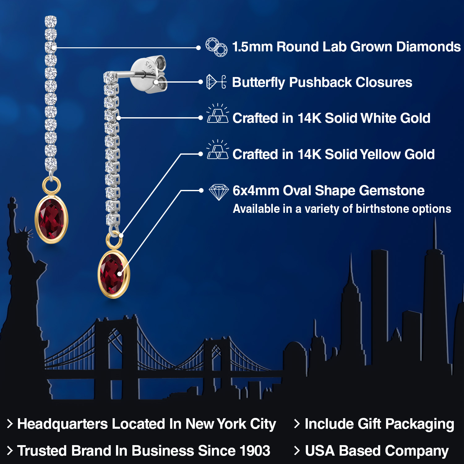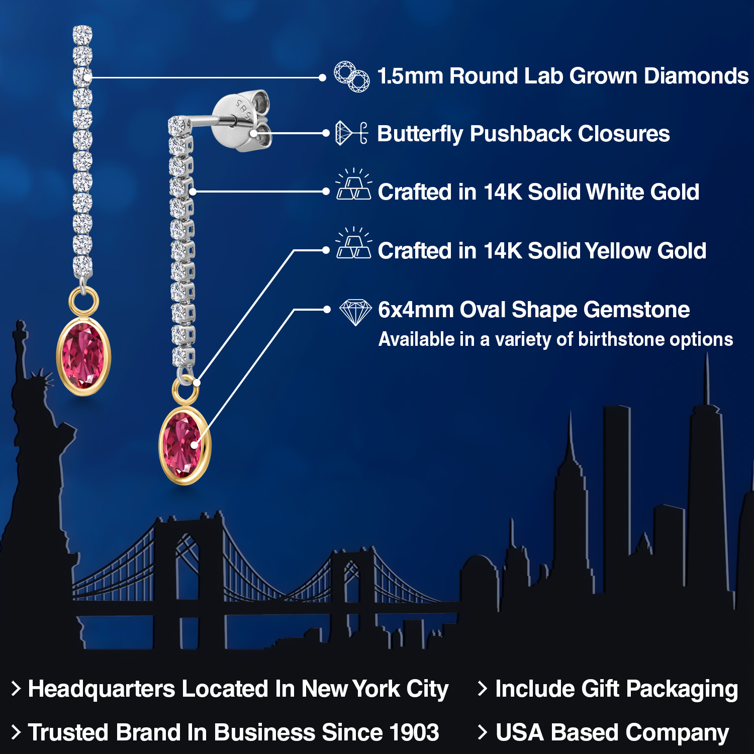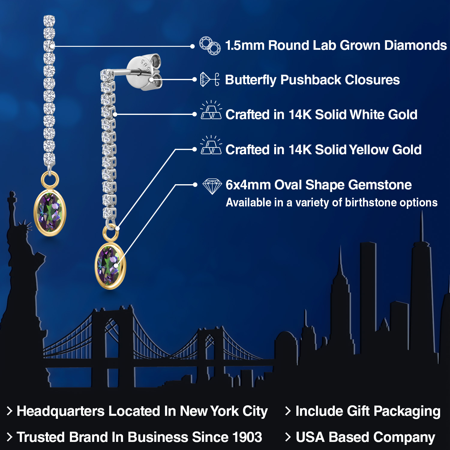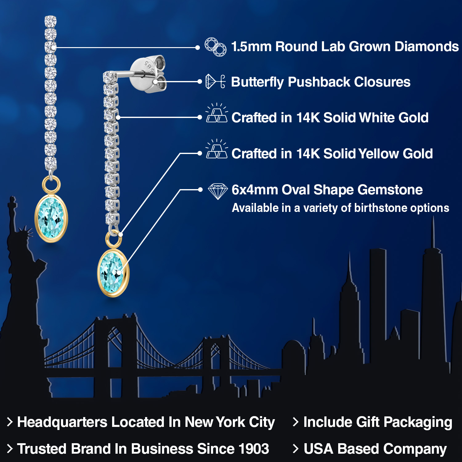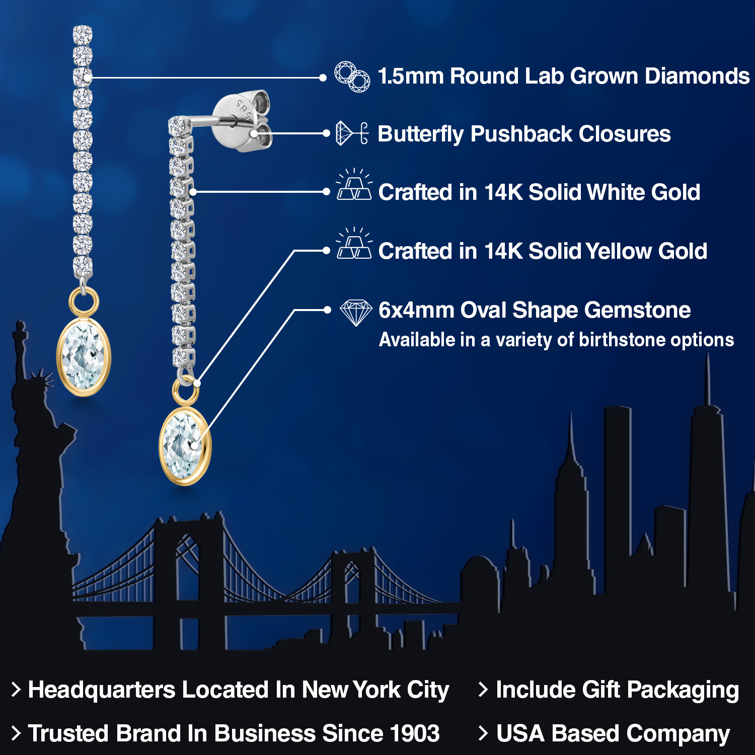 14K Two Tone Gold Gemstone Birthstone and Lab Grown Diamond Long Liner Chain Dangle Earrings for Women | Oval 6X4MM and Round 1.5MM Accents | Gold Chain Drop Earrings