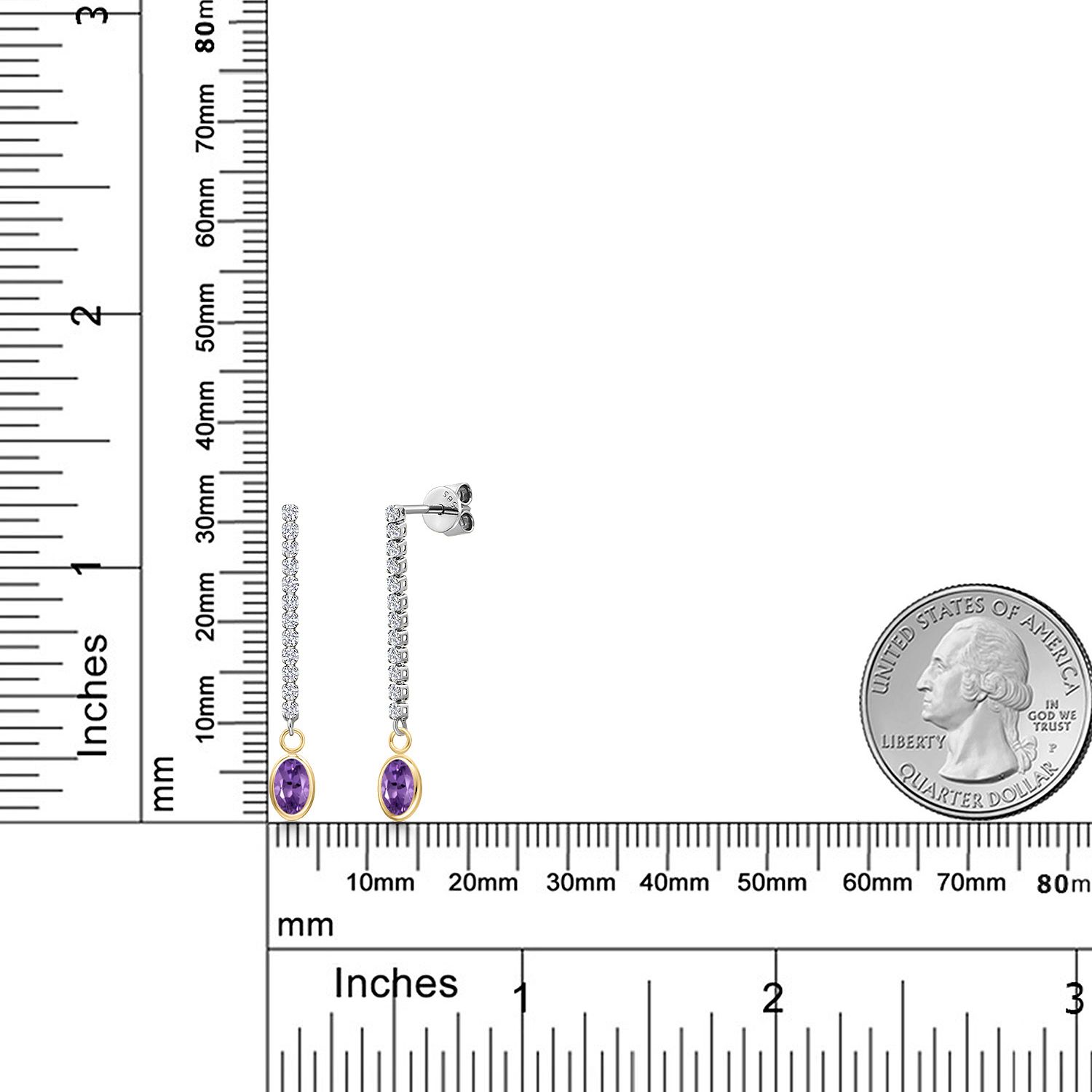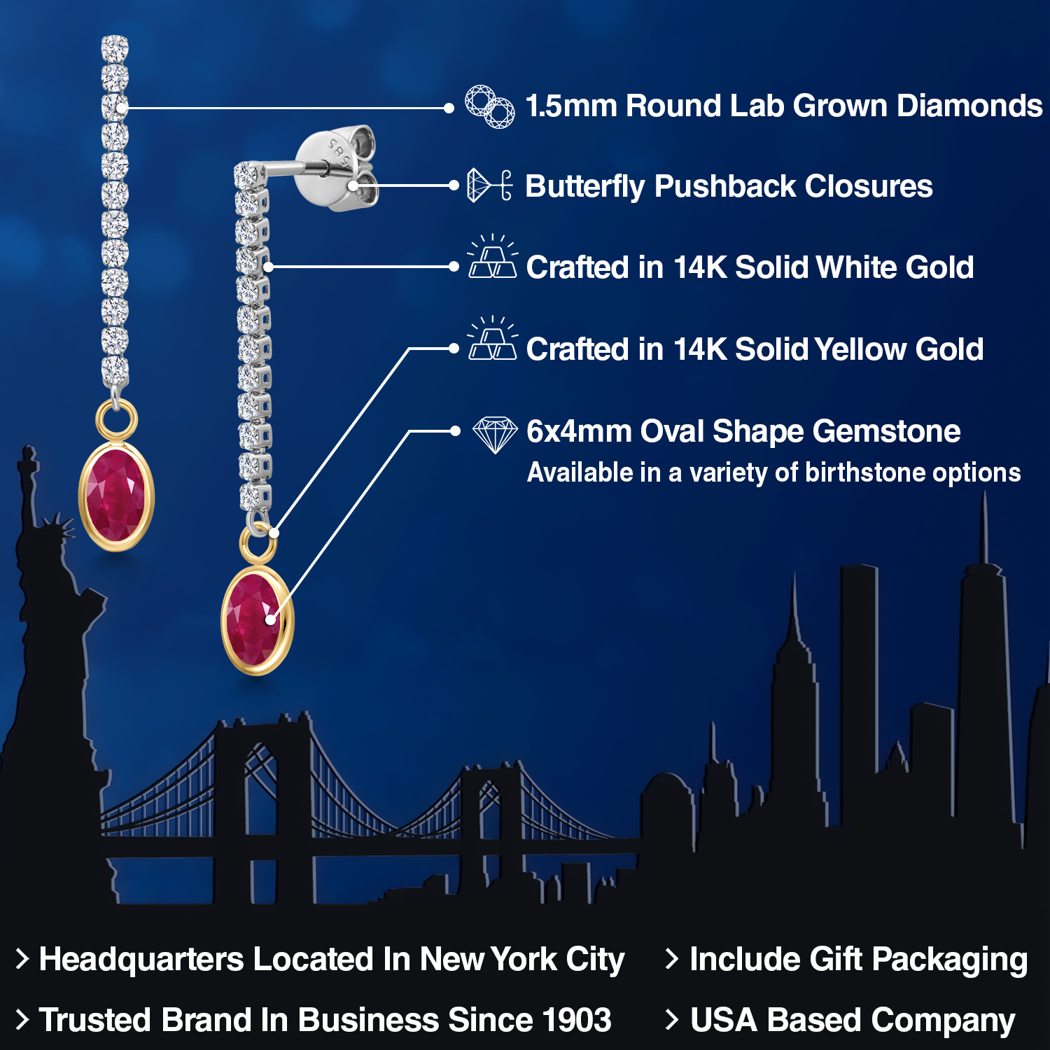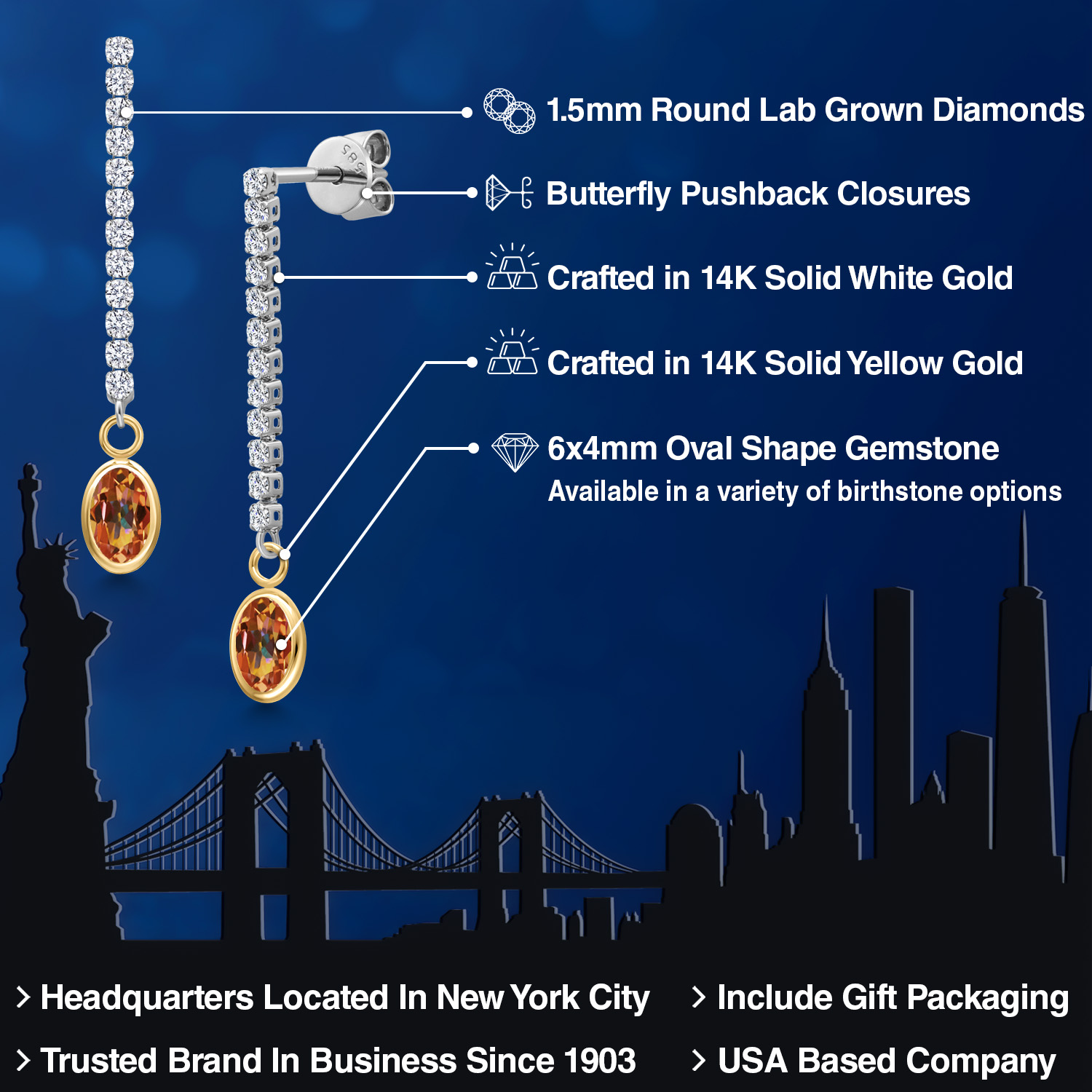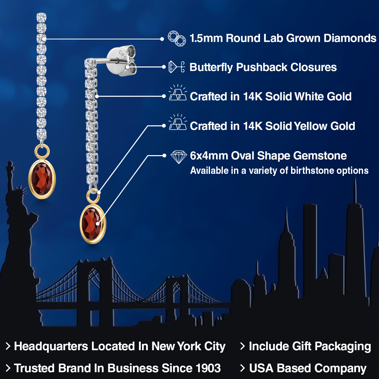 14K Two Tone Gold Gemstone Birthstone and Lab Grown Diamond Long Liner Chain Dangle Earrings for Women | Oval 6X4MM and Round 1.5MM Accents | Gold Chain Drop Earrings