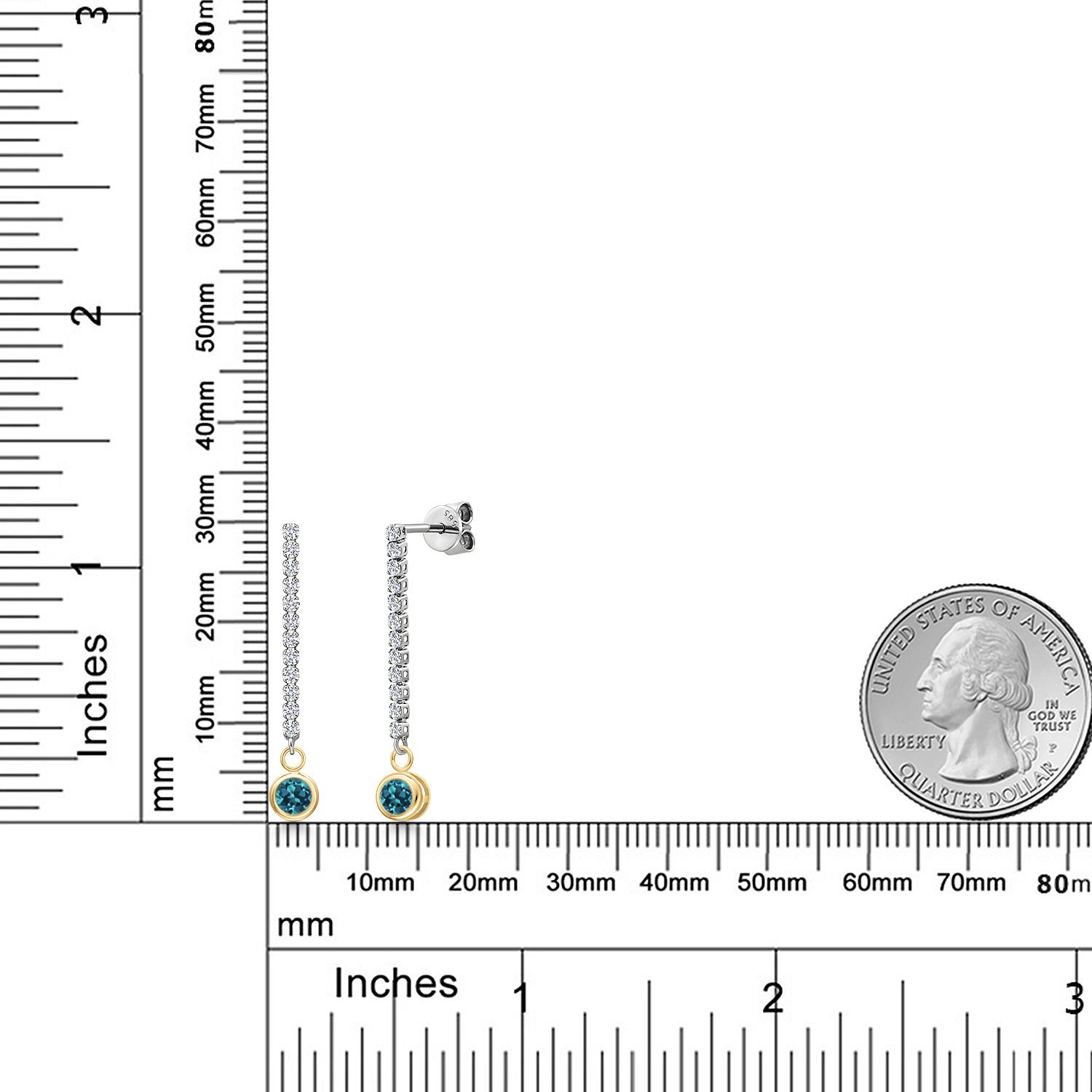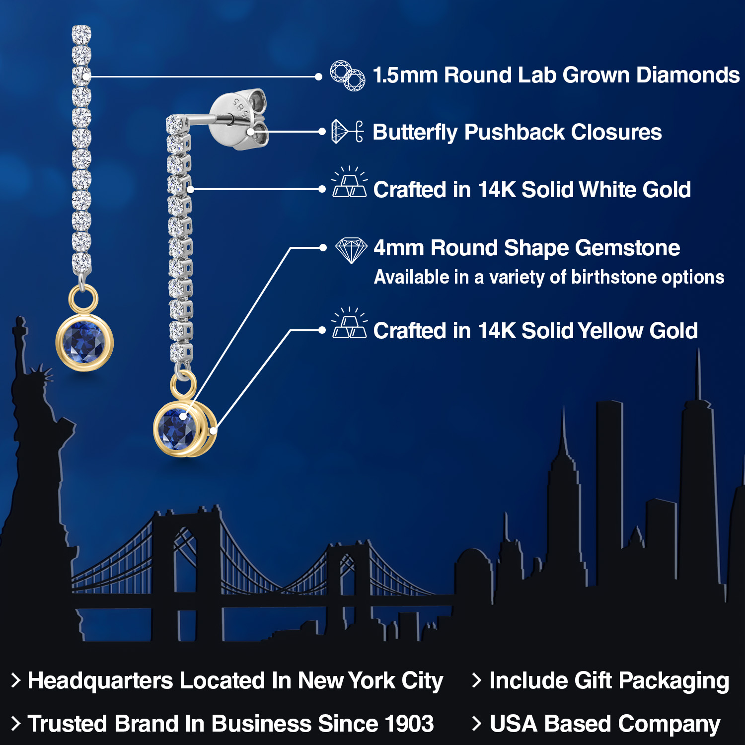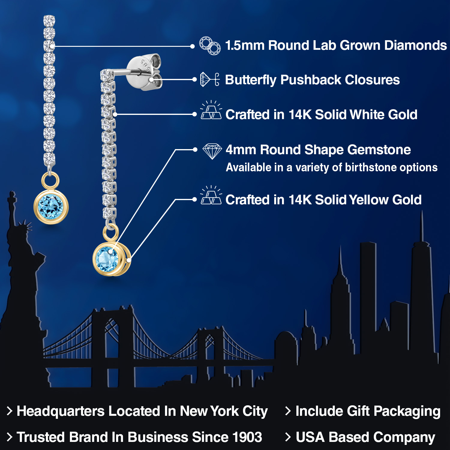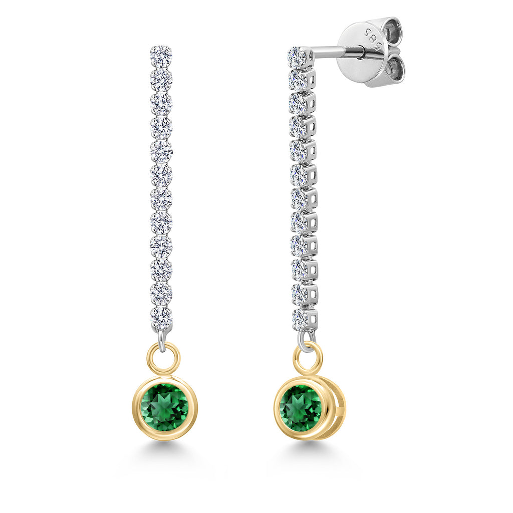 14K Two Tone Gold Gemstone Birthstone and White Lab Grown Diamond Long Liner Dangle Earrings for Women | Round 4MM and 1.5MM | Gold Chain Drop Earrings