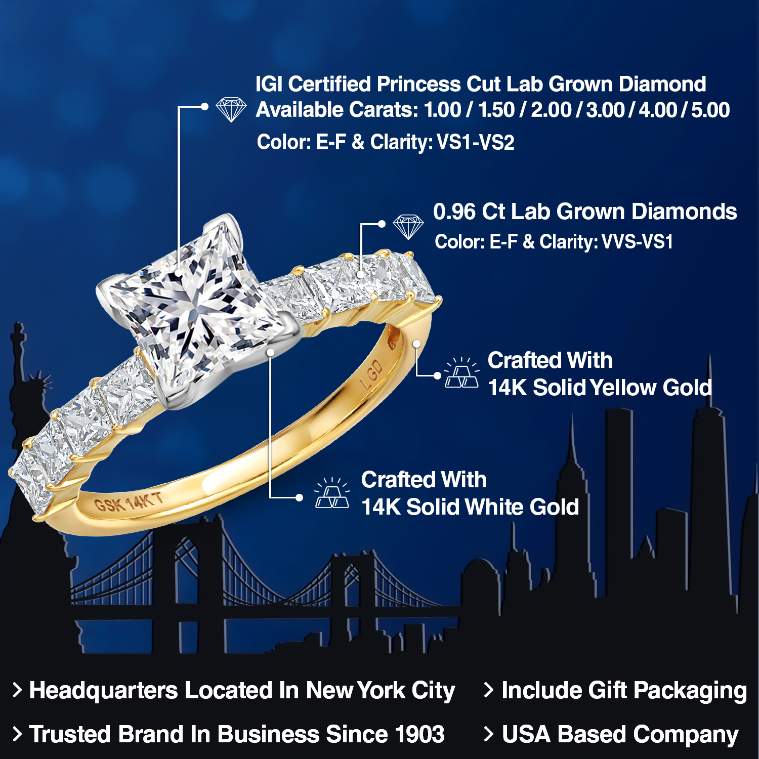 EIGHT DAZZLING SIDE STONES WITH E-F COLOR AND VS1-VS2 CLARITY: The band is adorned with eight 0.12 carat lab-grown diamonds, totaling 0.96 carats. These side stones boast an E-F color grade and virtually flawless VS1-VS2 Clarity, providing unmatched brilliance. Perfectly set along the band, they complement the center diamond beautifully, enhancing the overall elegance of the ring.