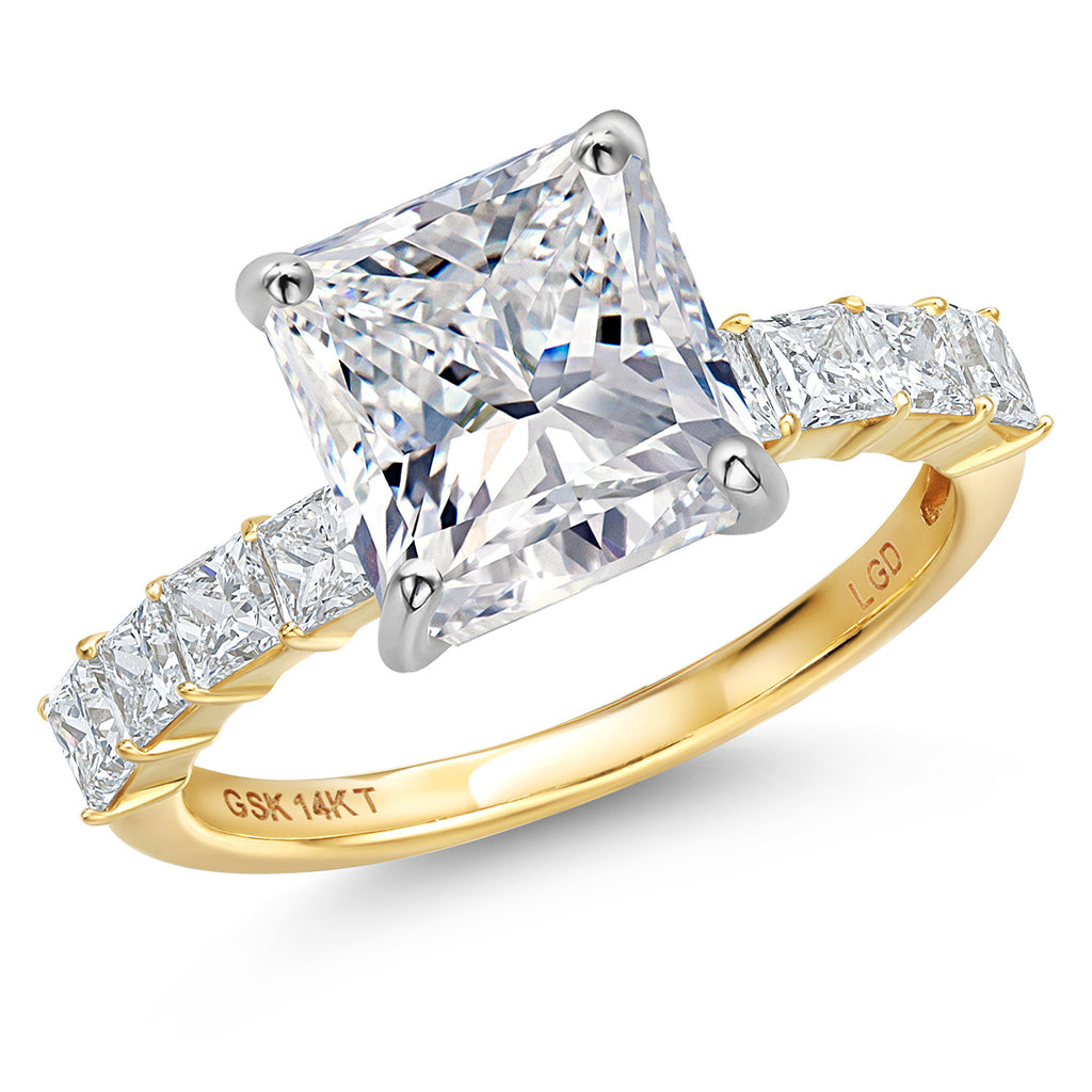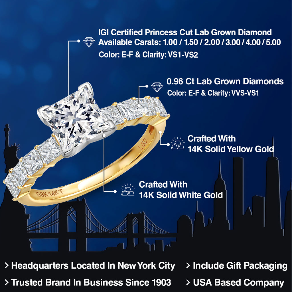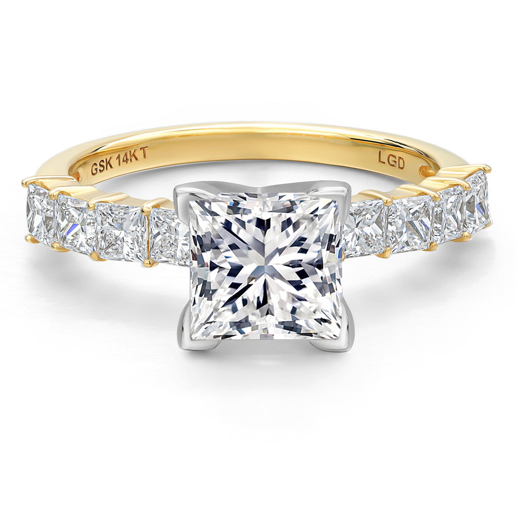 MEASUREMENTS: 7x7mm Princess E - F Lab Grown Diamond, 2.5x2.5mm Princess E - F Lab Grown Diamond. Total Carat Weight is 3.00 cttw