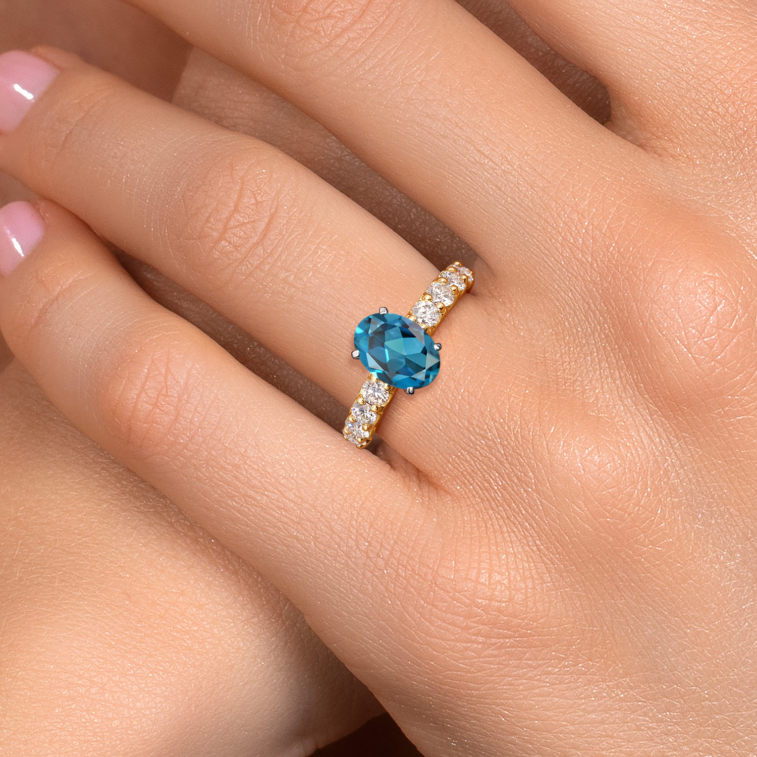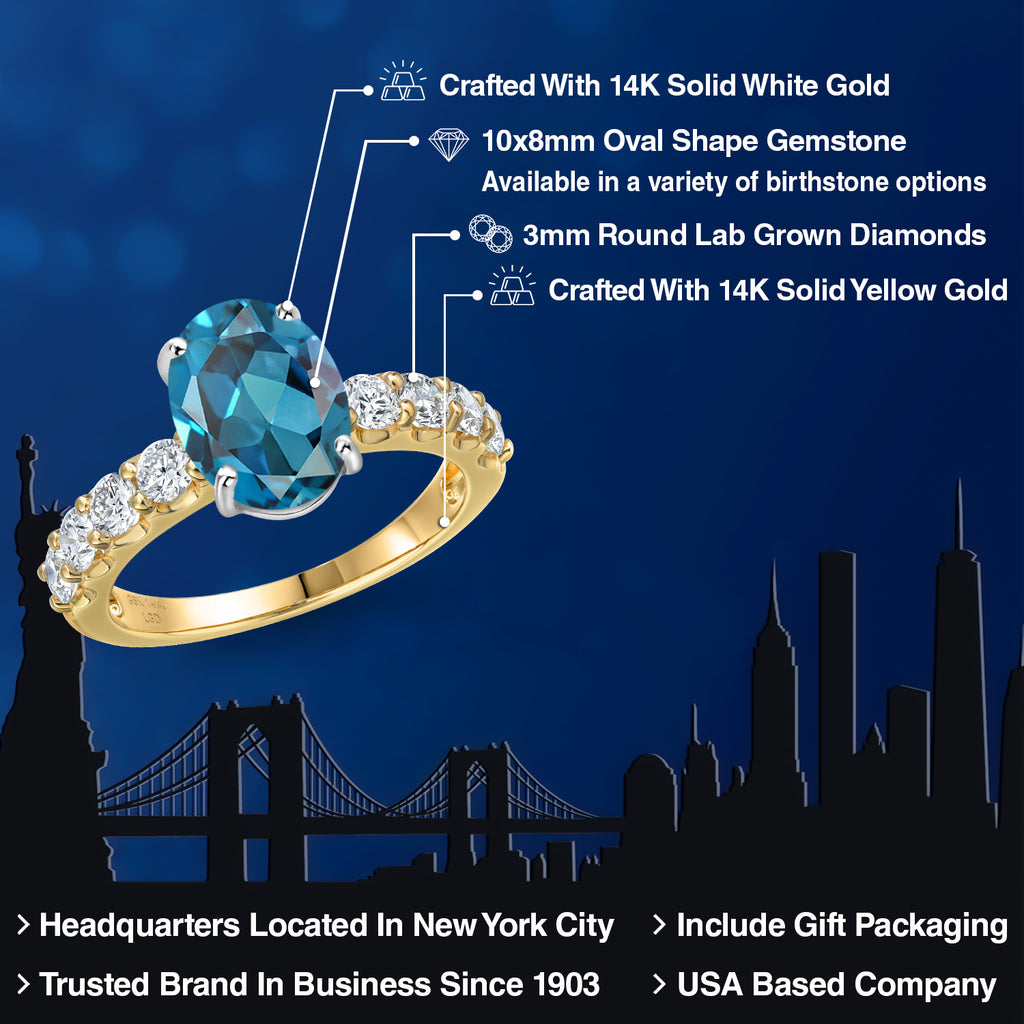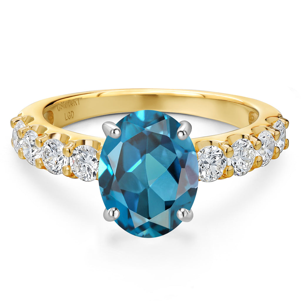 MEASUREMENTS: 10x8mm Oval Irradiated London Blue Topaz, 3x3mm Round E - F Lab Grown Diamond. Total Carat Weight is 3.88 cttw
