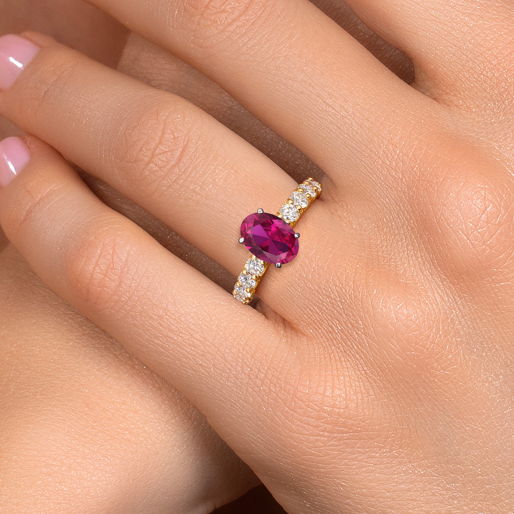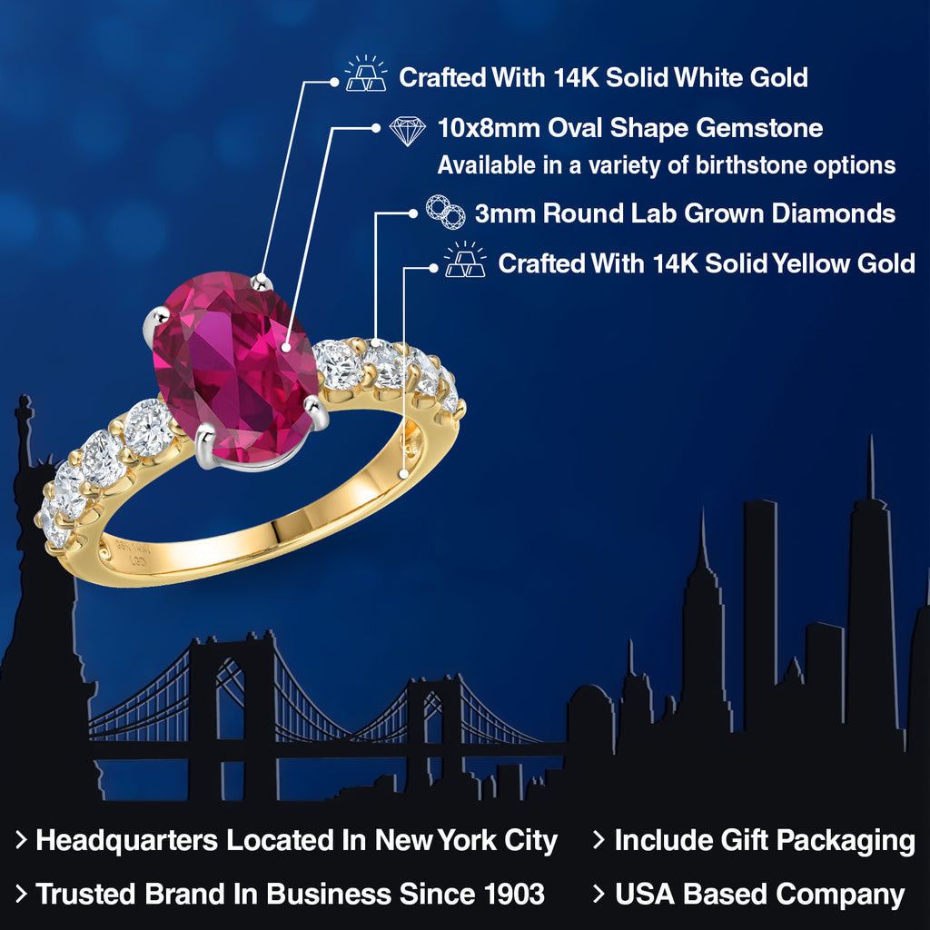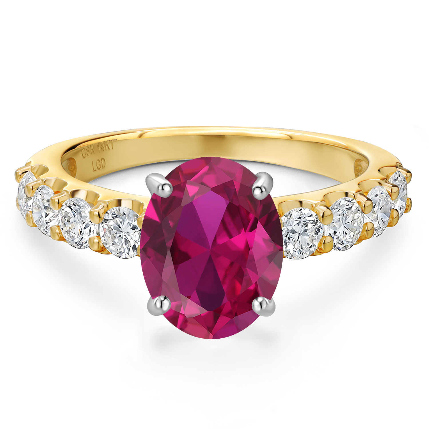 MEASUREMENTS: 10x8mm Oval Heat-Treated Red Created Ruby, 3x3mm Round E - F Lab Grown Diamond. Total Carat Weight is 3.88 cttw