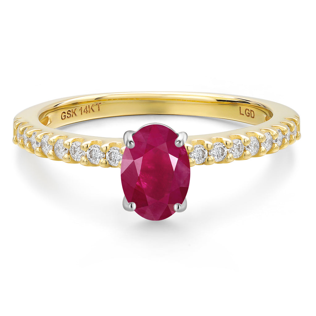 MEASUREMENTS: 7x5mm Oval Heat-Treated Red Ruby, 1.3x1.3mm Round E - F Lab Grown Diamond. Total Carat Weight is 1.16 cttw