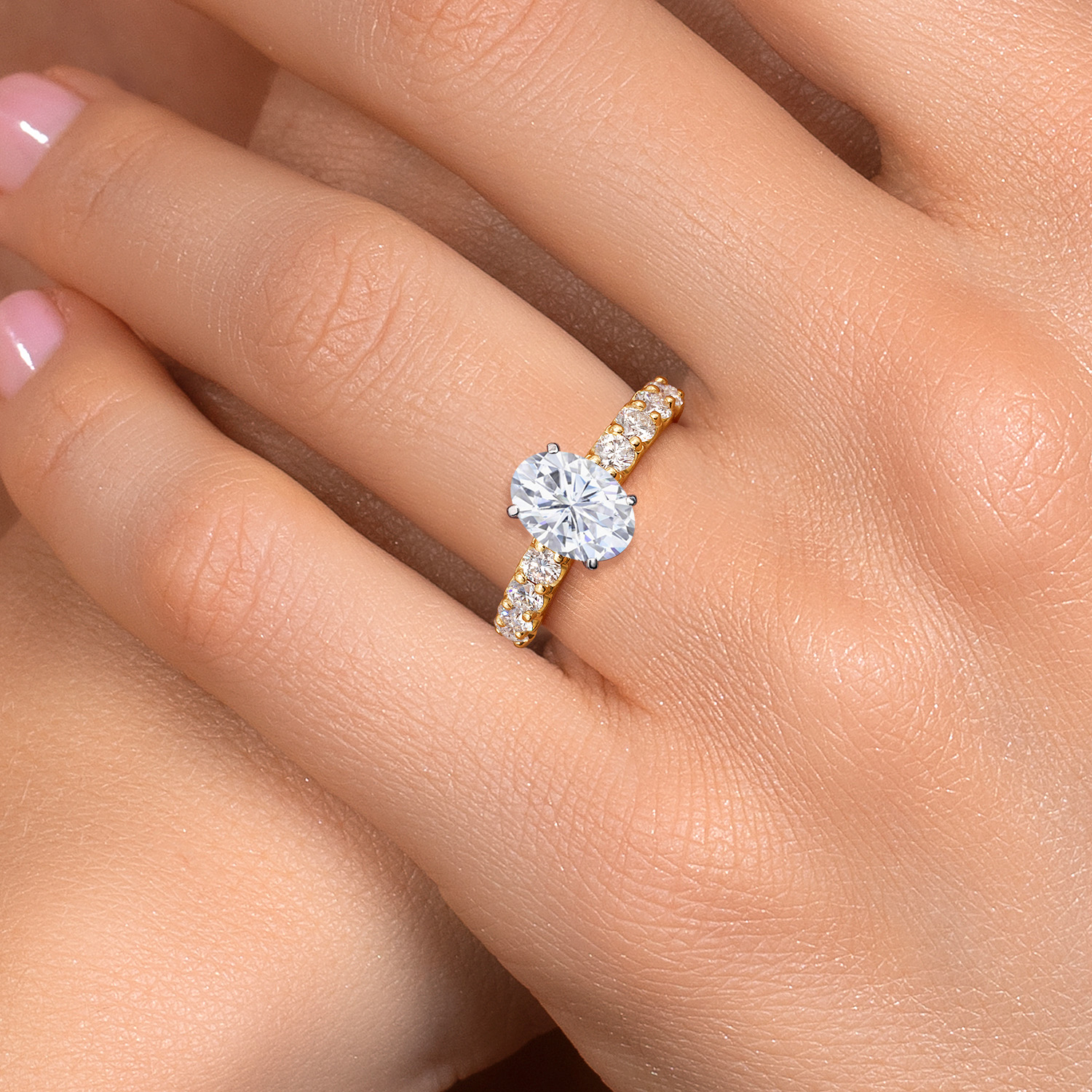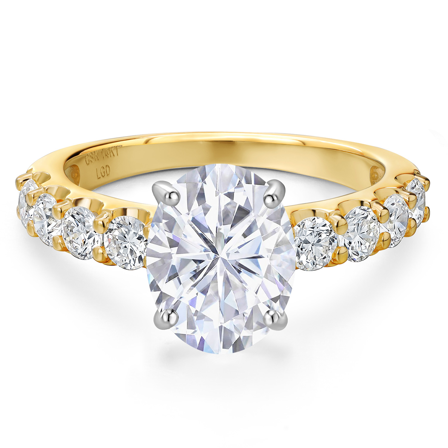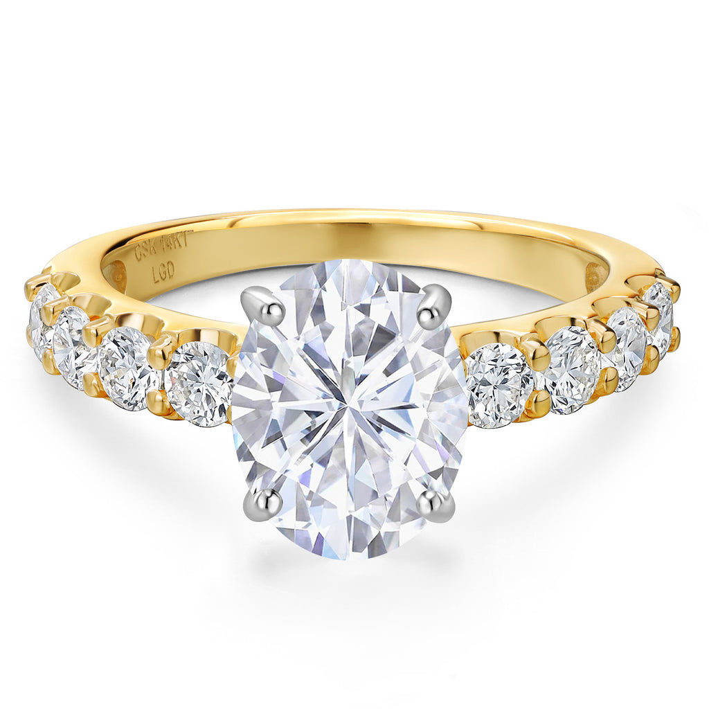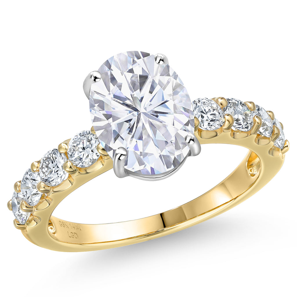 MEASUREMENTS: 10x8mm Oval Near Colorless (GH) Moissanite, 3x3mm Round E - F Lab Grown Diamond. Total Carat Weight is 3.88 cttw