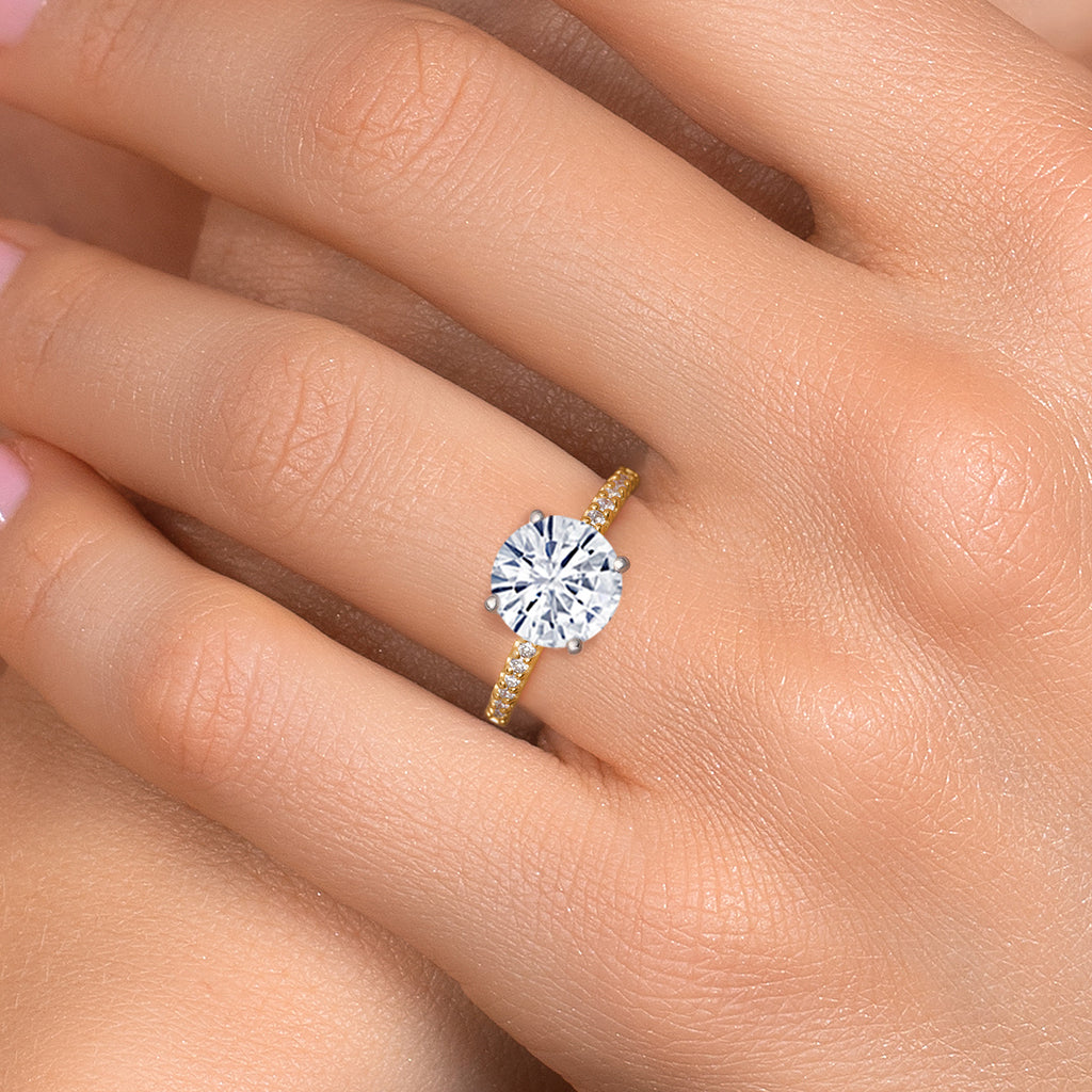 ROUND MOISSANITE & DIAMOND BRILLIANCE: Features a bold 10mm round white moissanite accented by sparkling lab grown diamonds, totaling 4.16 carats. The bright white fire and clarity create a radiant centerpiece symbolizing everlasting love and commitment.