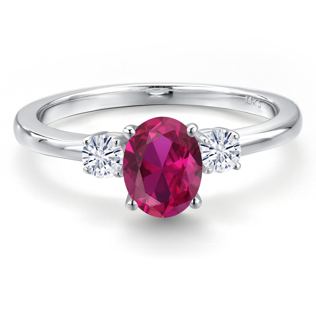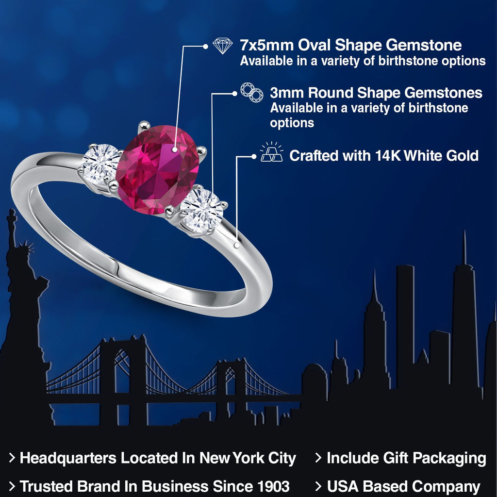 14K White Gold 7X5MM Oval Gemstone Birthstone and White Moissanite 3-Stone Engagement Ring | Three Stone Wedding Anniversary Promise Gold Ring For Women | Available In Size 5-9
