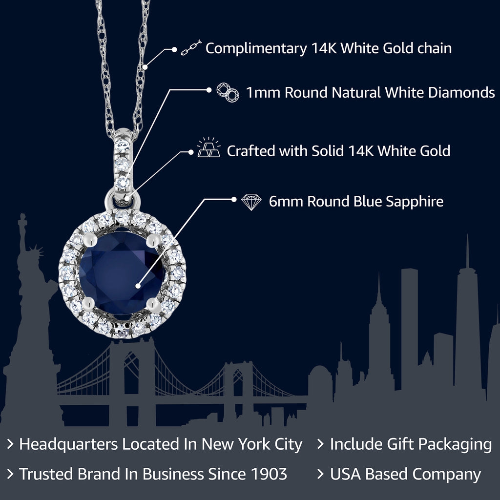 EXQUISITE DESIGN: This pendant necklace features a stunning round-cut 6mm blue sapphire gemstone, surrounded by a halo of sparkling diamonds, all set in 14K white gold. The design exudes elegance and showcases a timeless combination of blue and white that will make a statement.