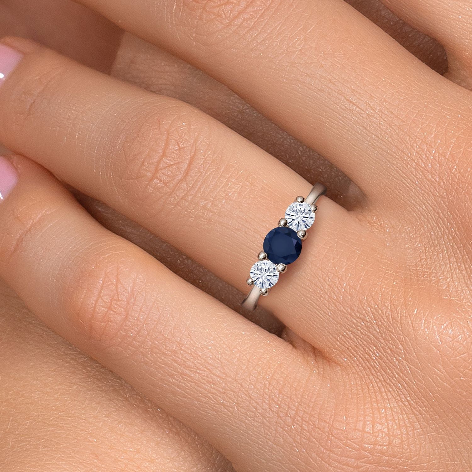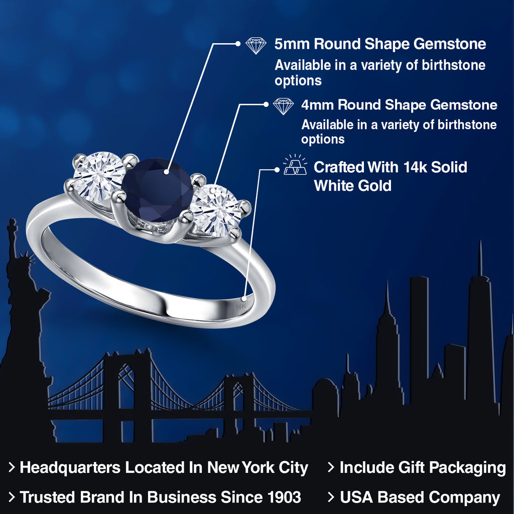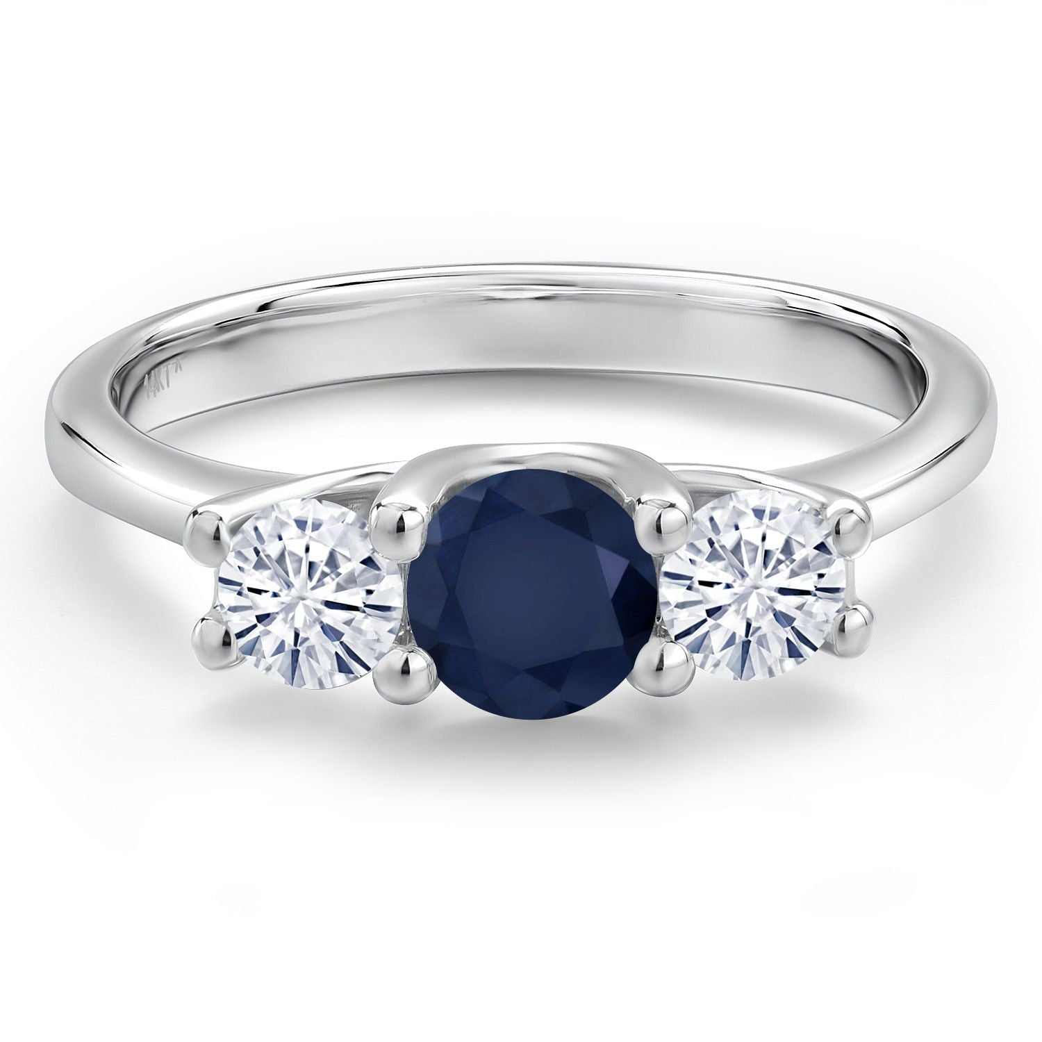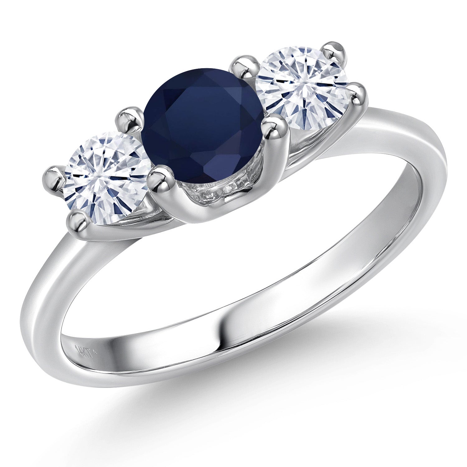 14K White Gold Blue Sapphire & White Moissanite 3-Stone Engagement Ring | 1.06 Cttw | Round 5MM and 4MM | Three Stone Wedding Anniversary Promise Ring For Women
