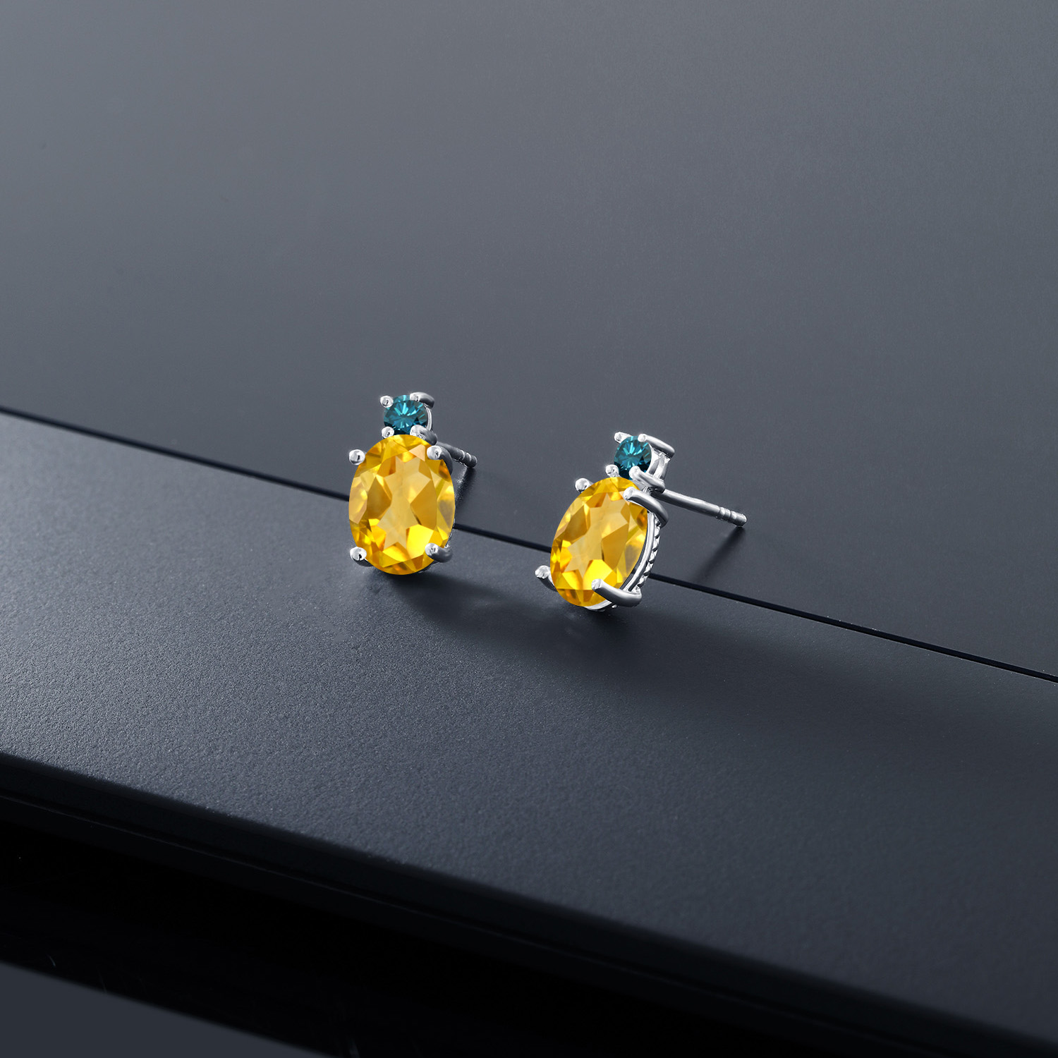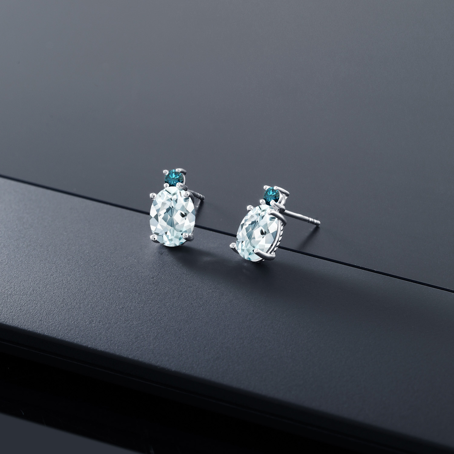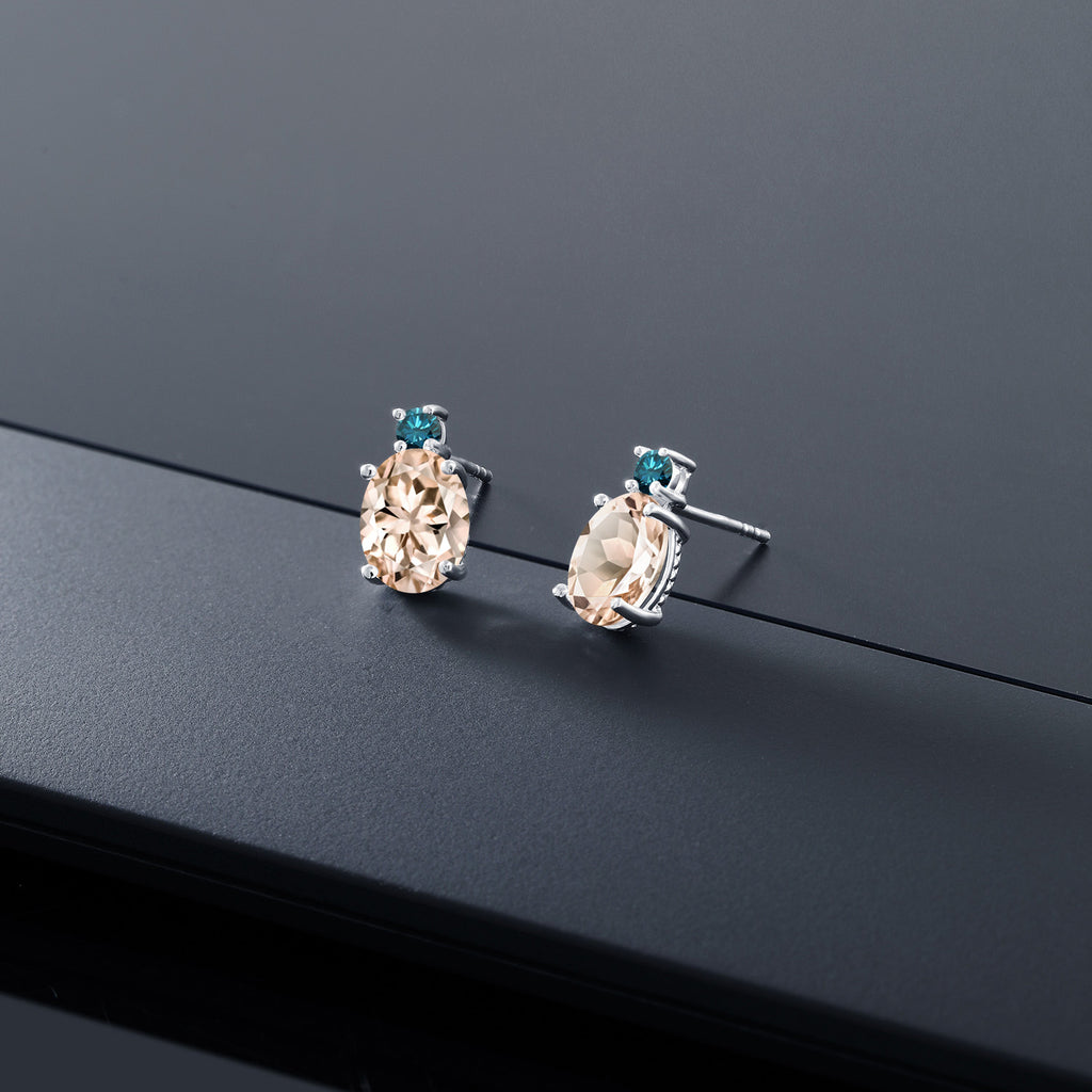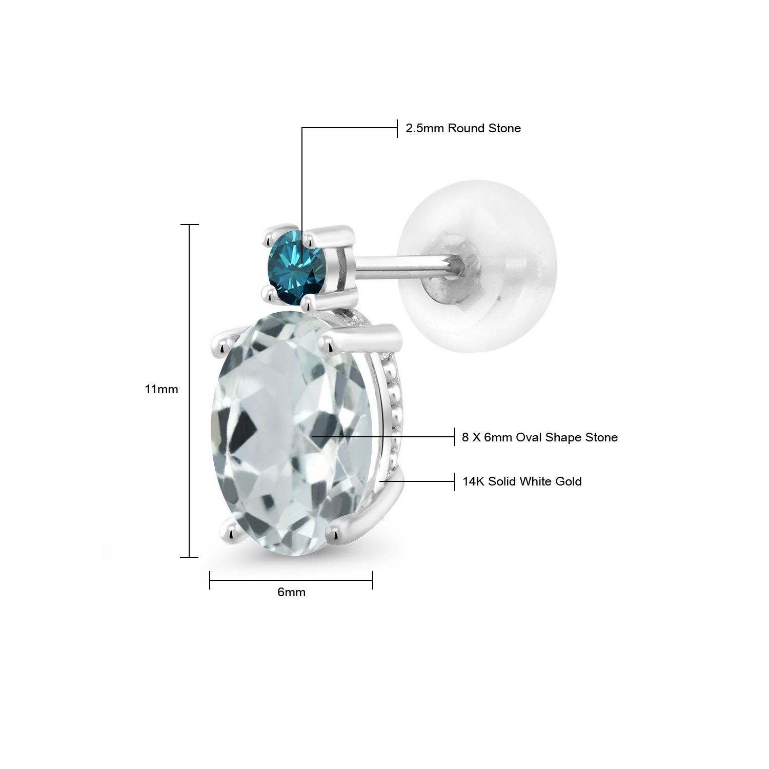14K White Gold Gemstone Birthstone and Blue Diamond Stud Earrings For Women | Oval 8X6MM | Round 2.5MM | Elegant Two-Stone Design | Classic Fine Jewelry Earrings