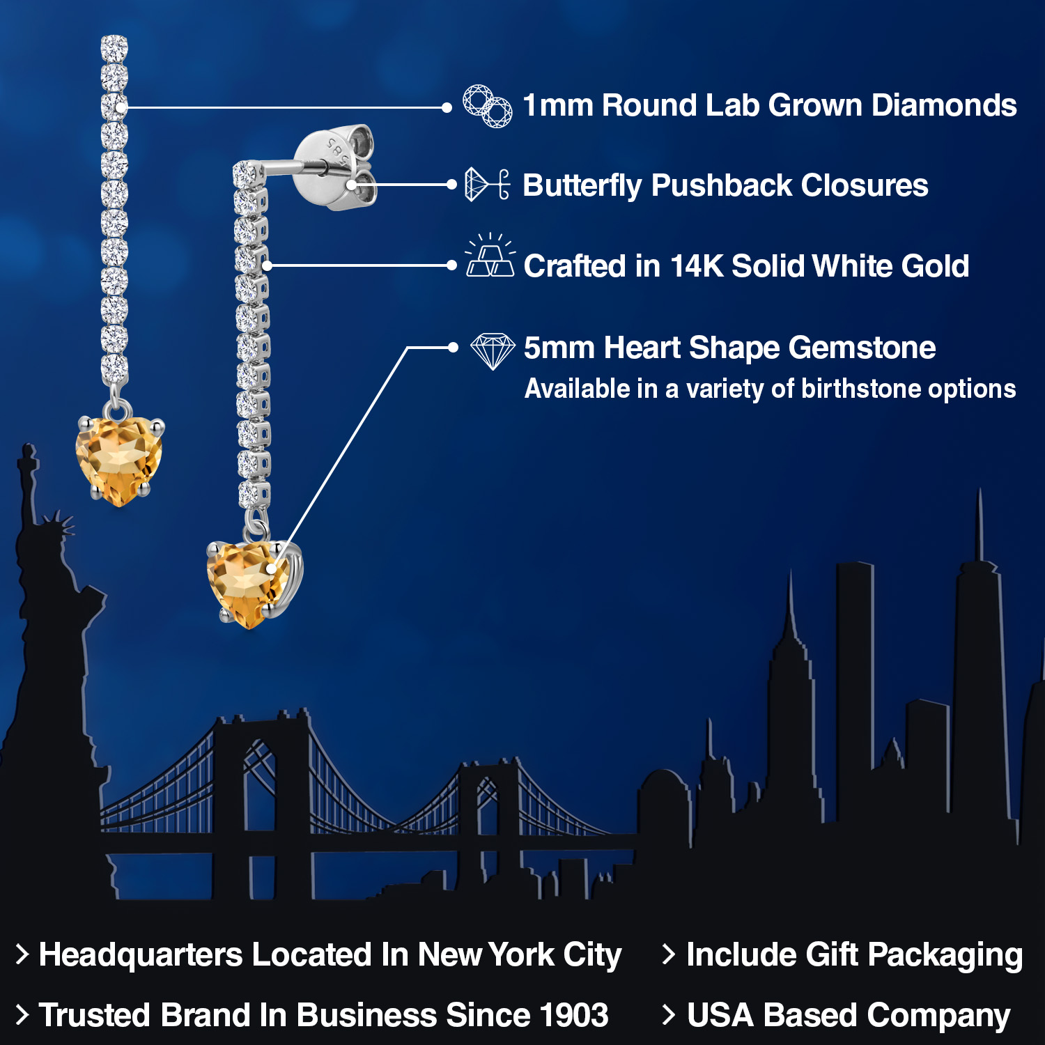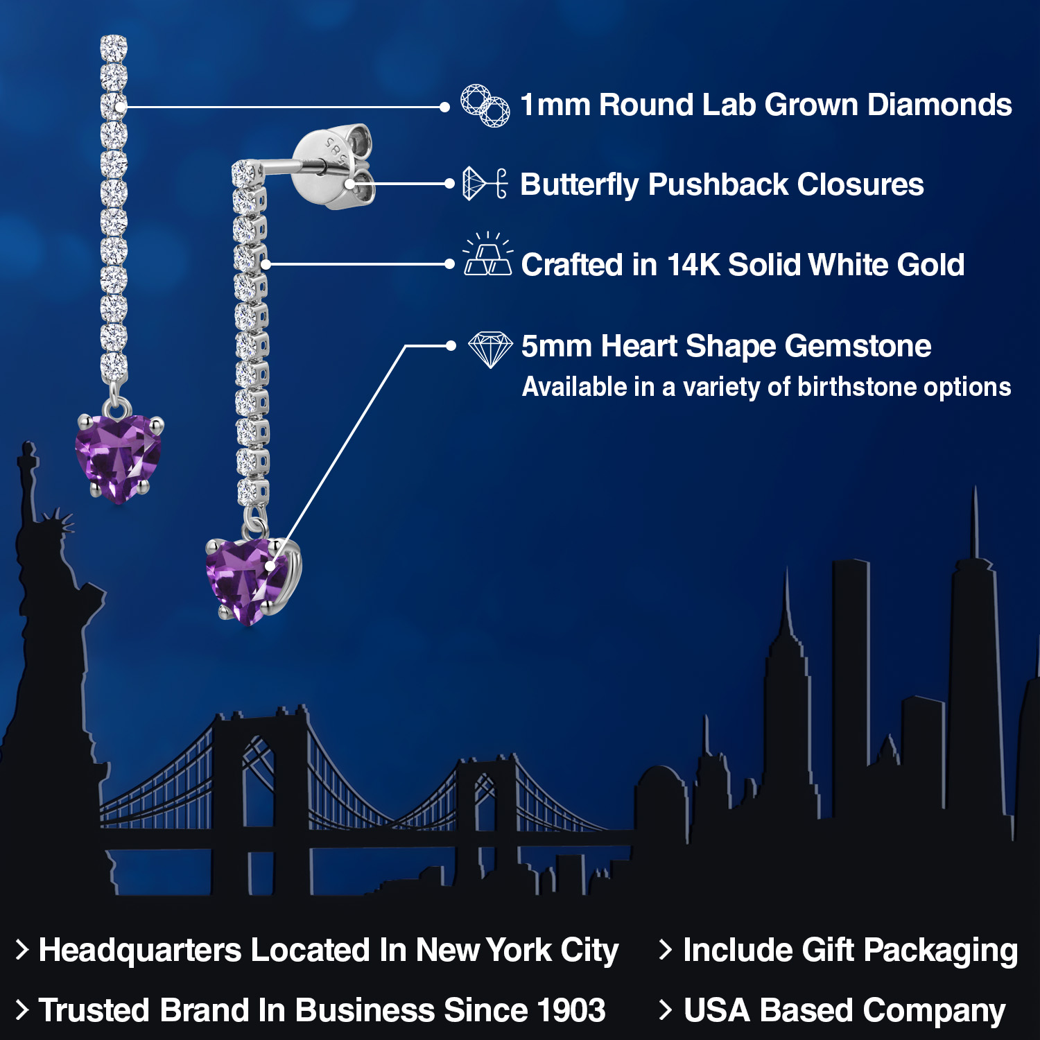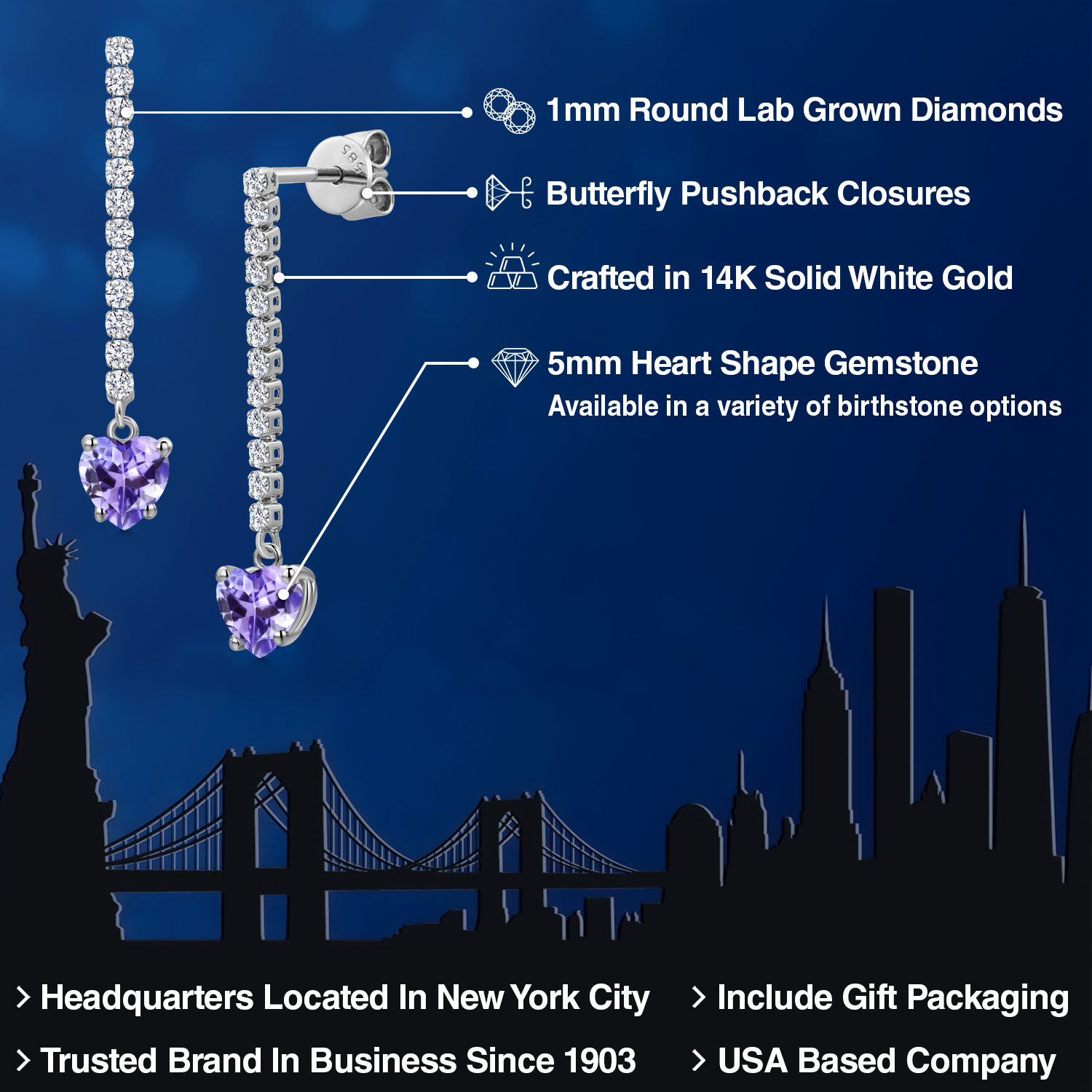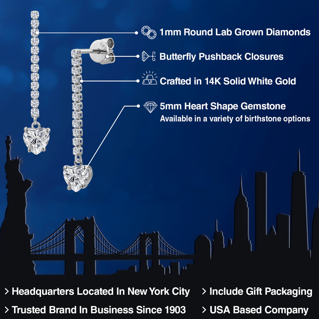 14K White Gold Gemstone Birthstone and Lab Grown Diamond Long Liner Dangle Earrings for Women | Heart Shape 5MM and Round 1.5MM | White Gold Chain Drop Earrings
