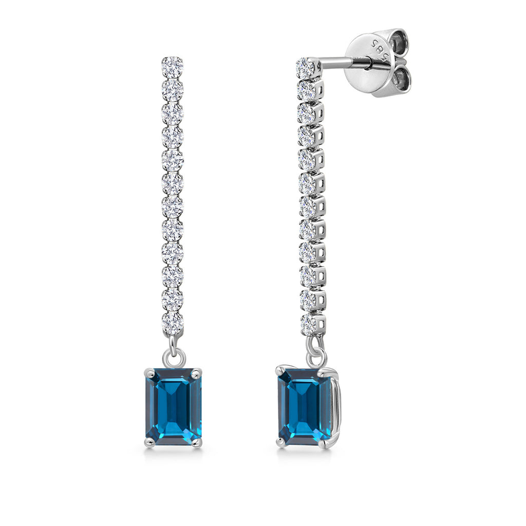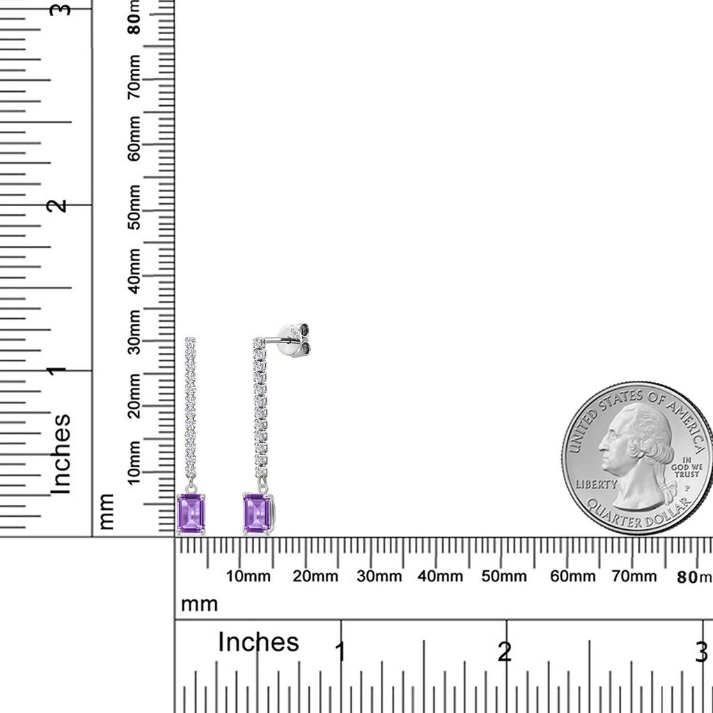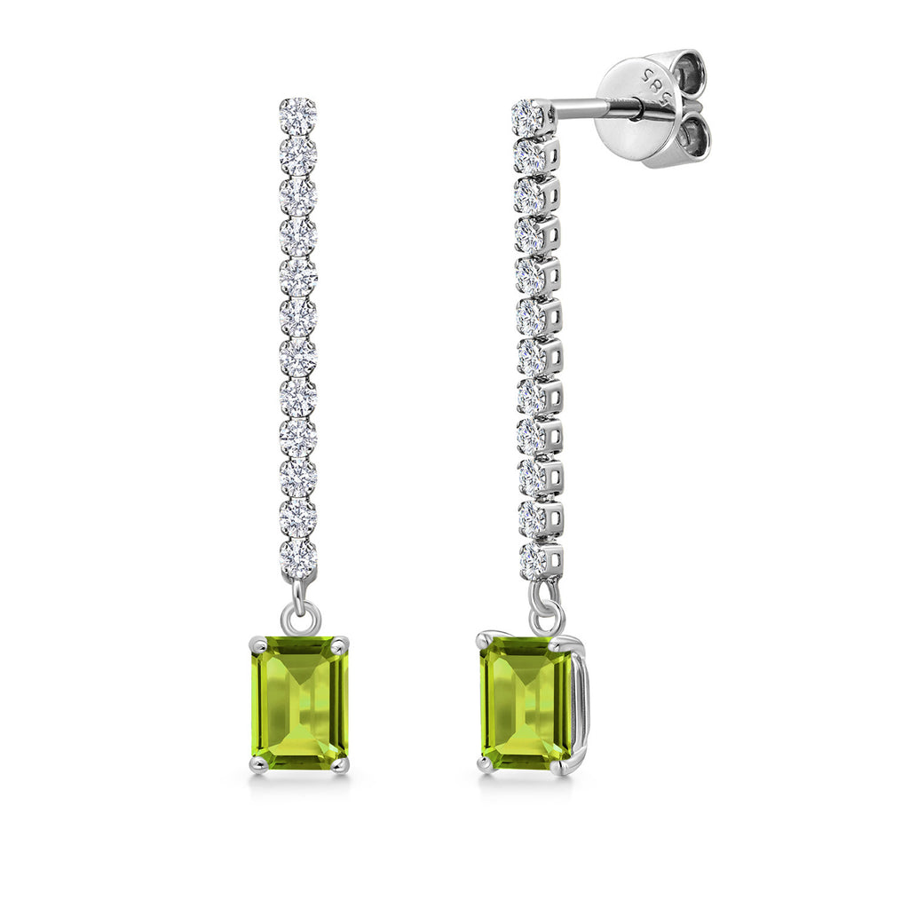 14K White Gold Gemstone Birthstone and White Lab Grown Diamond Long Liner Dangle Earrings for Women | Emerald Cut 6X4MM | White Gold Chain Drop Earrings