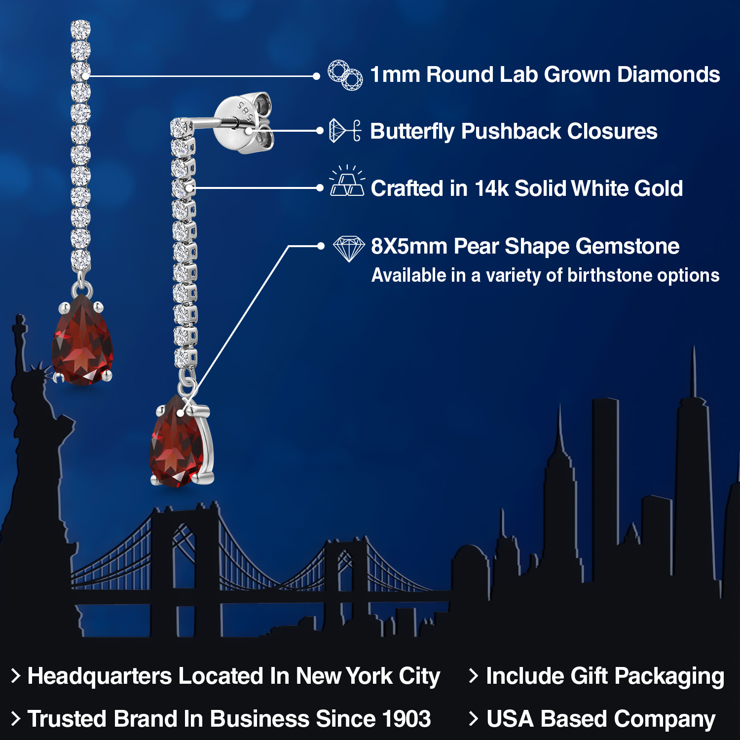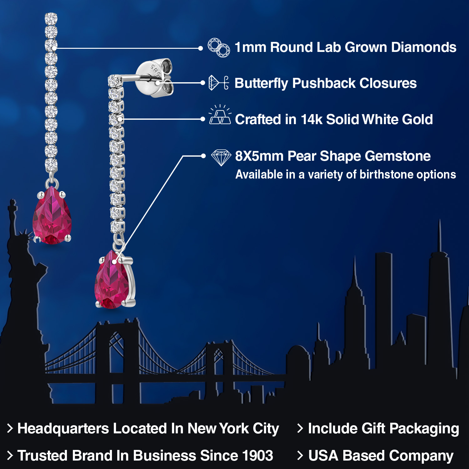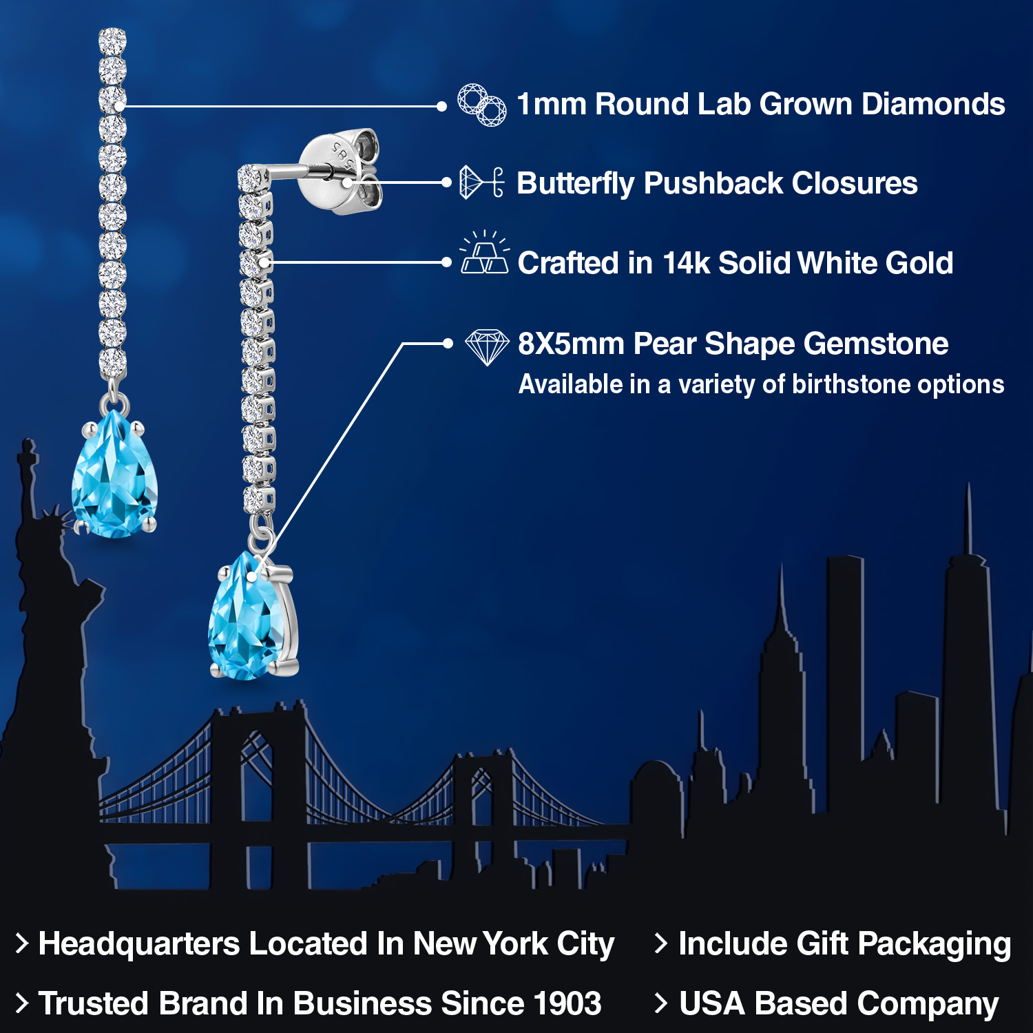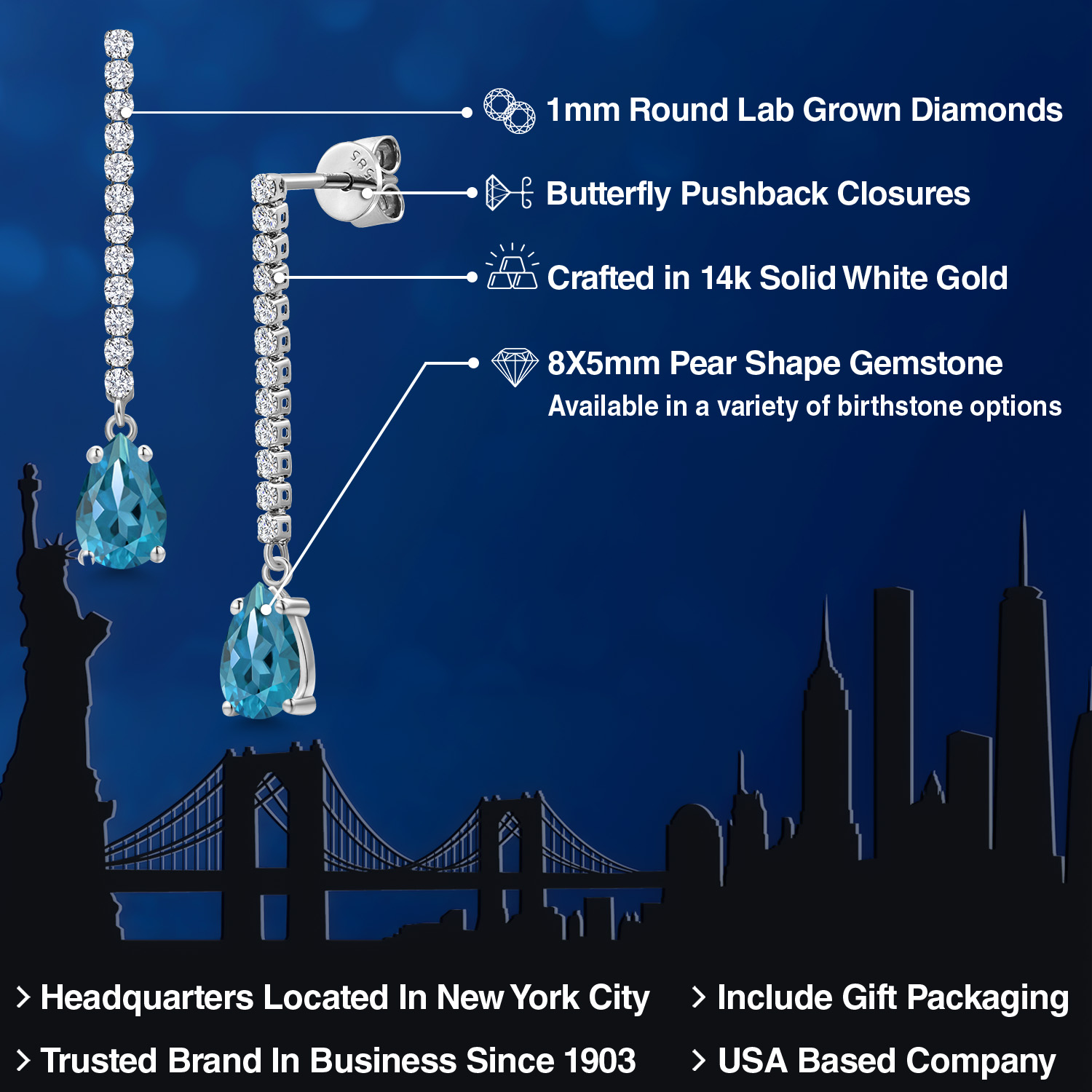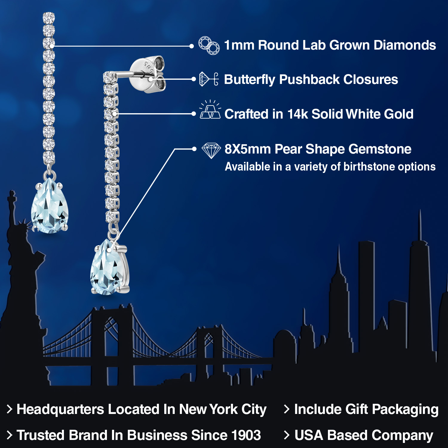 14K White Gold Gemstone Birthstone and White Lab Grown Diamond Long Liner Teardrop Dangle Earrings for Women | Pear Shape 8X5MM | White Gold Chain Drop Earrings