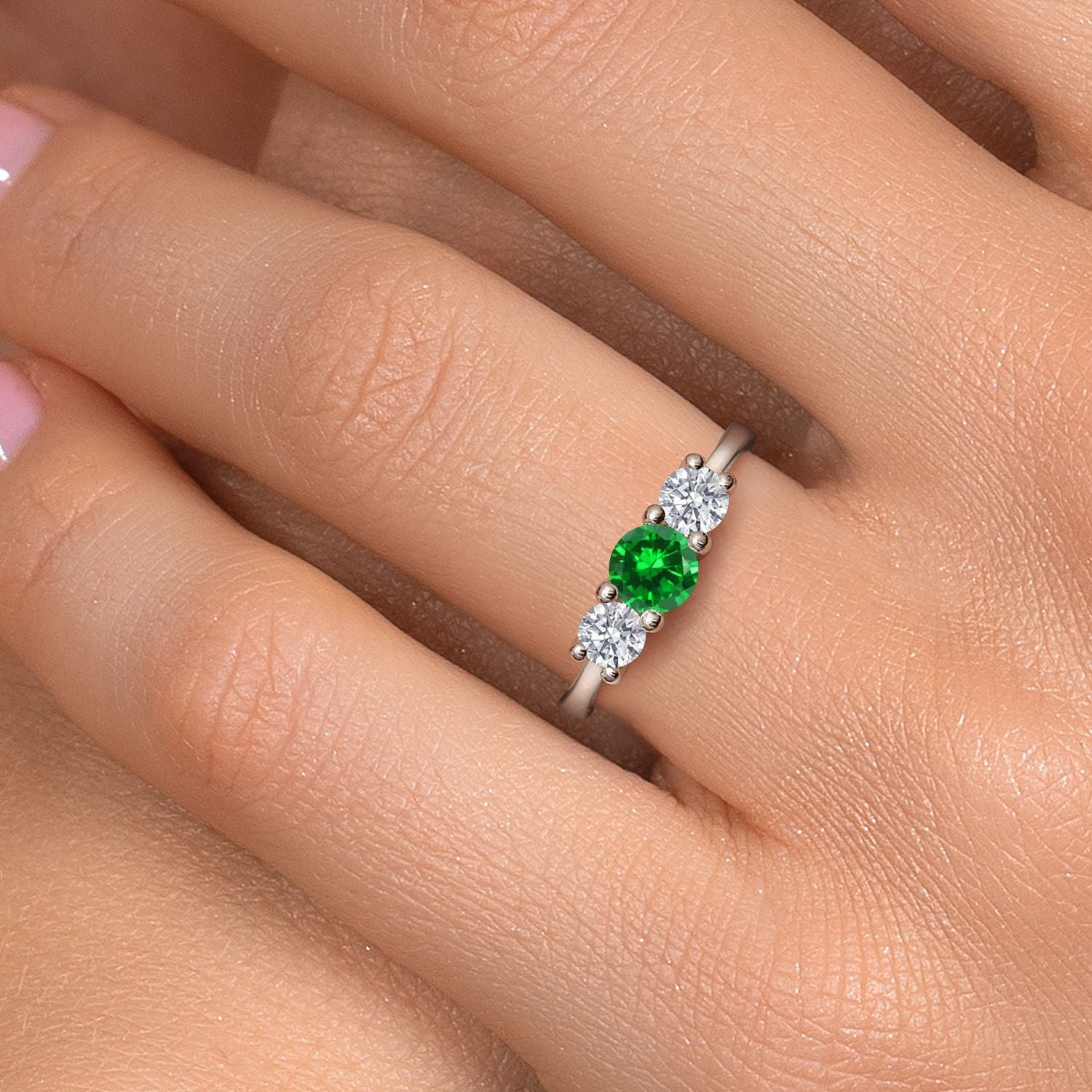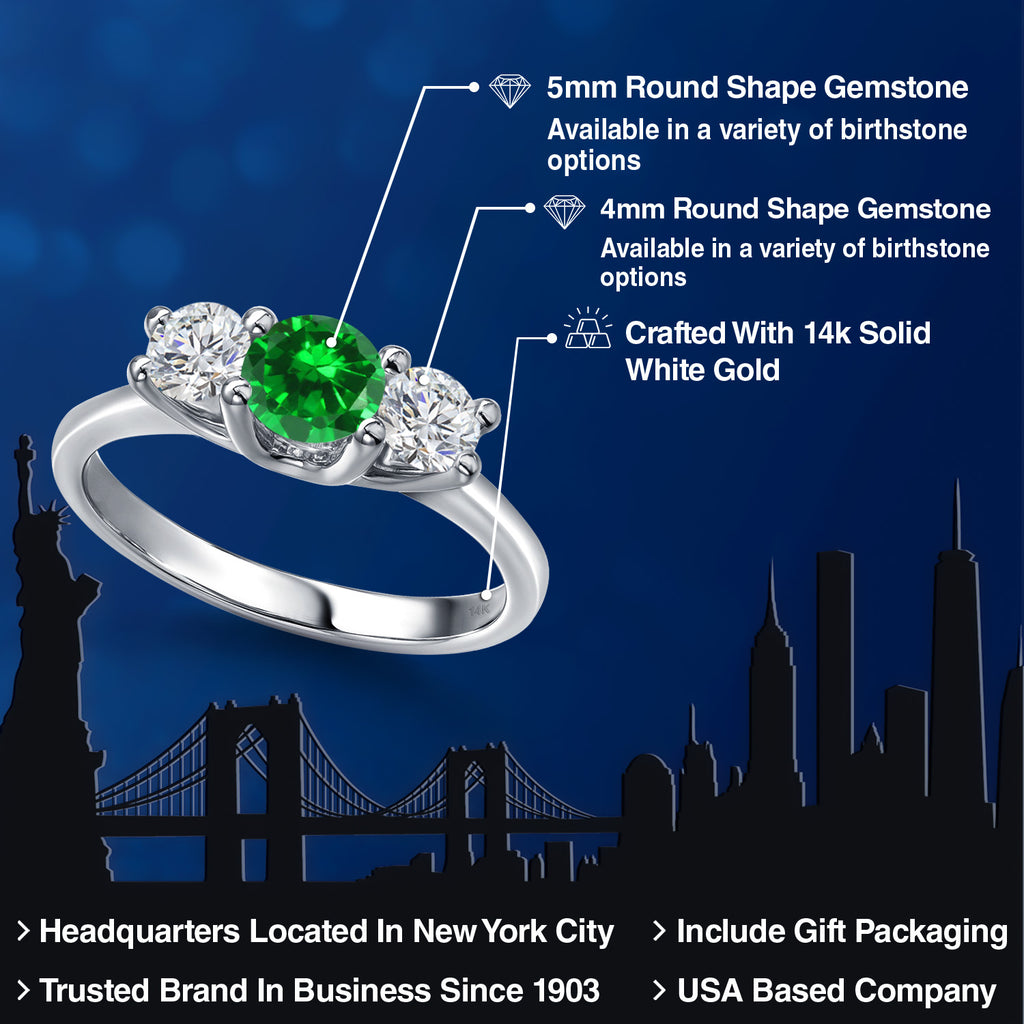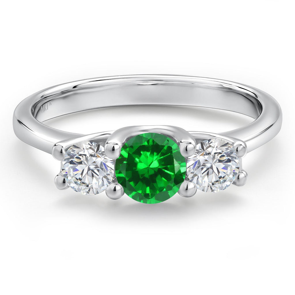 14K White Gold Green Created Emerald & White Lab Grown Diamond 3-Stone Engagement Ring | 1.38 Cttw | Round 5MM and 4MM | Three Stone Wedding Anniversary Promise Ring For Women