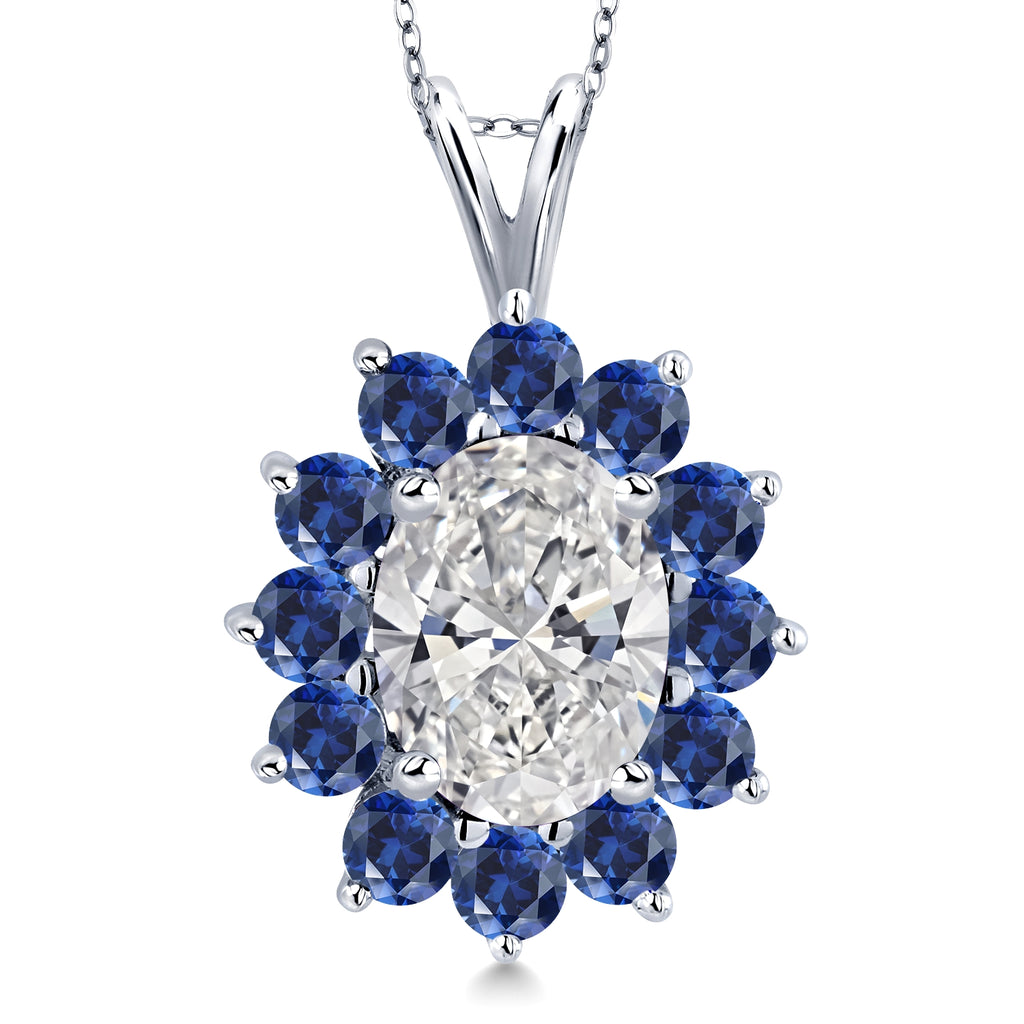 14K White Gold IGI Certified Lab Grown Diamond and Created Sapphire Pendant Necklace For Women | 2.22 Cttw | Center Oval 1.5 Ct Diamond E-F Color | VS1-VS2 Clarity | 18 Inch Chain