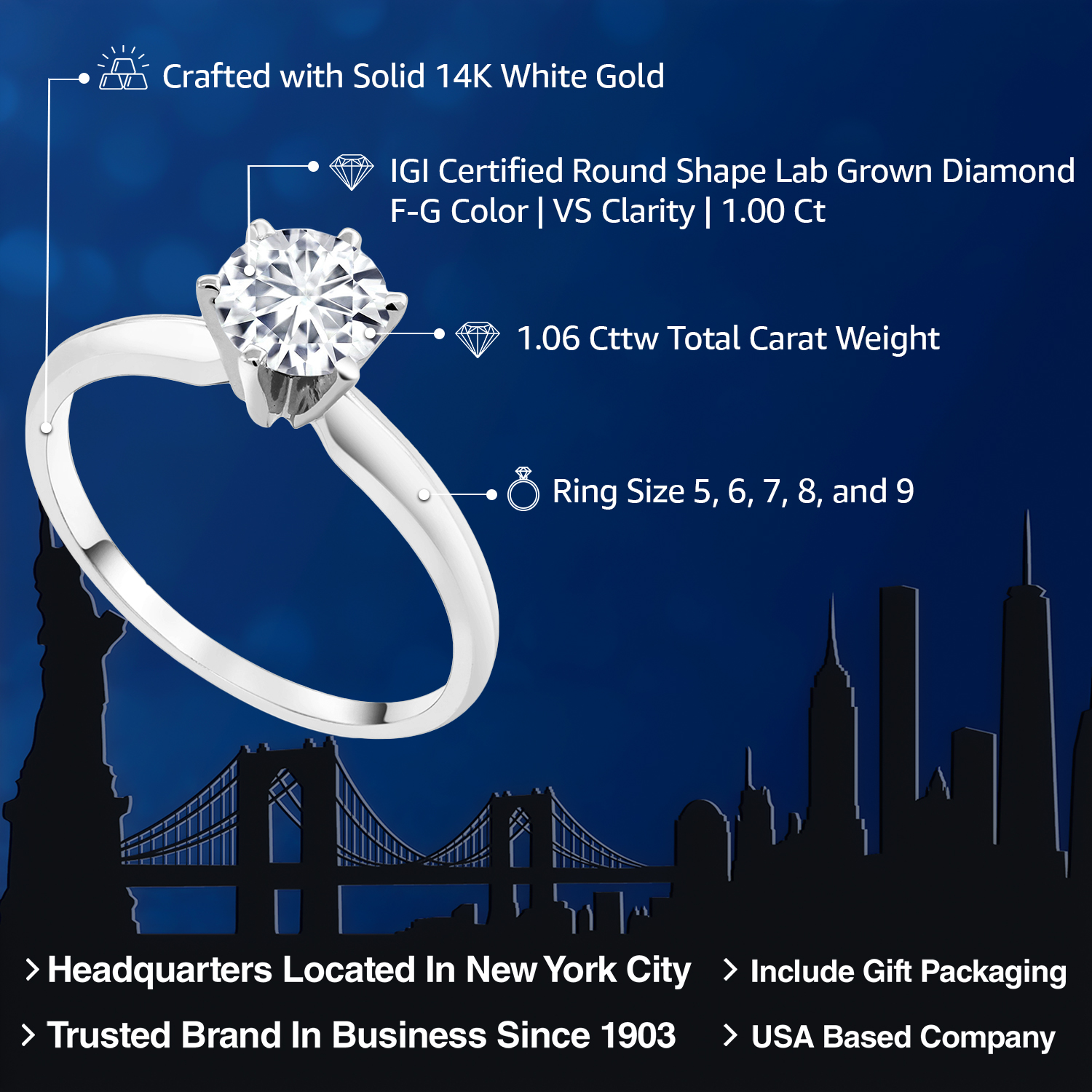 ELEGANT LAB GROWN DIAMOND DESIGN: This exquisite solitaire engagement ring features a brilliant 1.00 carat round-cut Lab Grown Diamond, IGI certified for authenticity. The F-G color and VS clarity ensure remarkable brilliance and fire.