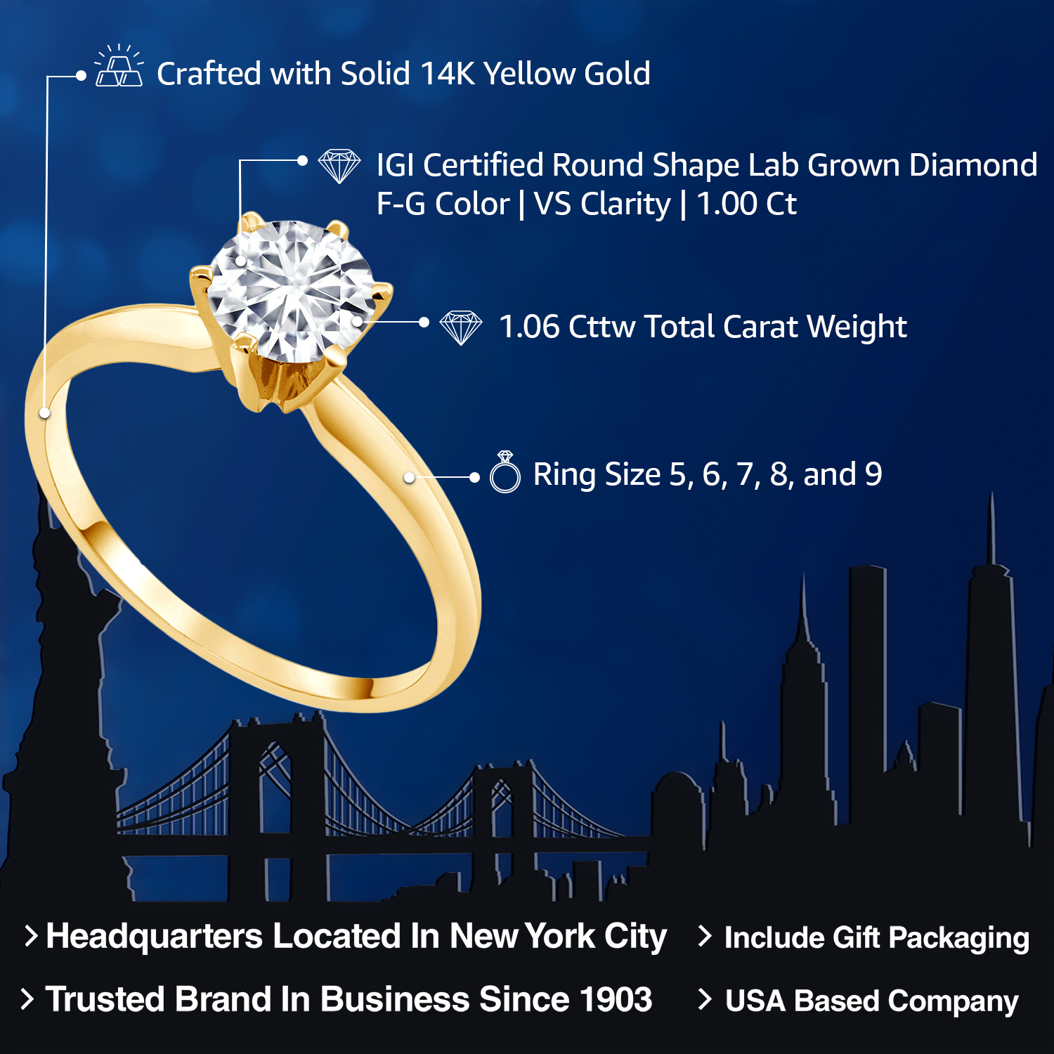 14K Gold Round Cut Lab Grown Diamond Solitaire Engagement Ring For Women | 1.00 Carat | F-G Color | VS Clarity | IGI Certified | Anniversary Promise Gold Ring