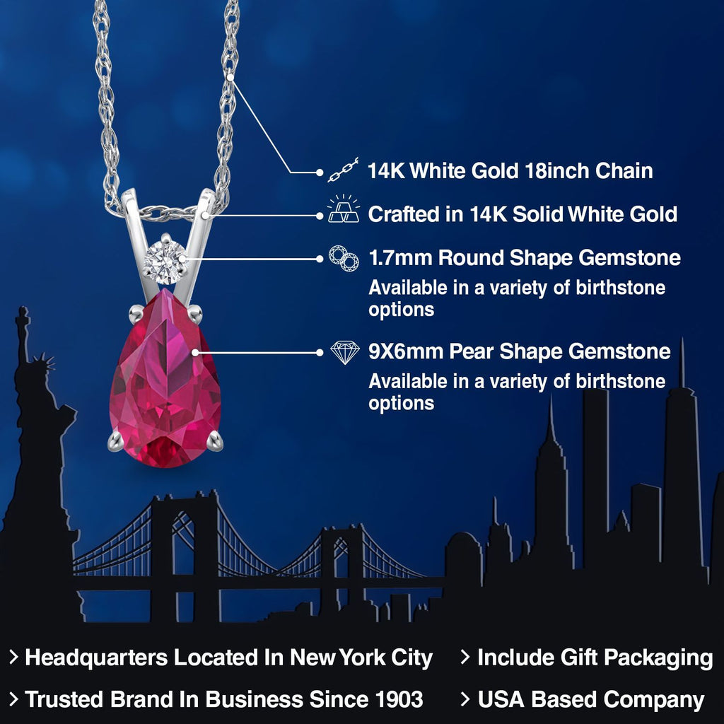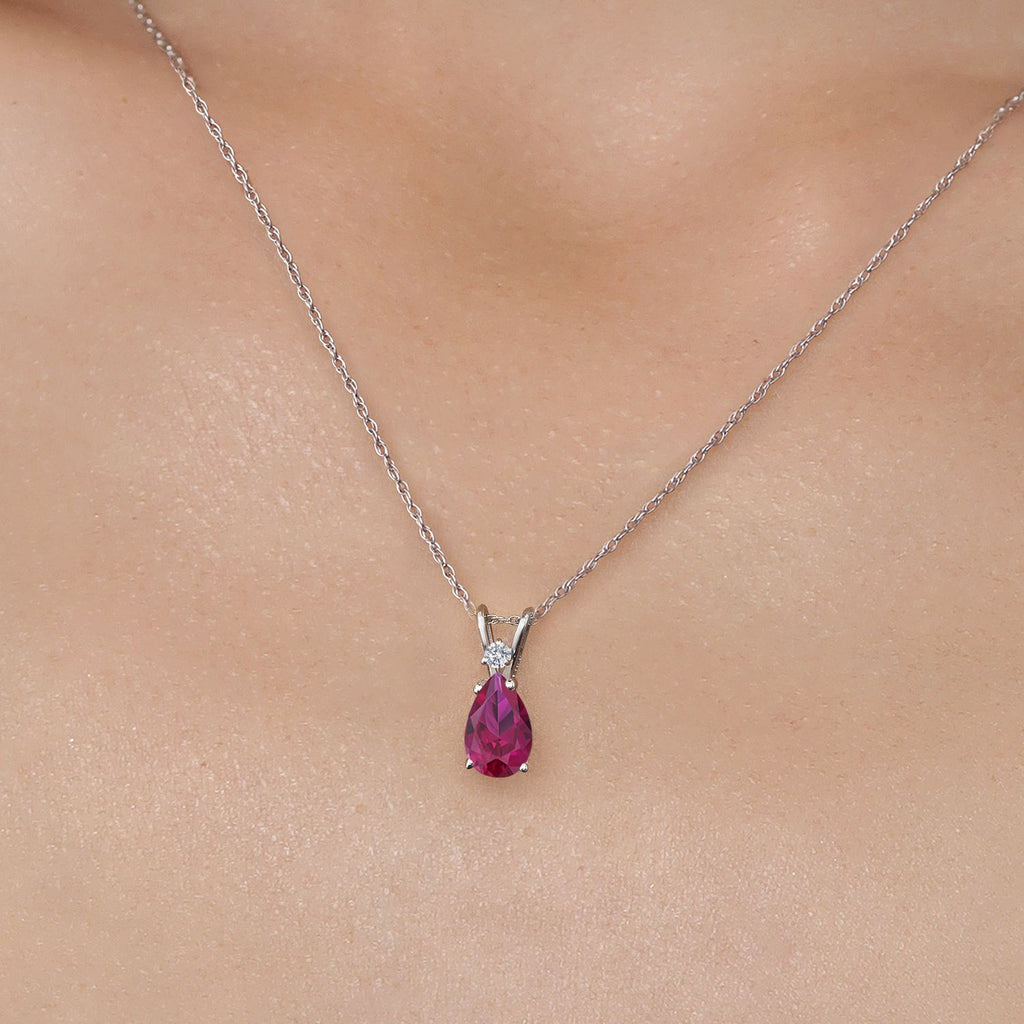 14K White Gold Red Created Ruby and Lab Grown Diamond Pendant Necklace for Women | 1.49 Cttw | Gemstone July Birthstone | Pear Shape 9X6MM | With 18 Inch Chain