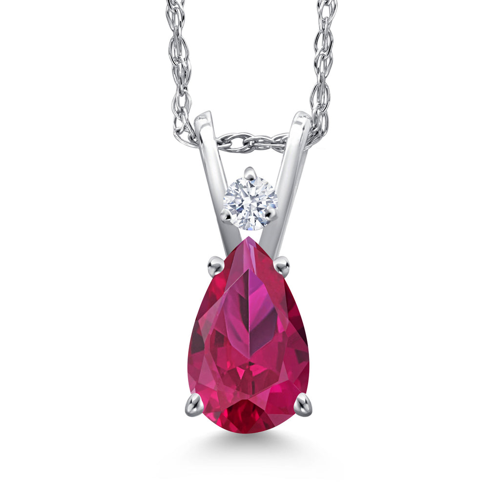 14K White Gold Red Created Ruby and White Zirconia Pendant Necklace for Women | 1.03 Cttw | Gemstone July Birthstone | Pear Shape 7X5MM | With 18 Inch Chain