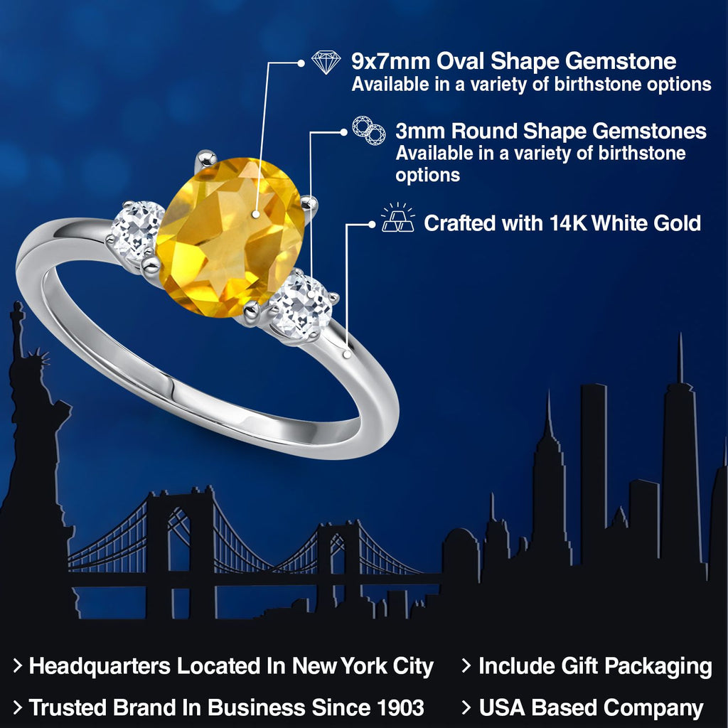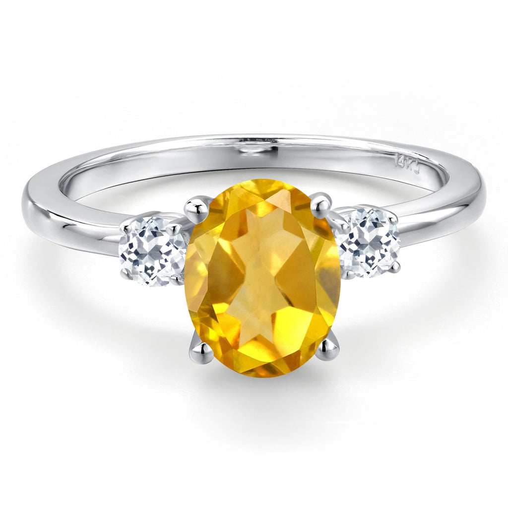 14K White Gold Yellow Citrine and White Topaz 3-Stone Engagement Ring For Women | 1.78 Cttw | Oval 9X7MM | Gemstone Birthstone | Three Stone Wedding Engagement Anniversary Ring