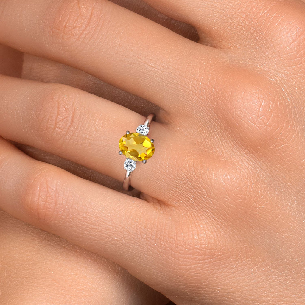 THREE-STONE CITRINE AND TOPAZ DESIGN: Features a 9x7mm oval heat-treated yellow citrine flanked by 3mm round white topaz stones, totaling 1.78 carats. The sunny citrine symbolizes joy and positivity, beautifully complemented by topaz brilliance.