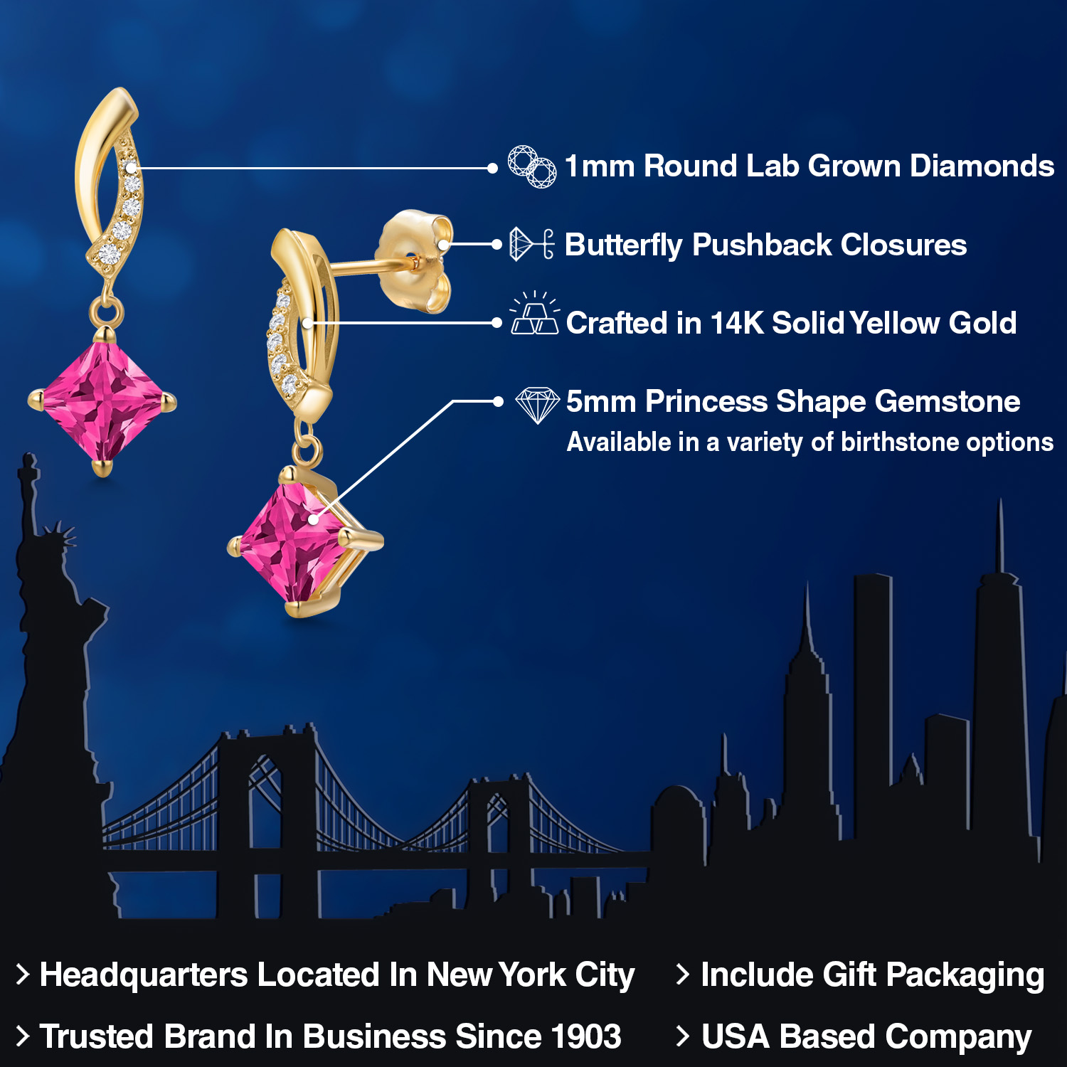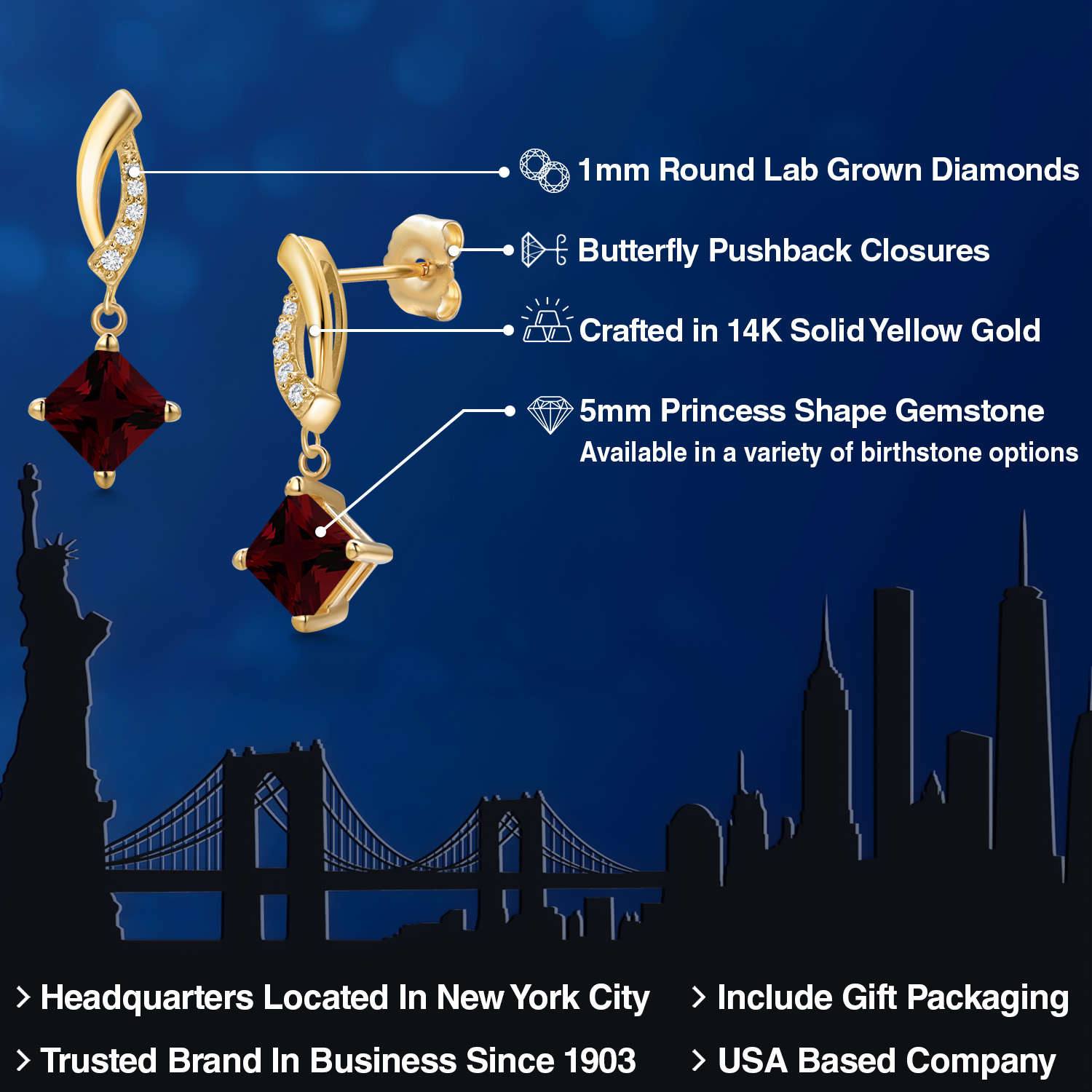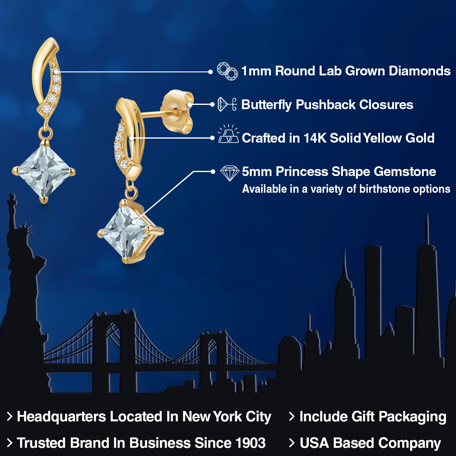 EXQUISITE 5MM PRINCESS GEMSTONE: Nestled in an elegant setting of 14K yellow gold, this alluring earring features a 5MM princess cut gemstone. Available in a variety of birthstone options, the stone's unique shape exudes a regal elegance, shimmering brilliantly from every angle to reflect your individuality.