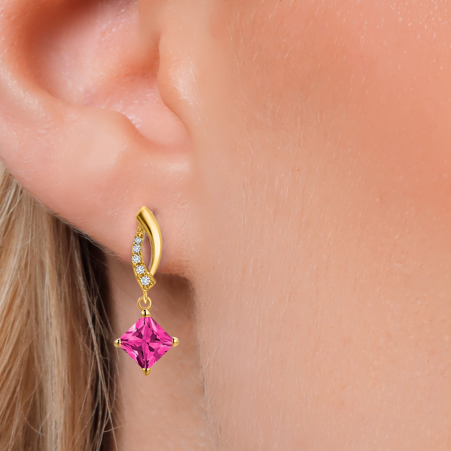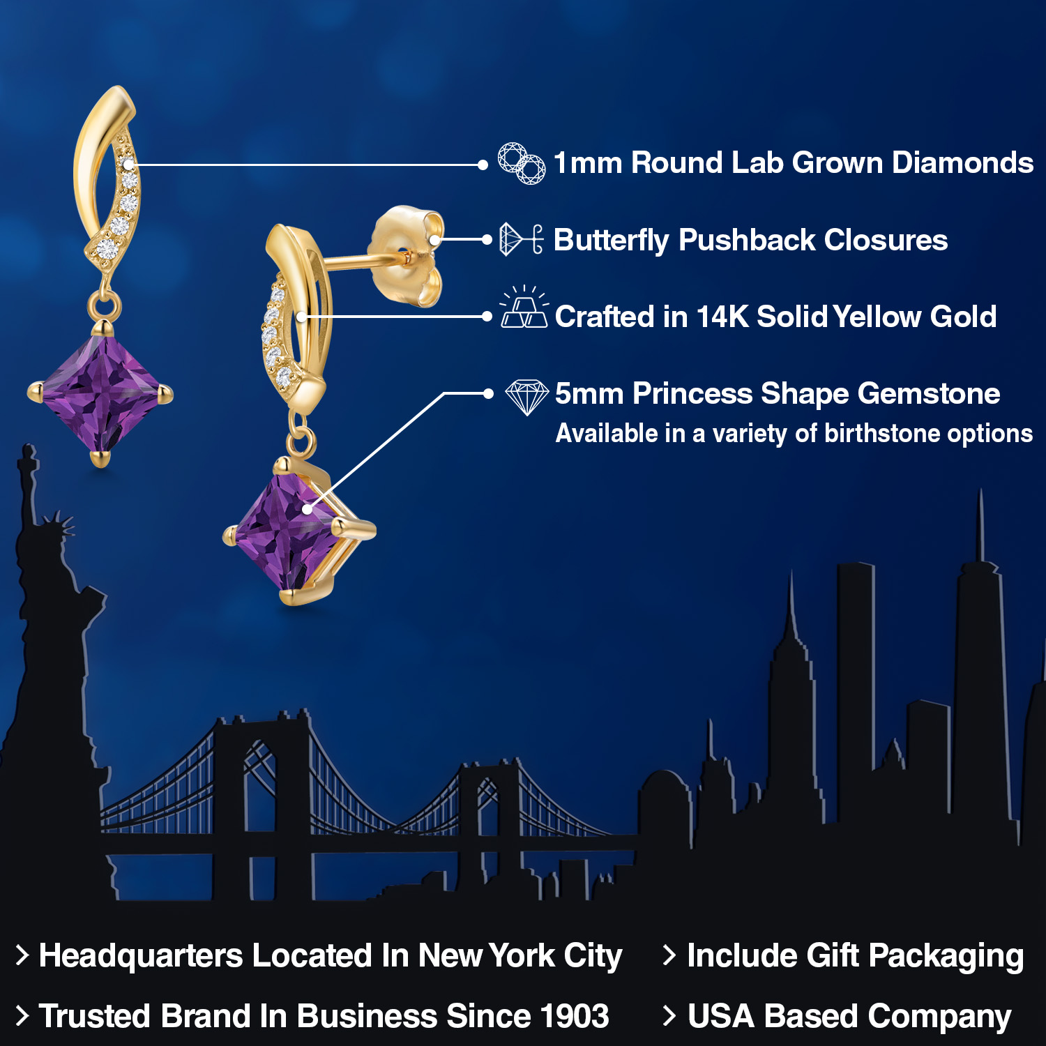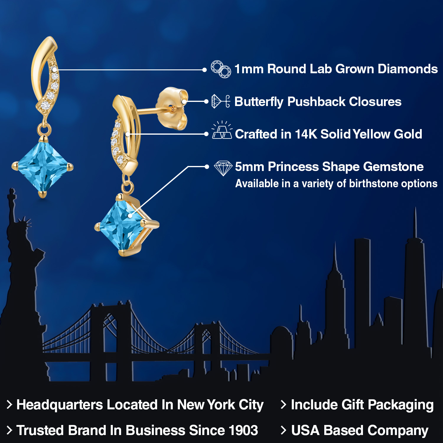 EXQUISITE 5MM PRINCESS GEMSTONE: Nestled in an elegant setting of 14K yellow gold, this alluring earring features a 5MM princess cut gemstone. Available in a variety of birthstone options, the stone's unique shape exudes a regal elegance, shimmering brilliantly from every angle to reflect your individuality.