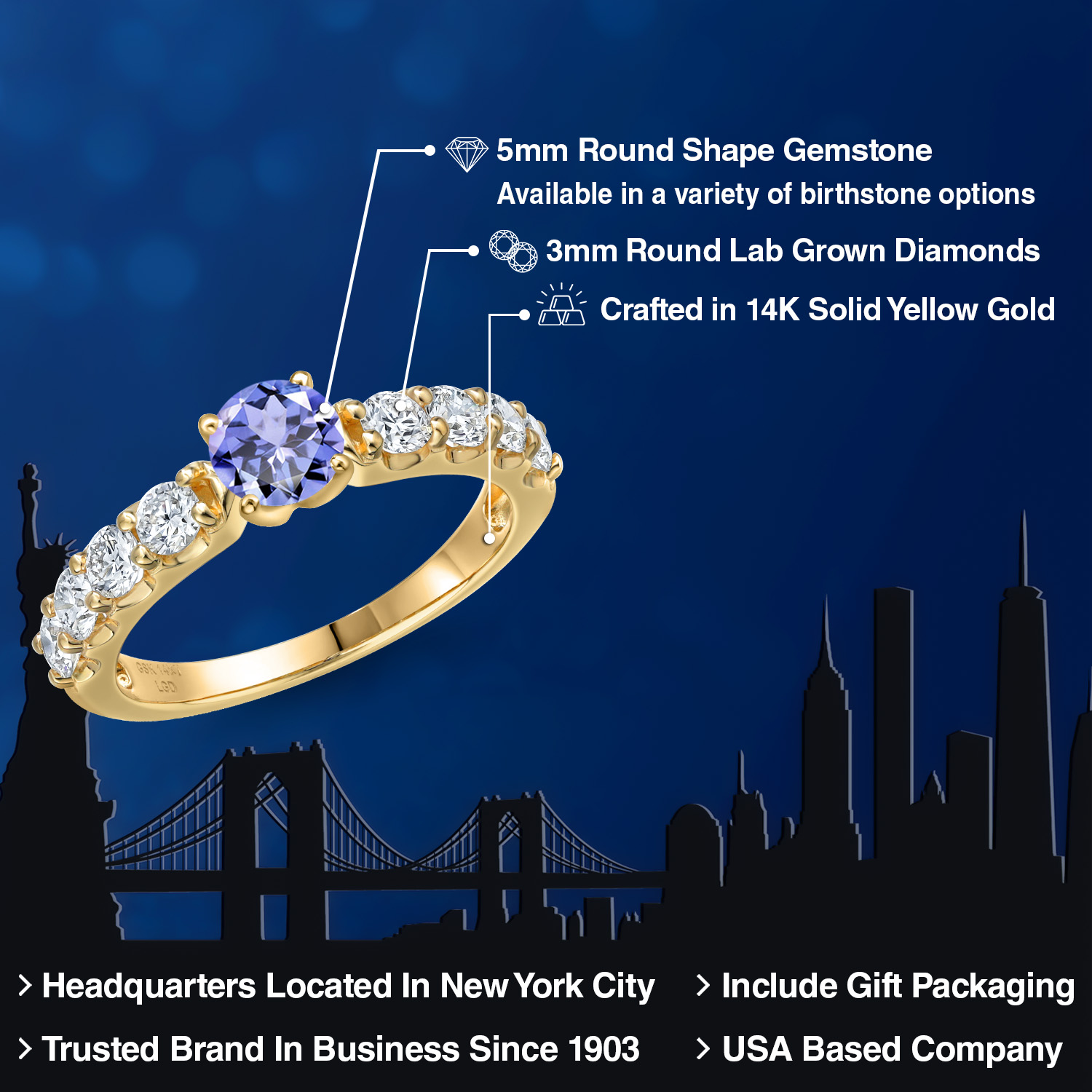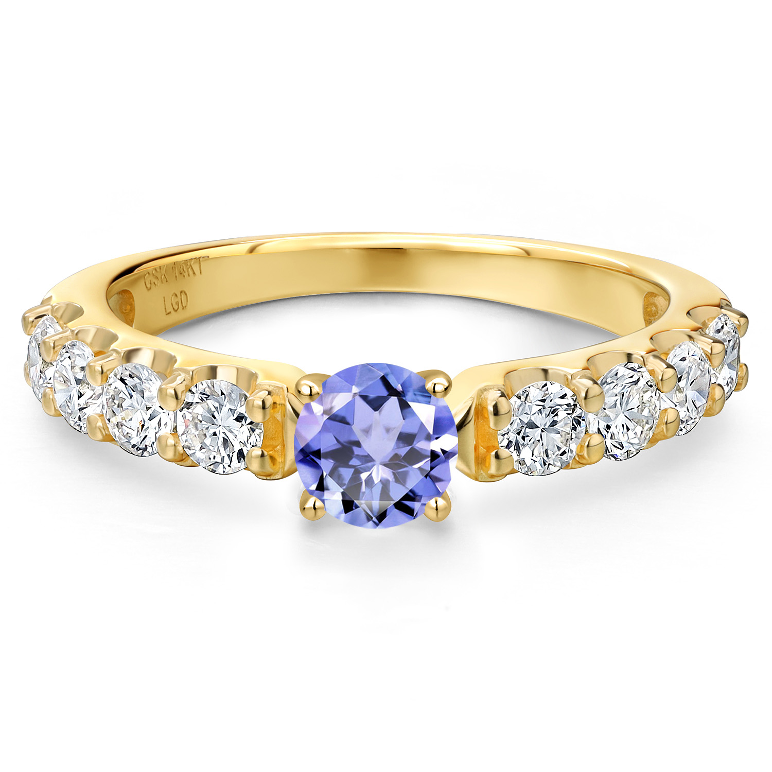 MEASUREMENTS: 5x5mm Round Heat-Treated Blue Tanzanite, 3x3mm Round E - F Lab Grown Diamond. Total Carat Weight is 1.34 cttw