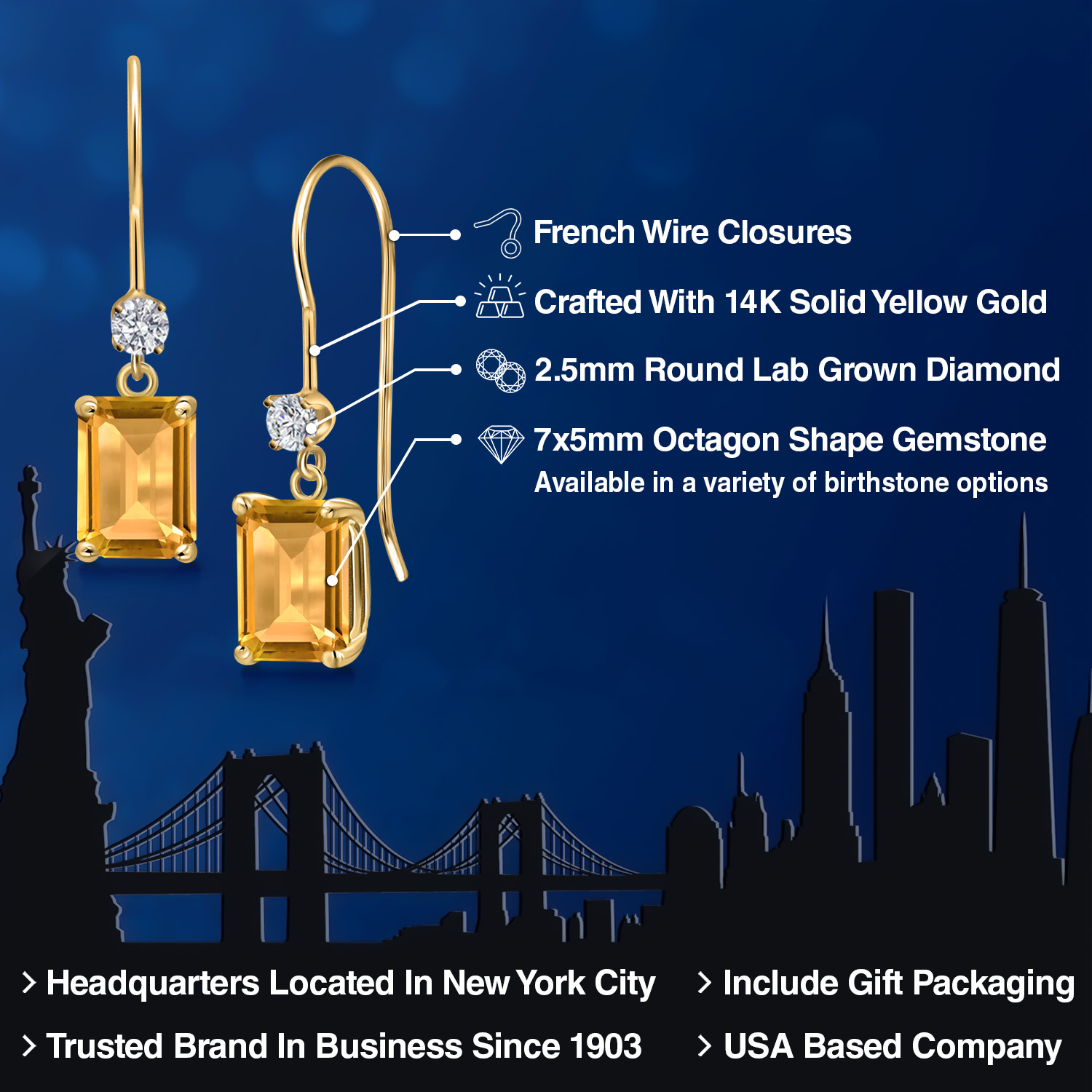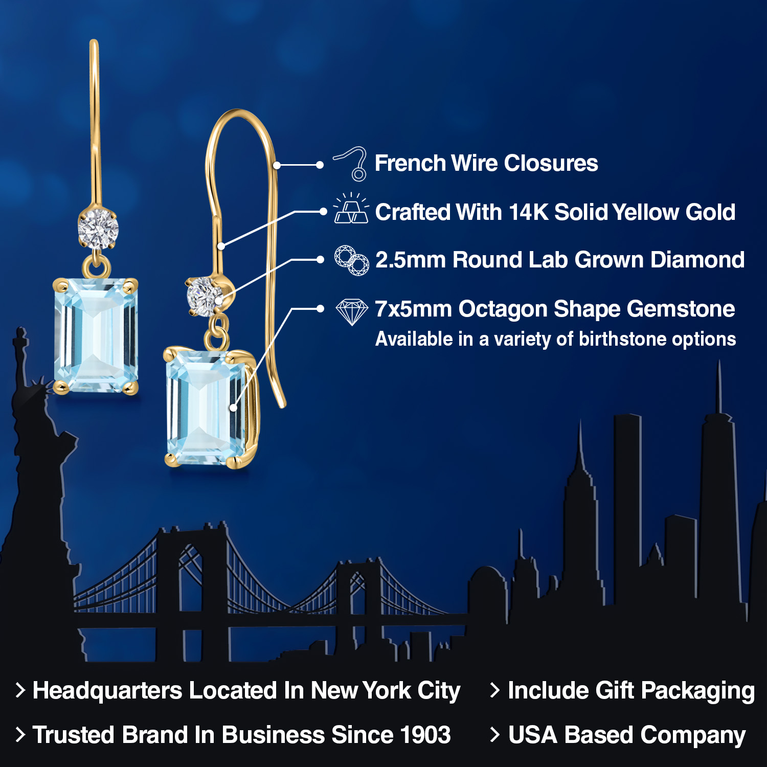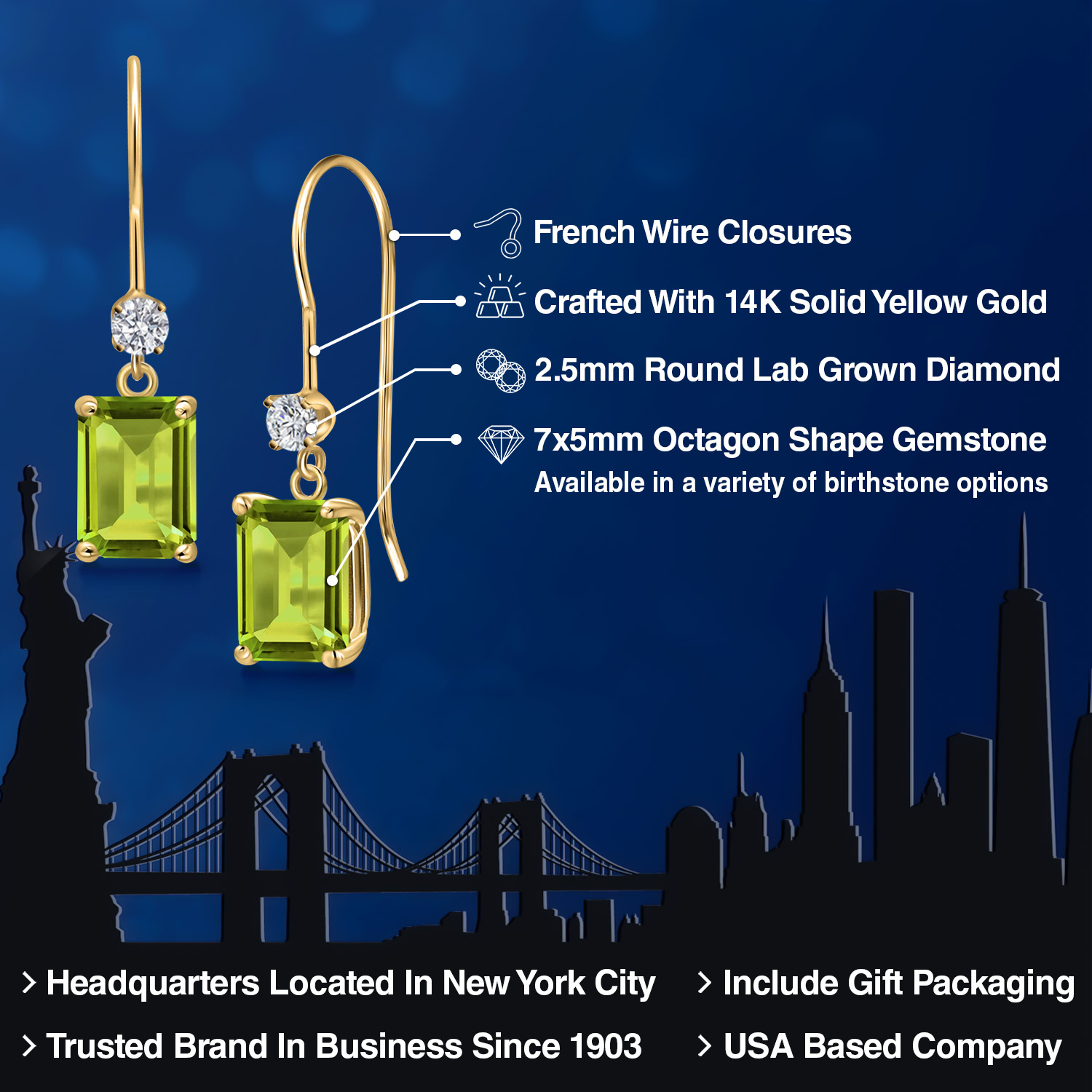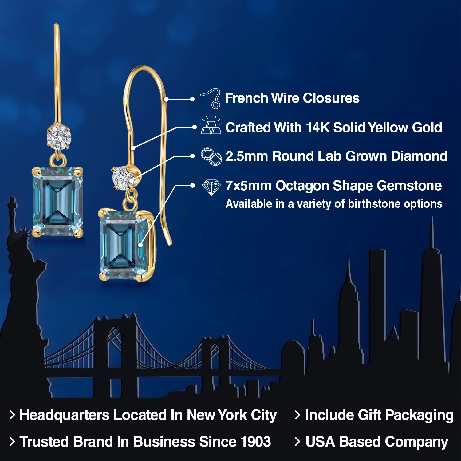 14K Yellow Gold Gemstone Birthstone and Lab Grown Diamond French Wire Dangle Earrings for Women | Emerald Cut 7X5MM | Fine Jewelry Gifts for Her Mom Women Wife