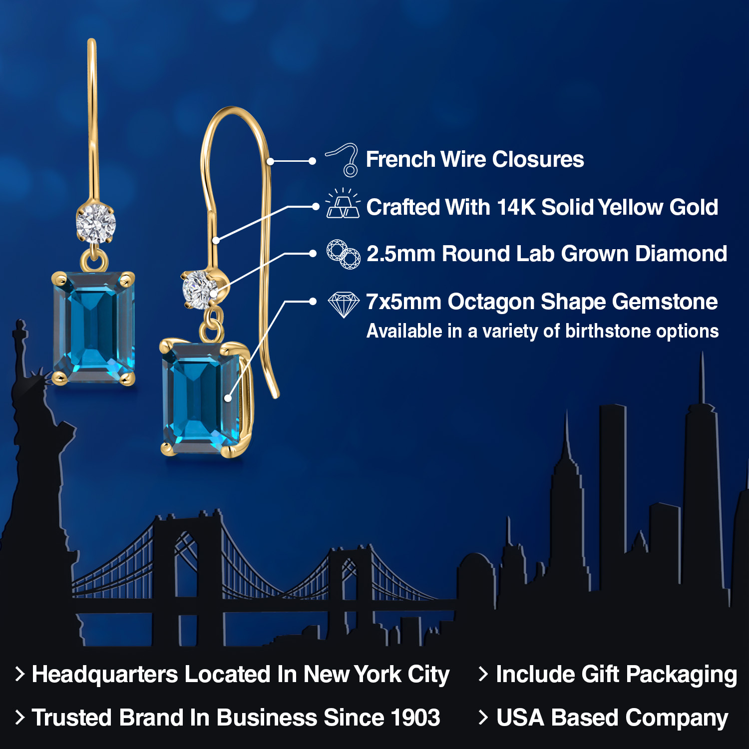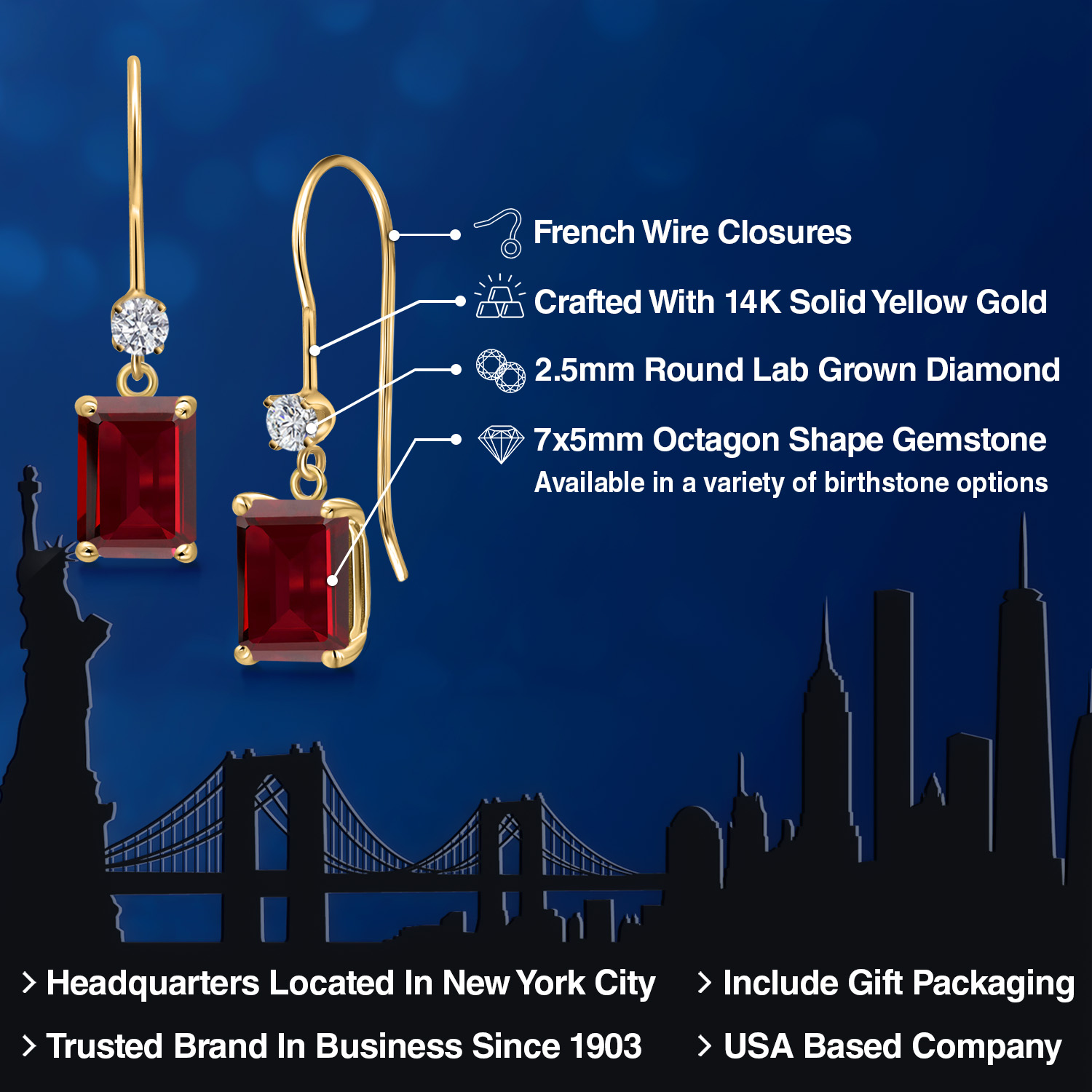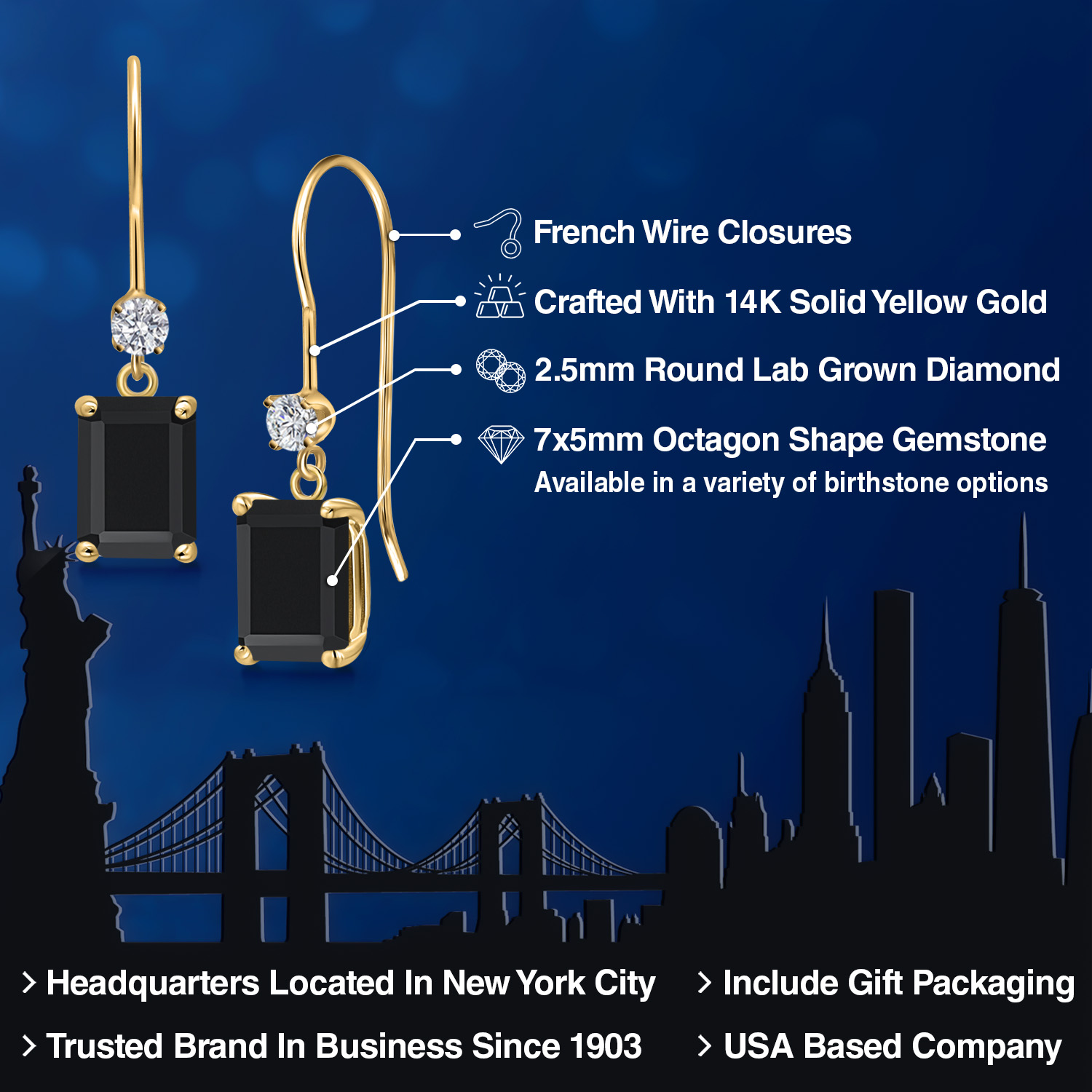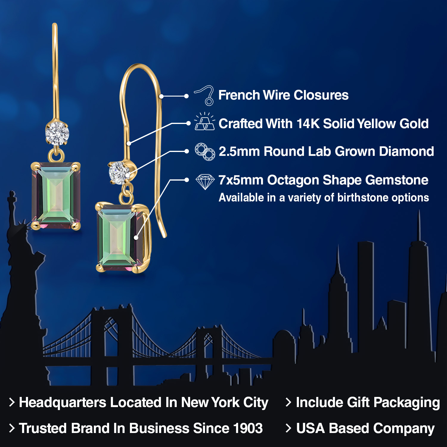 14K Yellow Gold Gemstone Birthstone and Lab Grown Diamond French Wire Dangle Earrings for Women | Emerald Cut 7X5MM | Fine Jewelry Gifts for Her Mom Women Wife