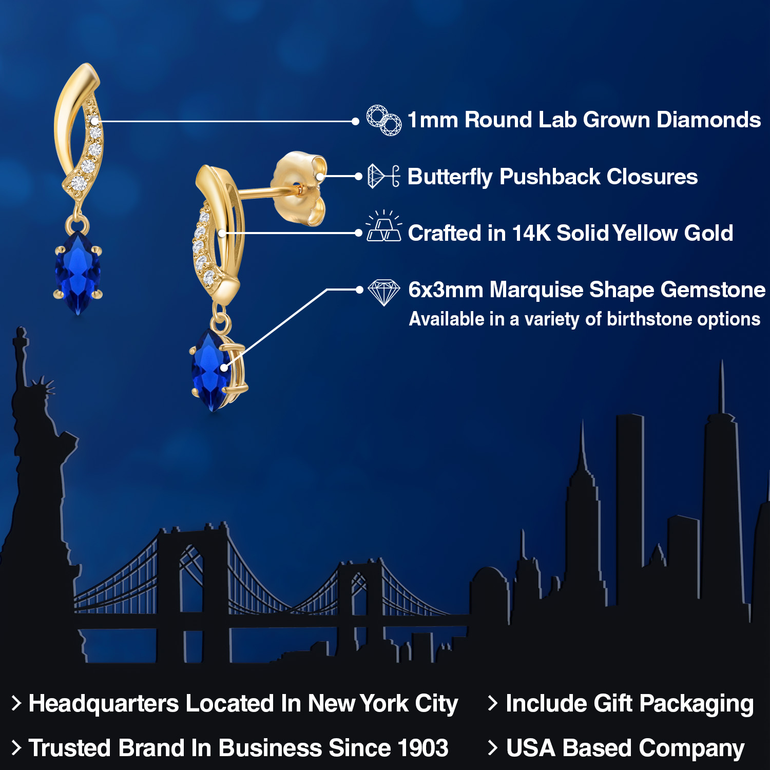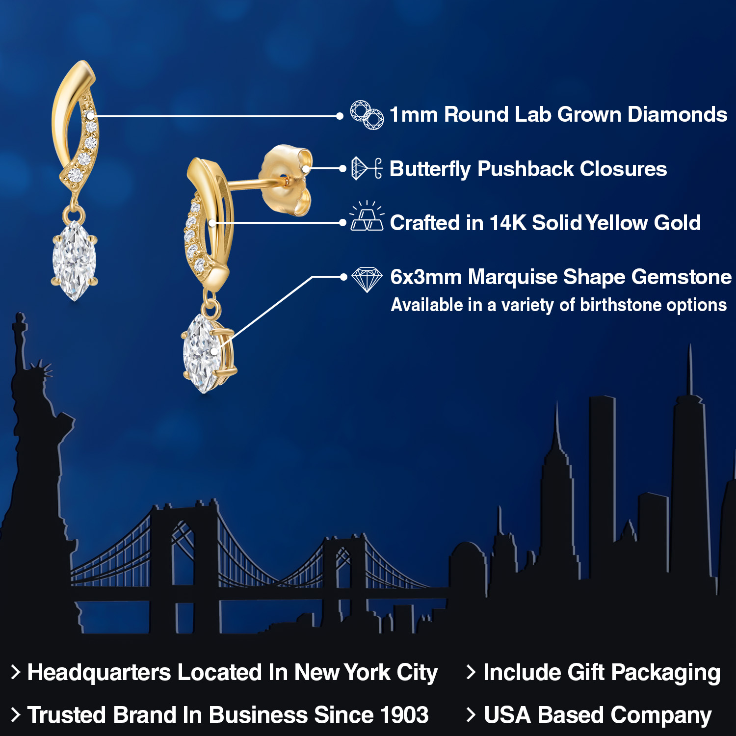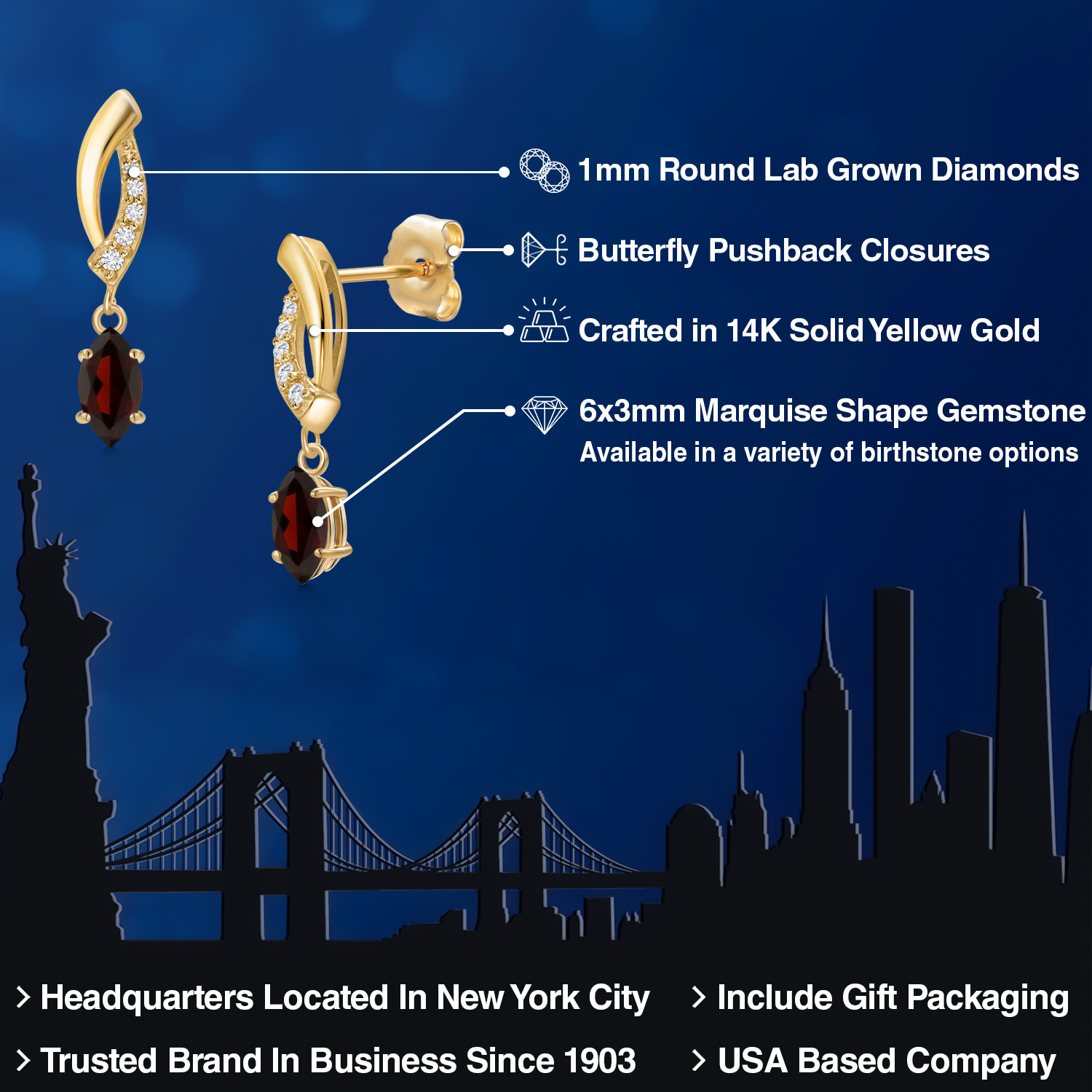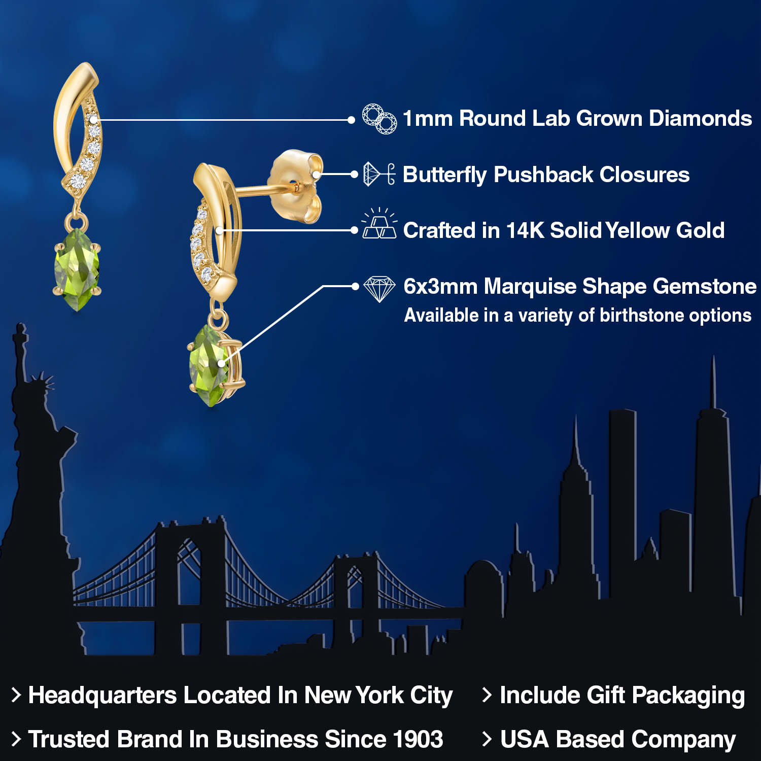 14K Yellow Gold Gemstone Birthstone and Lab Grown Diamond Dangle Earrings for Women | Marquise Cut 6X3MM and Round 1MM | Fine Jewelry Gifts for Her Mom Women Wife
