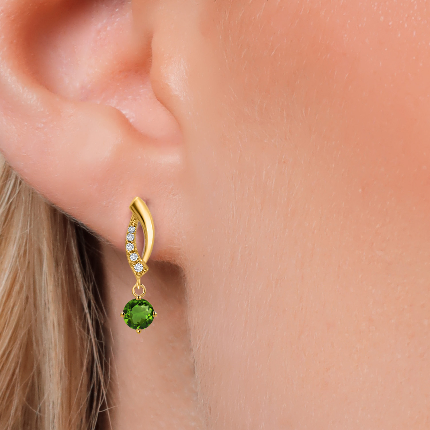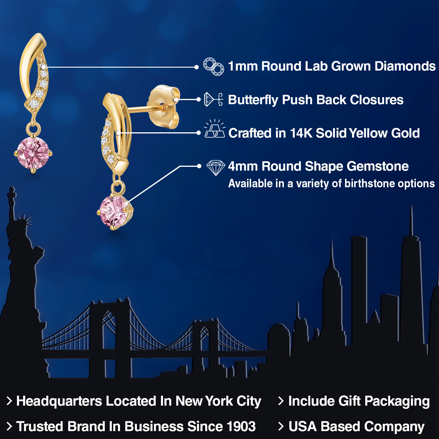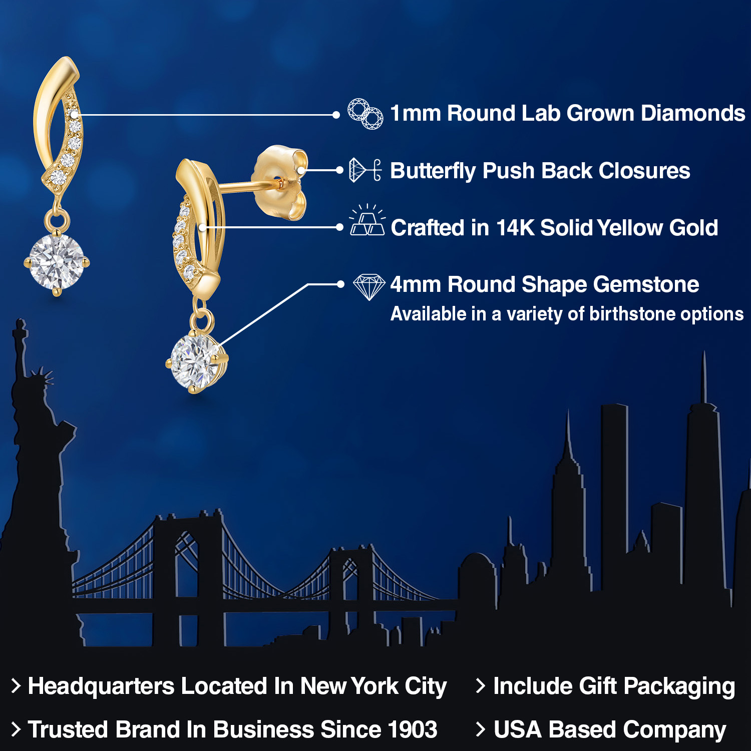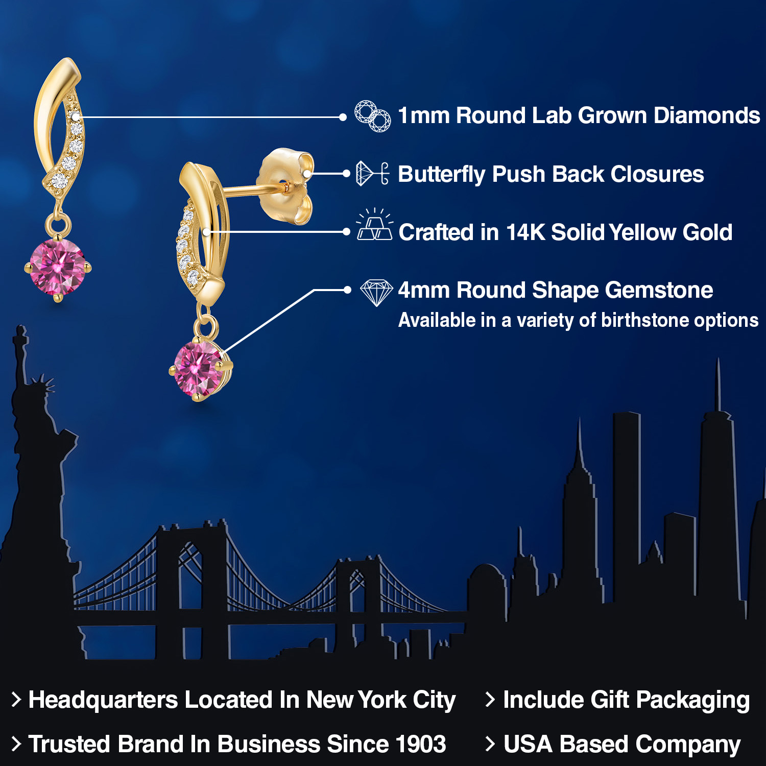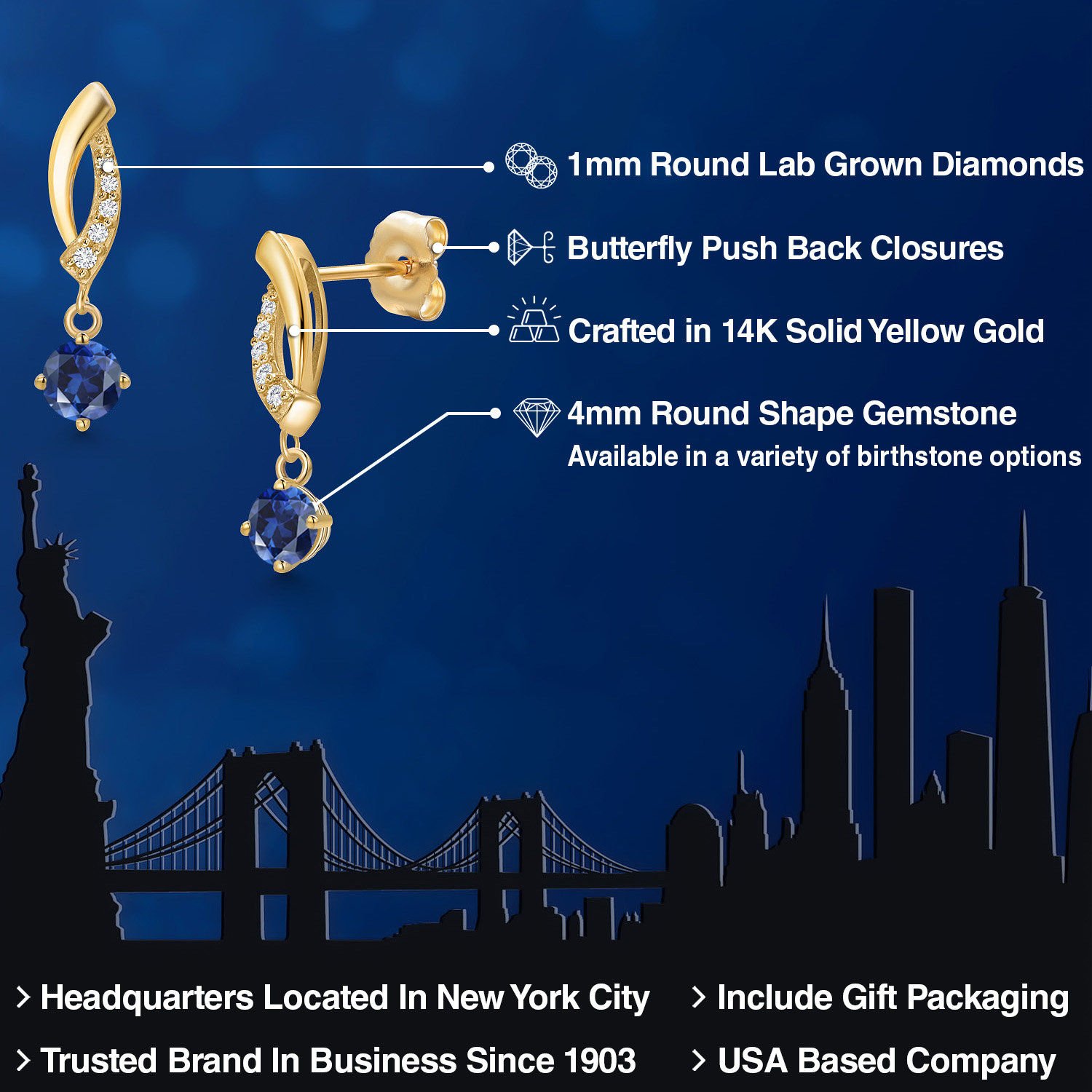 LAB GROWN DIAMOND DETAILS: Each earring is adorned with meticulously selected 1MM lab-grown diamonds that perfectly complement the central gemstone. The diamonds' round cut maximizes their clarity and brilliance, adding a sparkle that's sure to turn heads. Their secure setting showcases our commitment to superior craftsmanship and style.