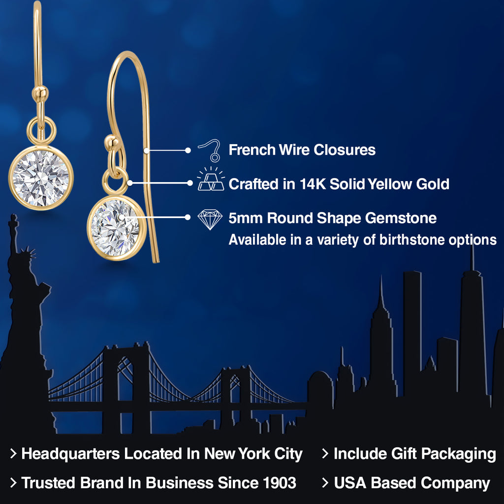 EXQUISITE ROUND 5MM GEMSTONE ELEGANCE: These 14K Yellow Gold French Wire Dangle Earrings showcase a stunning 5MM round gemstone, offering a brilliant burst of color that complements any attire. Available in various birthstones, each gem is carefully selected for its clarity and vibrant hue, making it a perfect personalized gift. The round shape enhances light reflection, ensuring a dazzling sparkle that captures attention effortlessly.