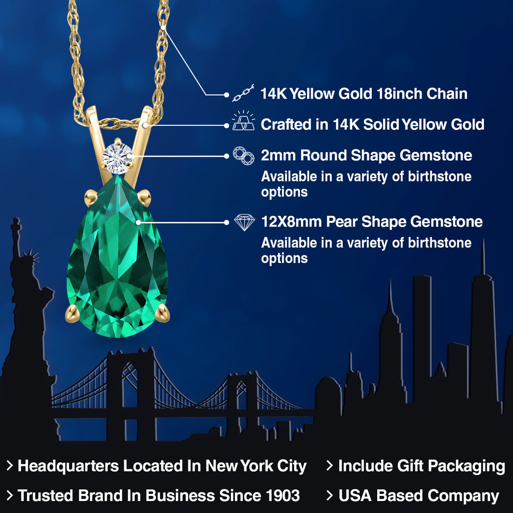 14K Yellow Gold Green Nano Emerald and White Moissanite Pendant Necklace for Women | 2.48 Cttw | Gemstone May Birthstone | Pear Shape 12X8MM | With 18 Inch Chain