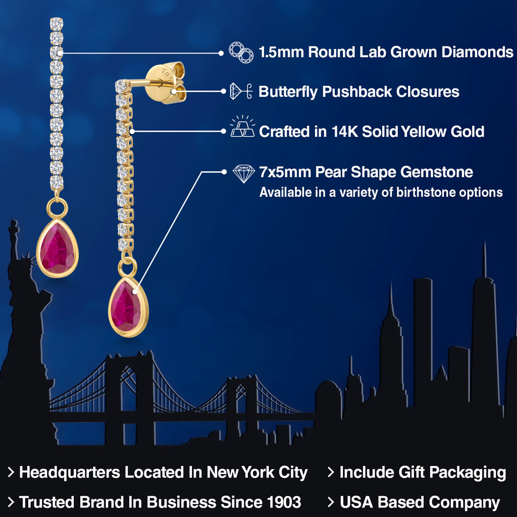 14K Yellow Gold Gemstone Birthstone and Lab Grown Diamond Long Liner Chain Dangle Earrings for Women | Pear Shape 7X5MM and Round 1.5MM Accents | Gold Chain Drop Earrings