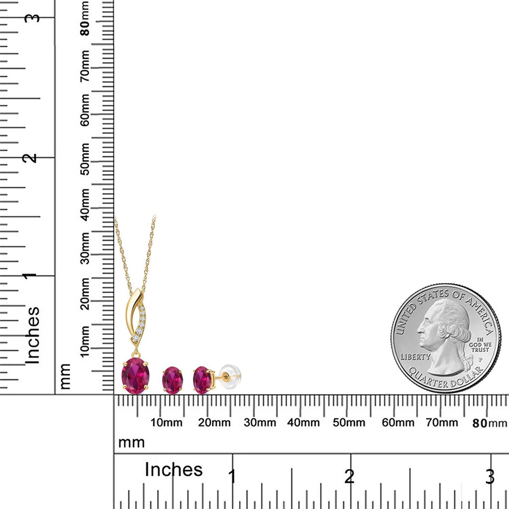 Gem Stone King 14K Yellow Gold Red Created Ruby and Lab Grown Diamond Pendant Earrings Jewelry Set For Women | 2.35 Cttw | Gemstone July Birthstone | Oval 8X6MM | with 18 Inch Chain