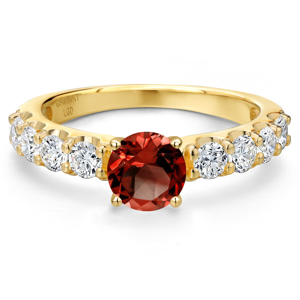 MEASUREMENTS: 6.5x6.5mm Round Red Garnet, 3x3mm Round E - F Lab Grown Diamond. Total Carat Weight is 2.08 cttw