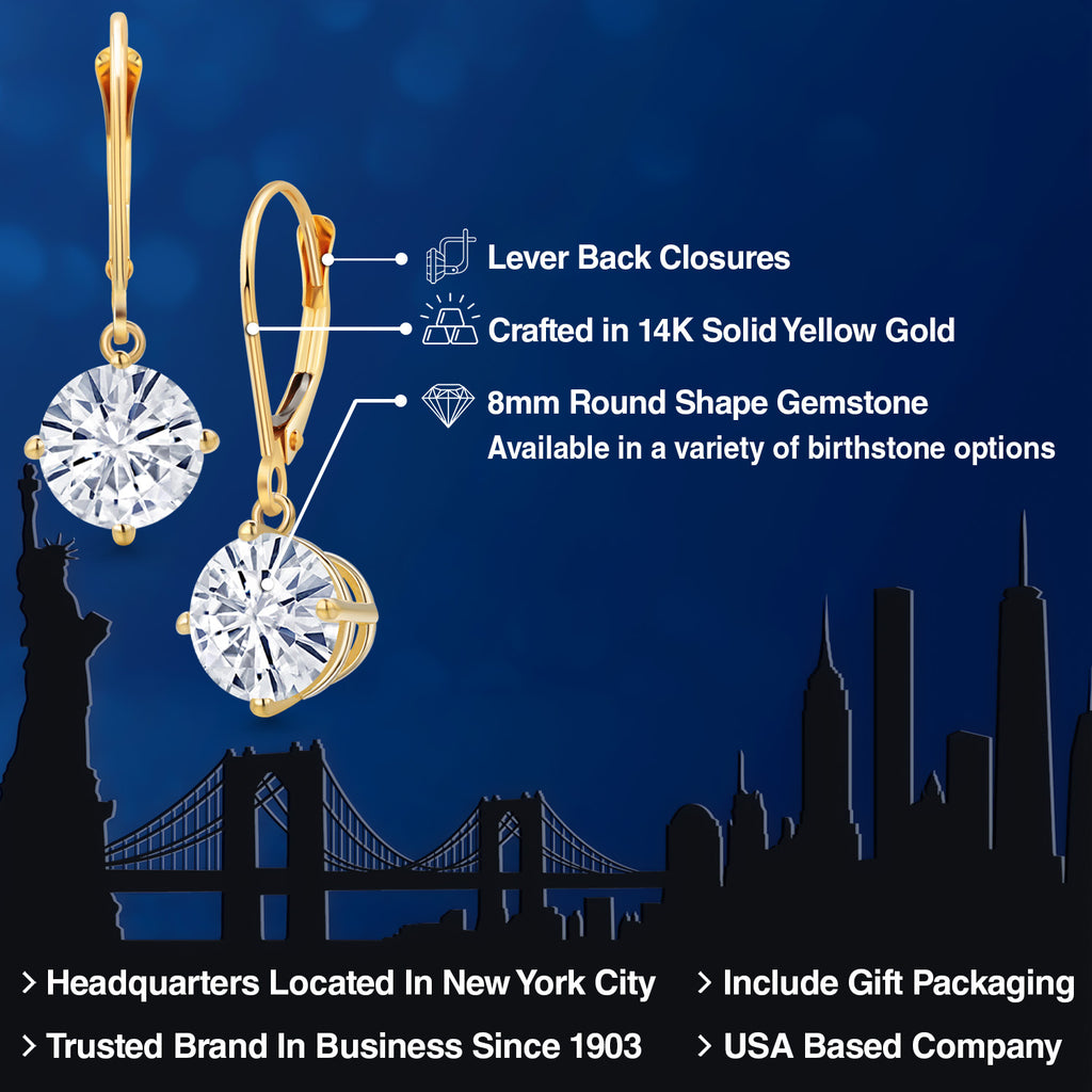 8MM ROUND GEMSTONE BRILLIANCE: These exquisite 14K Yellow Gold Leverback Earrings feature a stunning 8MM round gemstone, meticulously cut to maximize its inherent brilliance and clarity. With birthstone options available, each gemstone offers a personal touch, making it a perfect match for any month's celebration. The round shape symbolizes timeless elegance, capturing light from every angle to create a dazzling display that is sure to captivate onlookers.