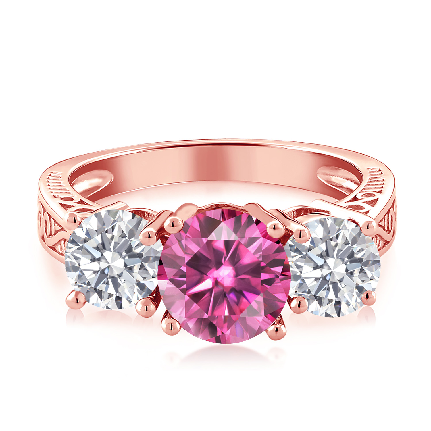 MEASUREMENTS: 7x7mm Round Coated Pink Moissanite, 5x5mm Round E - F Lab Grown Diamond. Total Carat Weight is 2.2 cttw