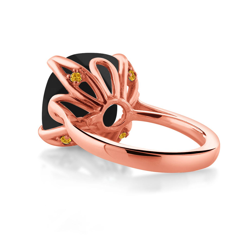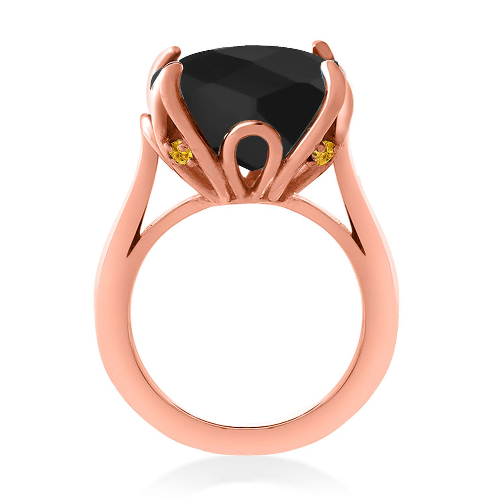 18K Rose Gold Plated Silver Black Onyx and Yellow Created Sapphire Engagement Ring For Women (8.22 Cttw, 14MM Cushion Checkerboard, Available in Size 5,6,7,8,9)