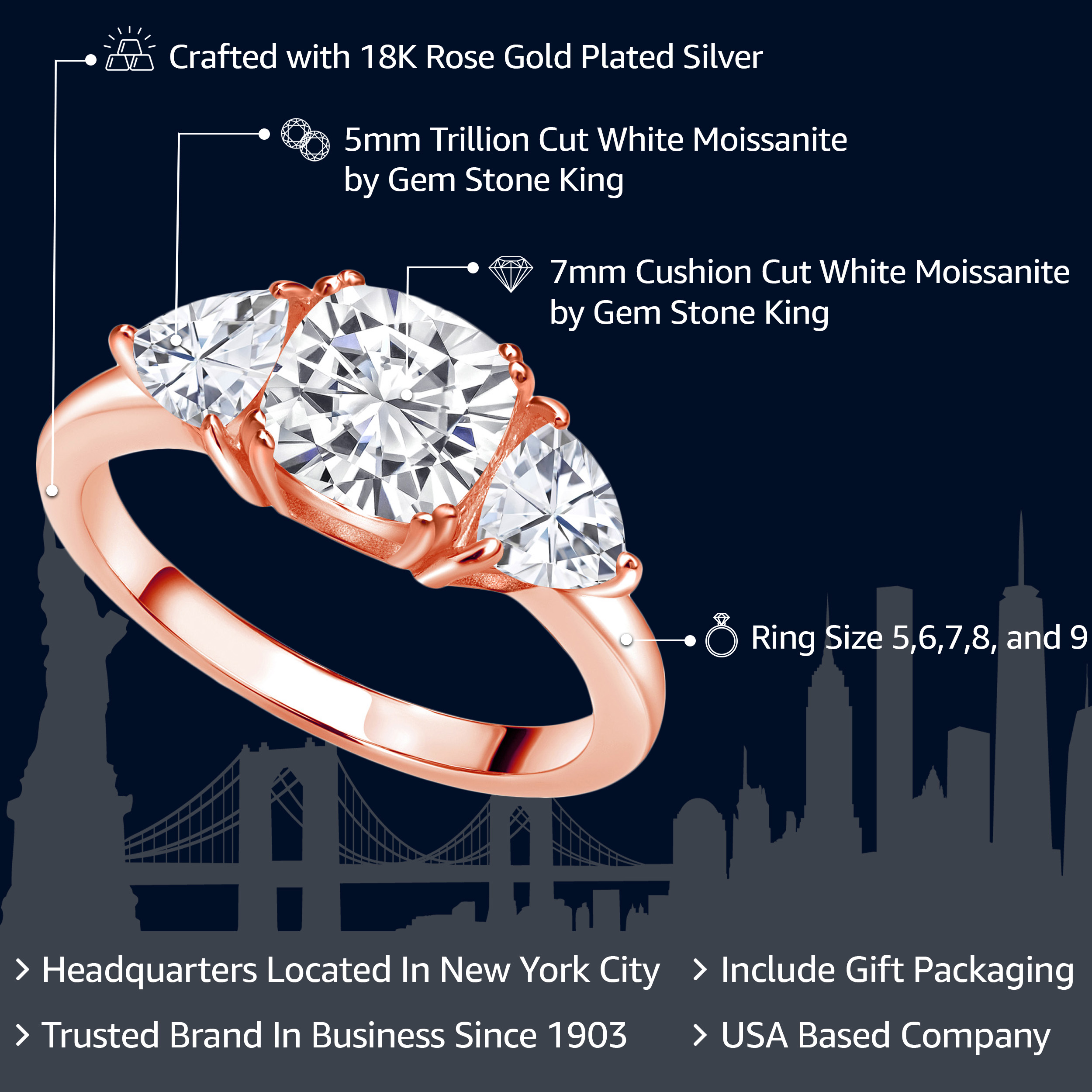 18K Rose Gold Plated Silver Gemstone Birthstone 3-Stone Engagement Ring for Women | 7MM Cushion and 5MM Trillion | Three Stone Promise Anniversary Wedding Ring | Sizes 5-9