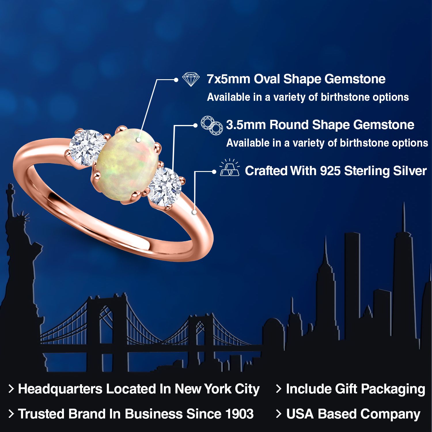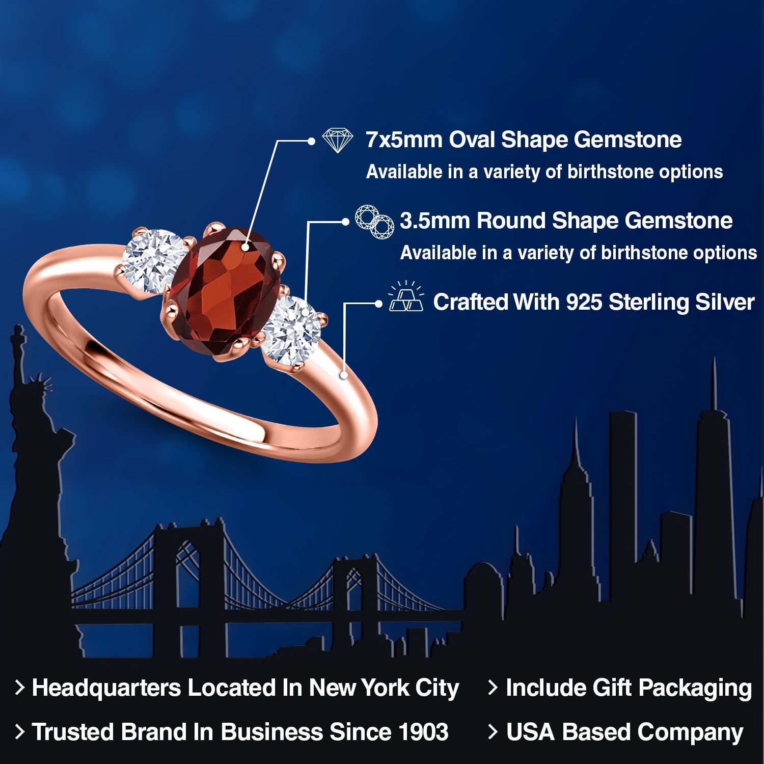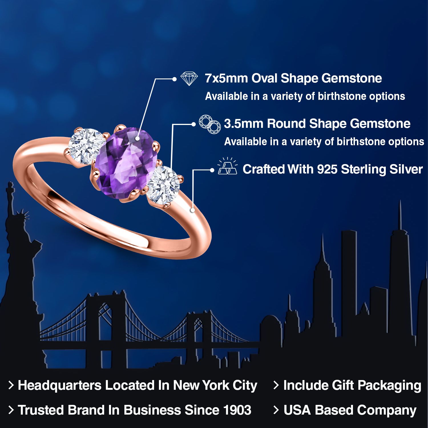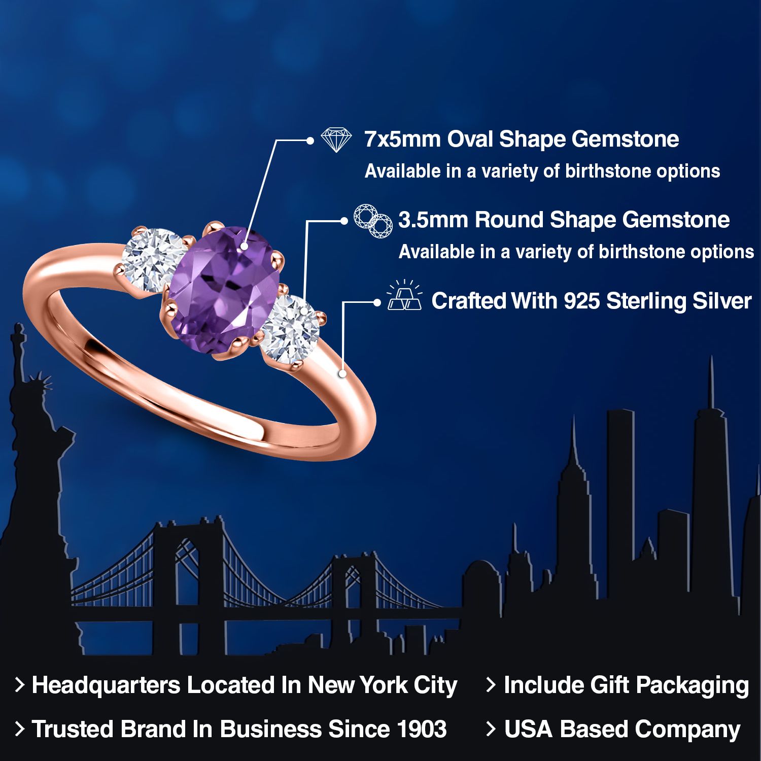 18K Rose Gold Plated Silver Gemstone Birthstone 3-Stone Engagement Ring for Women | Oval 7X5MM and Round 3MM | Wedding Anniversary Promise Ring | Sizes 5, 6, 7, 8, 9