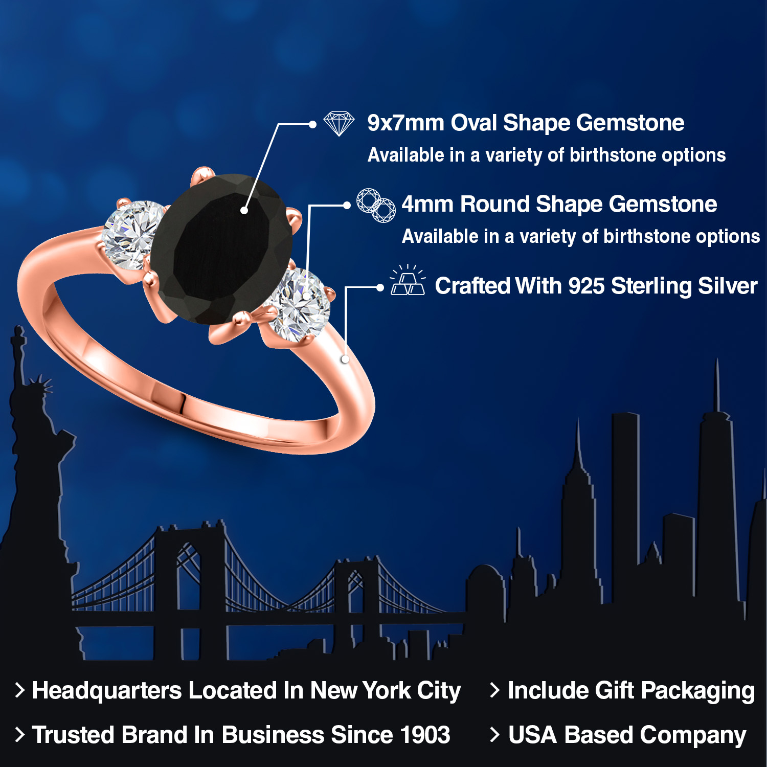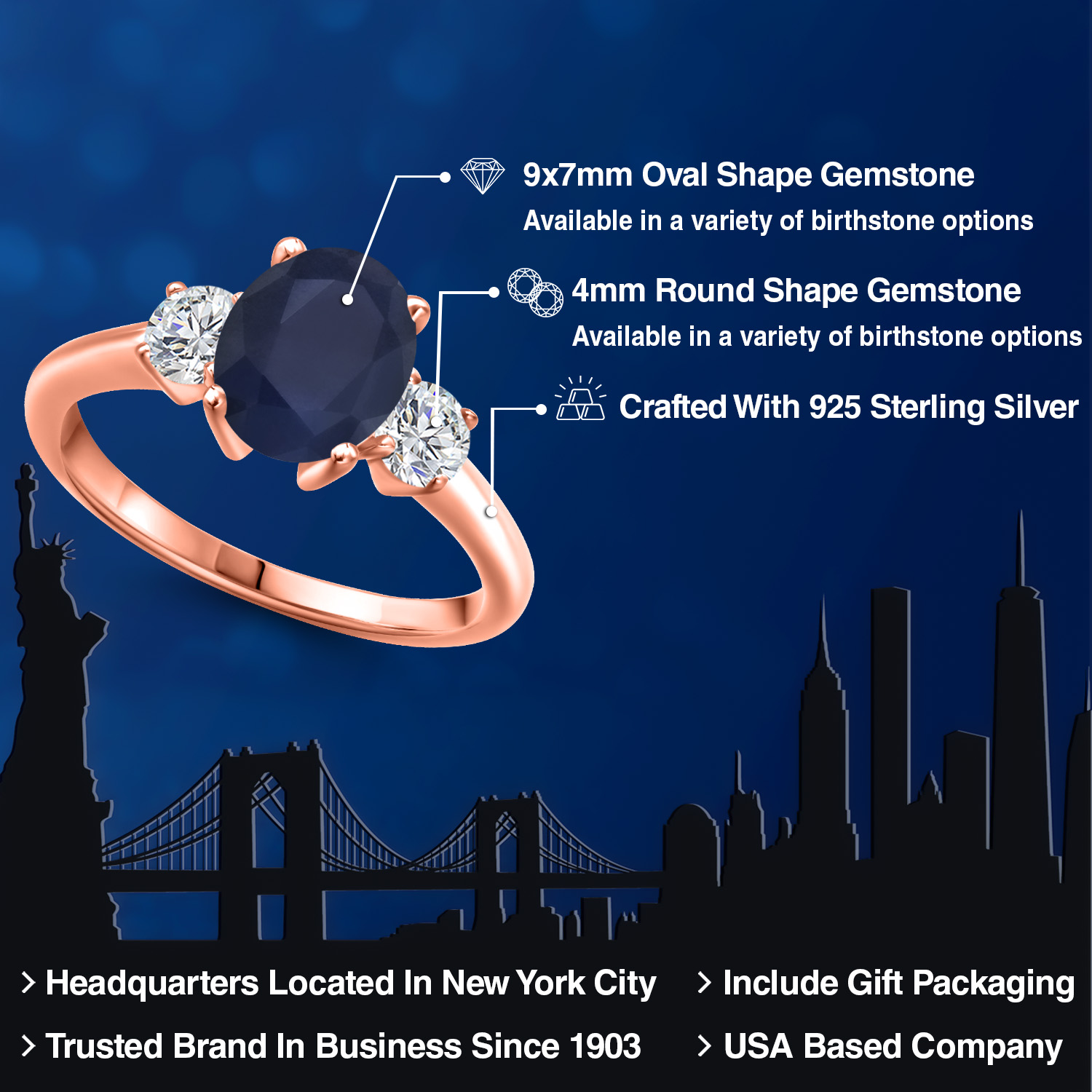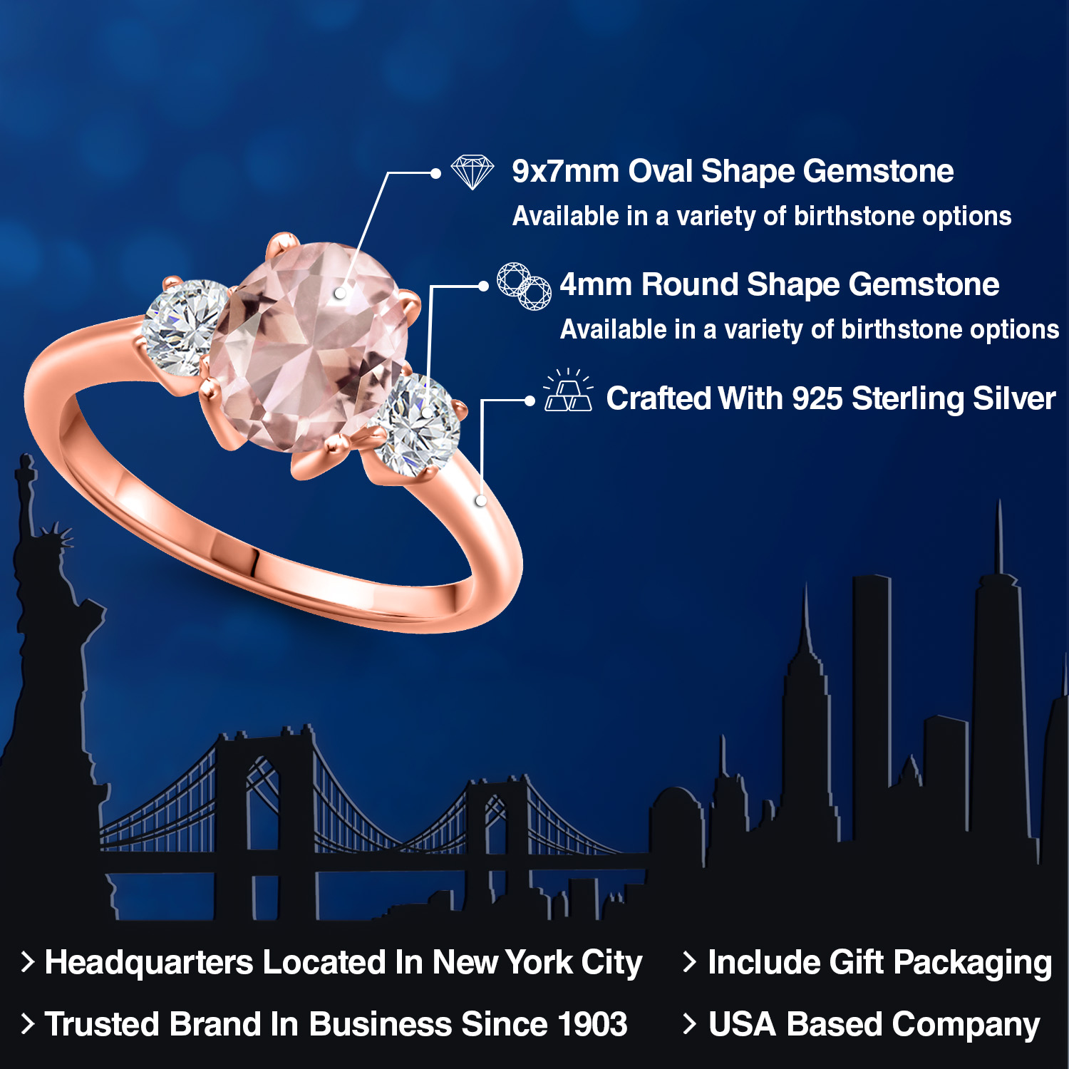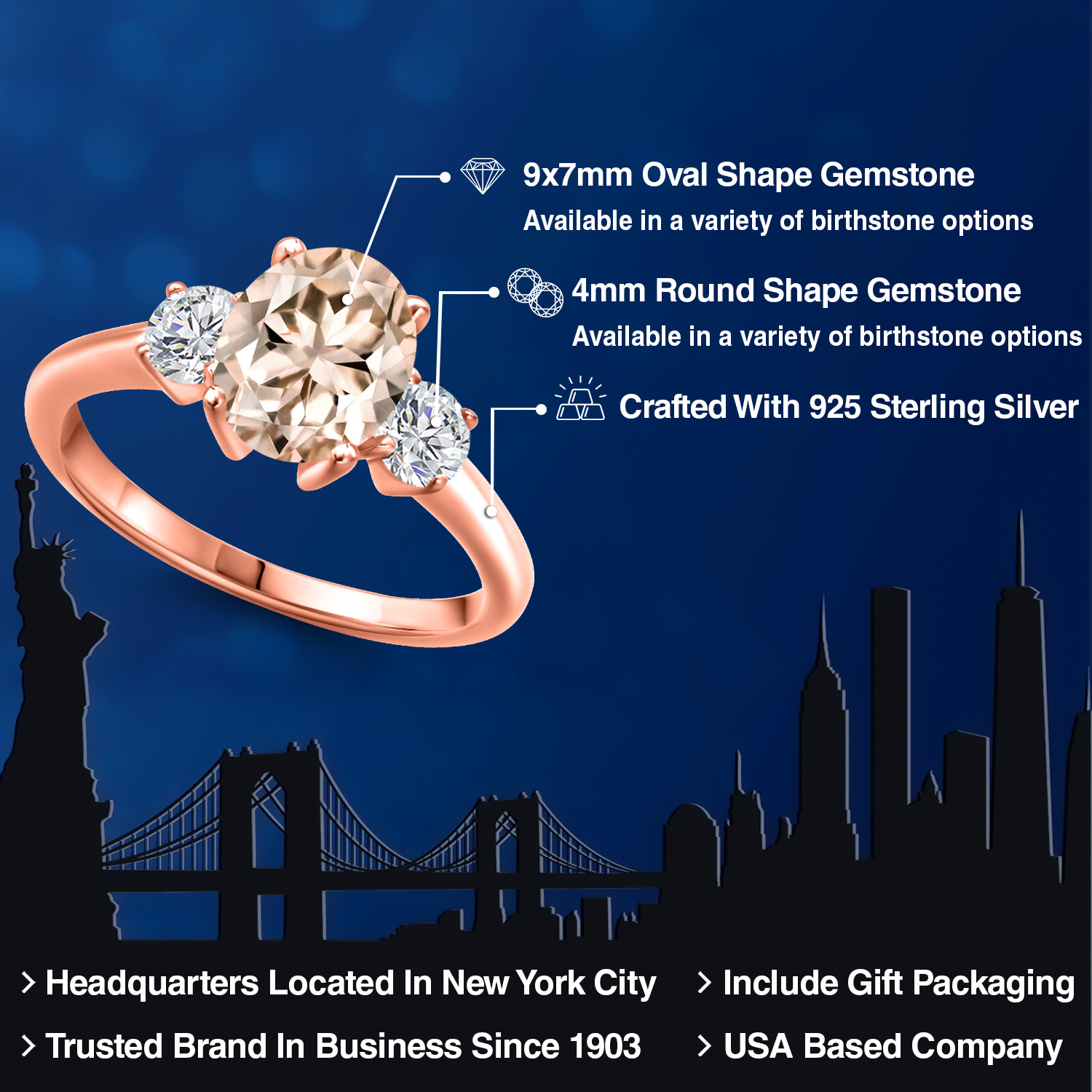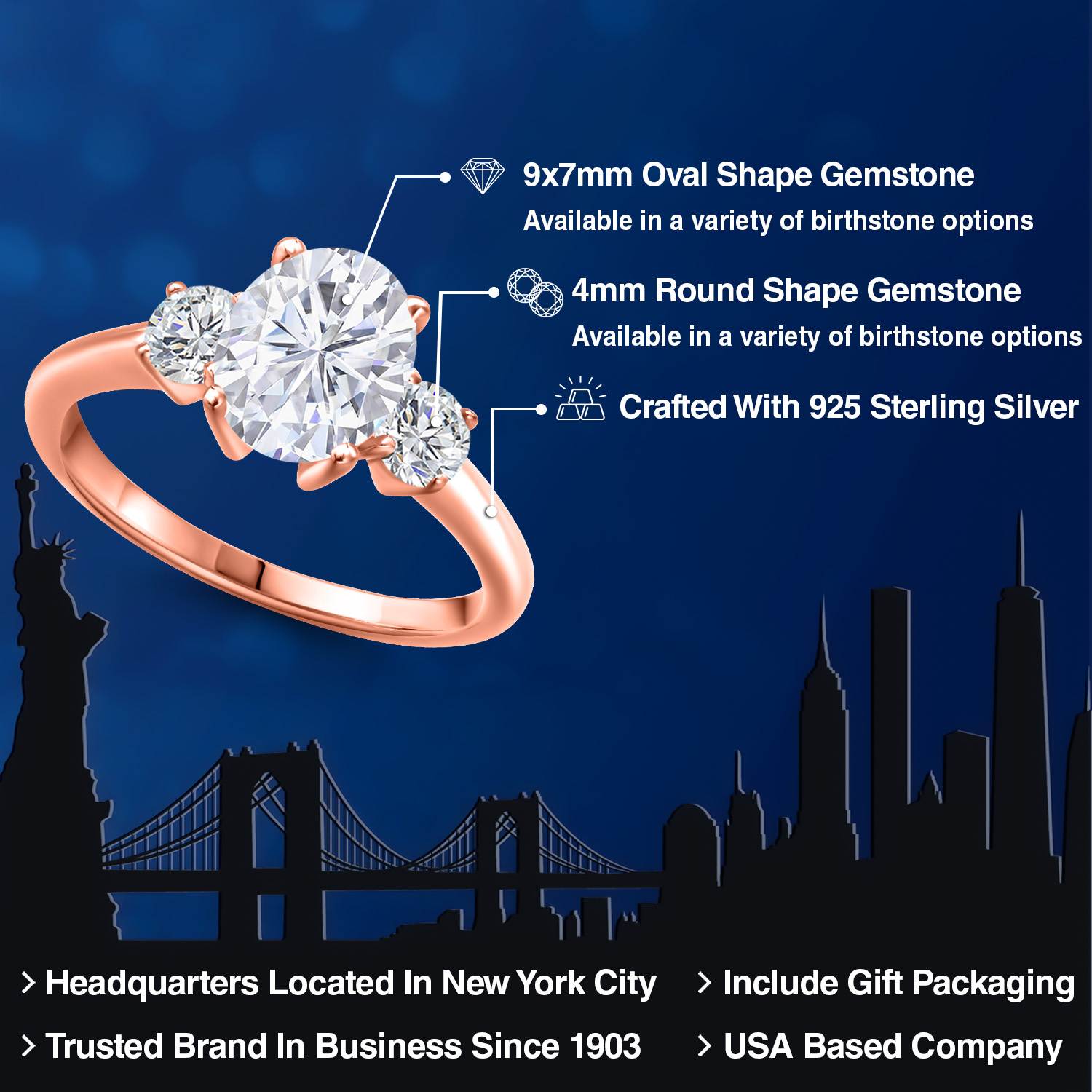 18K Rose Gold Plated Silver Gemstone Birthstone and Lab Grown Diamond 3-Stone Engagement Ring for Women | Oval 9X7MM and Round 4MM | Three Stone Wedding Anniversary Promise Ring | Sizes 5, 6, 7, 8, 9
