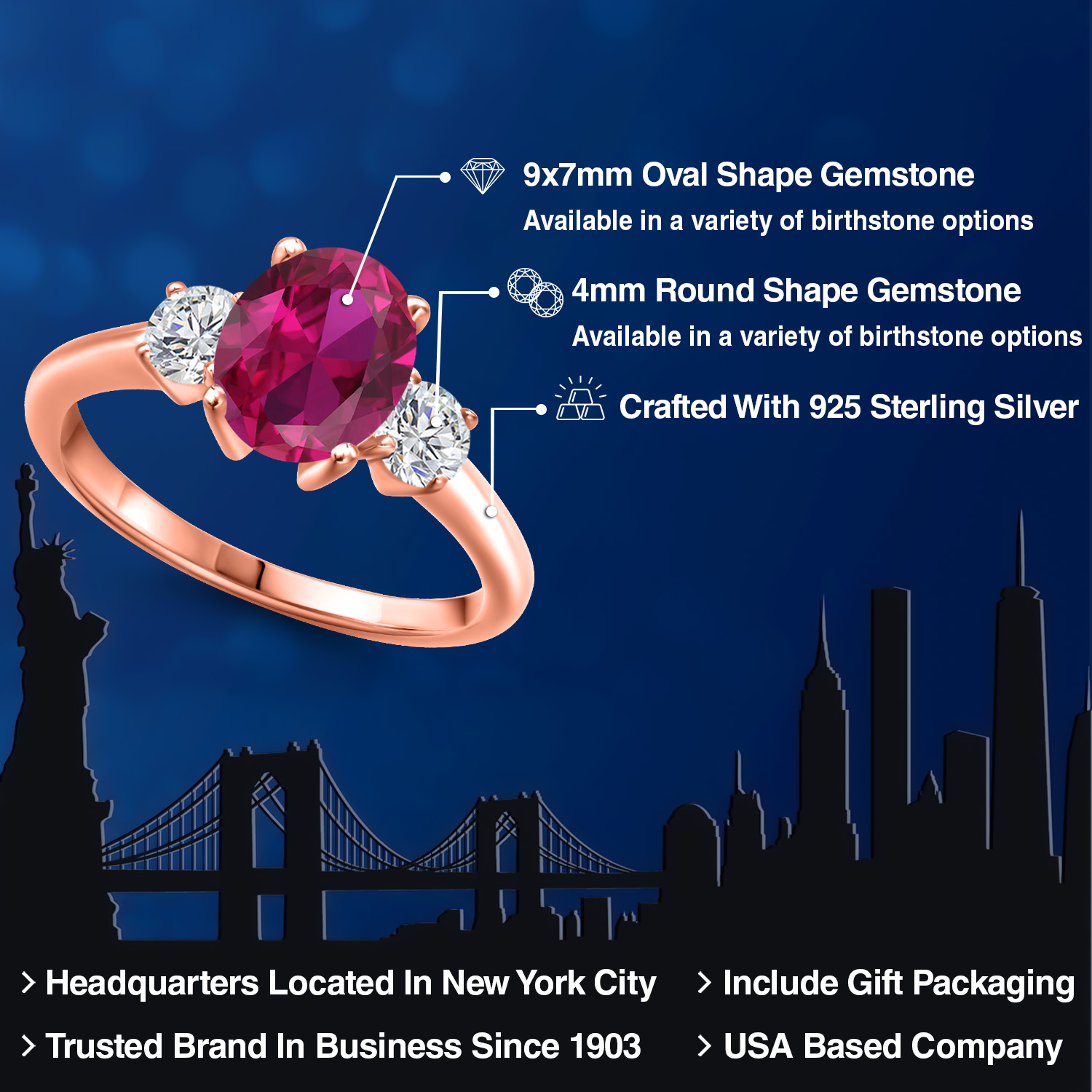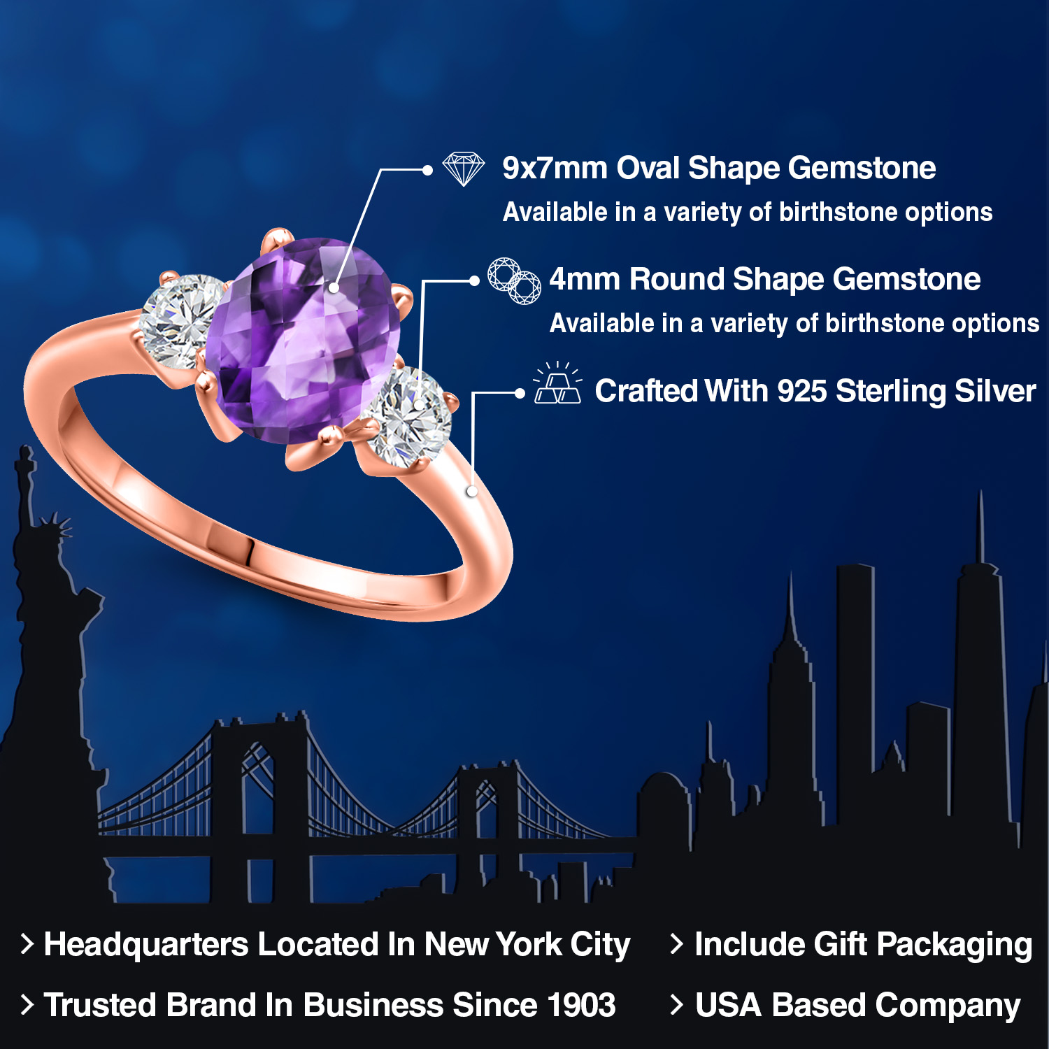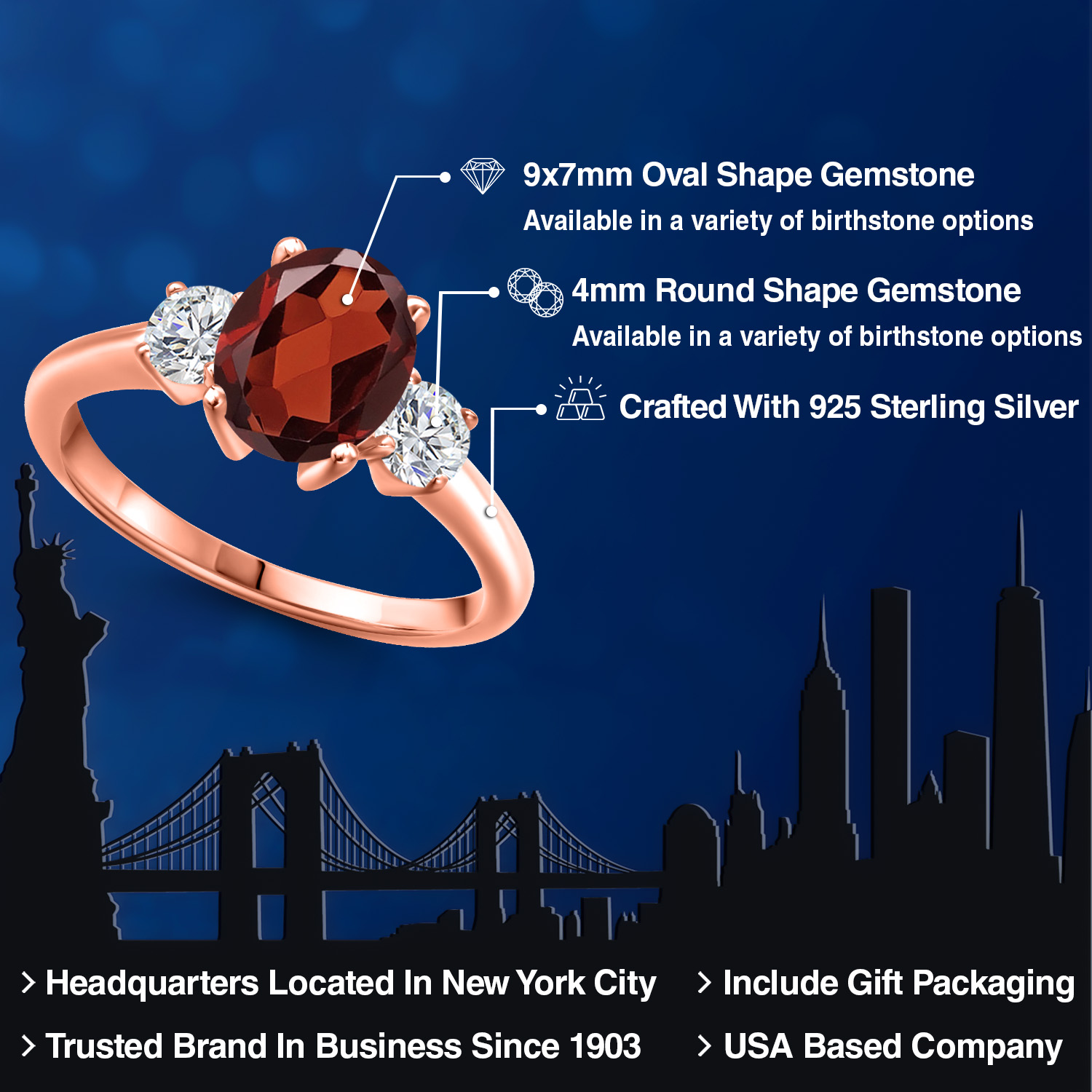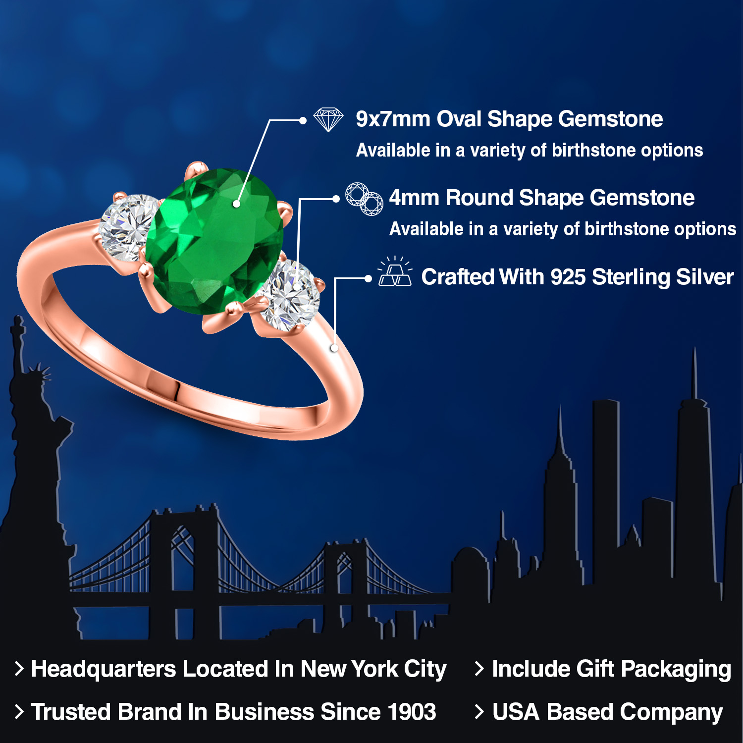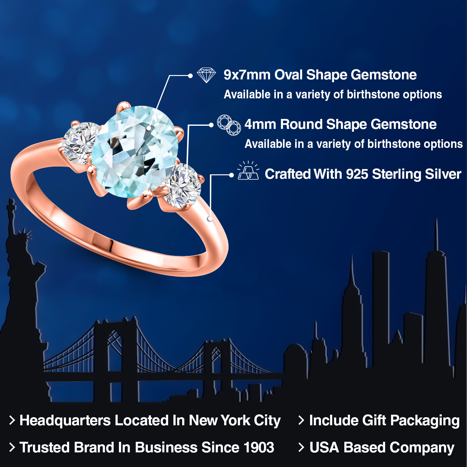 18K Rose Gold Plated Silver Gemstone Birthstone and Lab Grown Diamond 3-Stone Engagement Ring for Women | Oval 9X7MM and Round 4MM | Three Stone Wedding Anniversary Promise Ring | Sizes 5, 6, 7, 8, 9