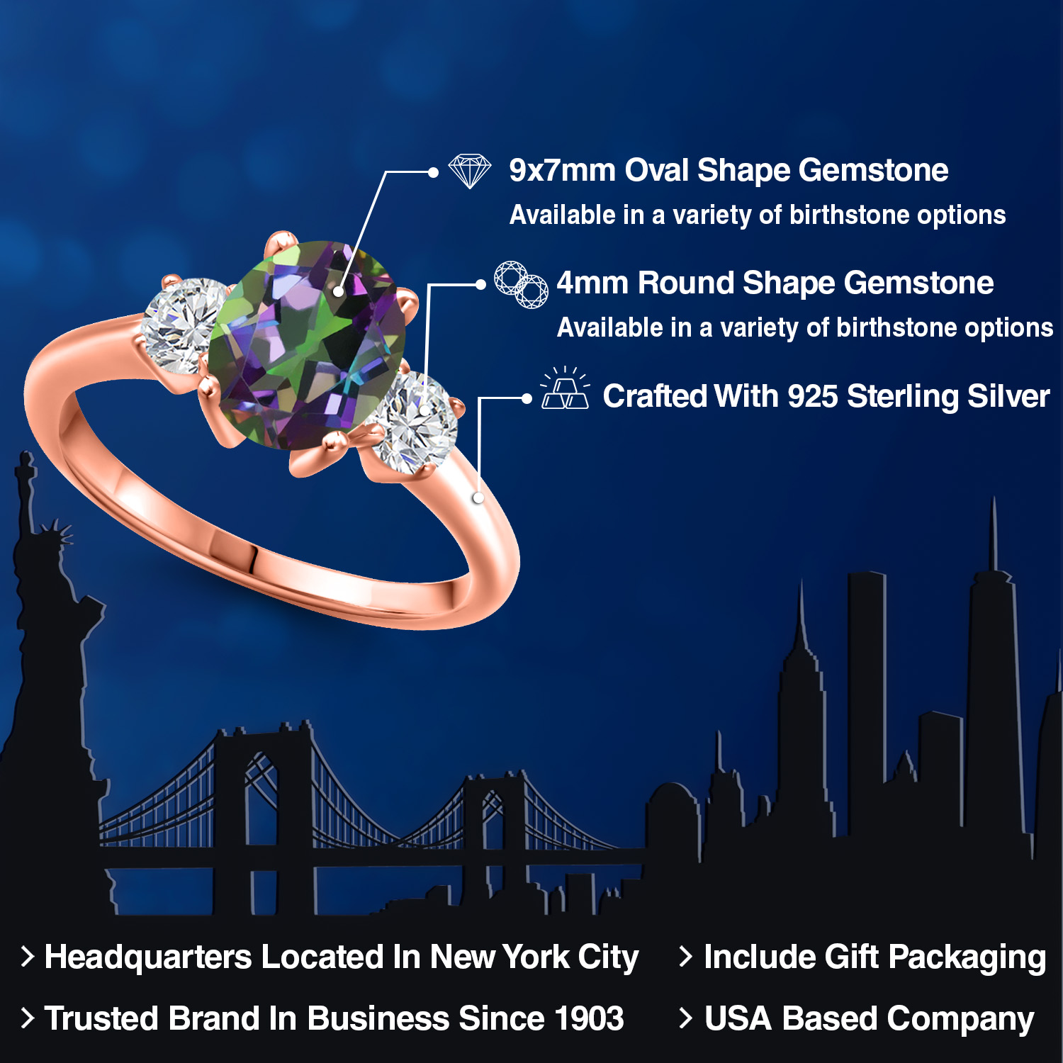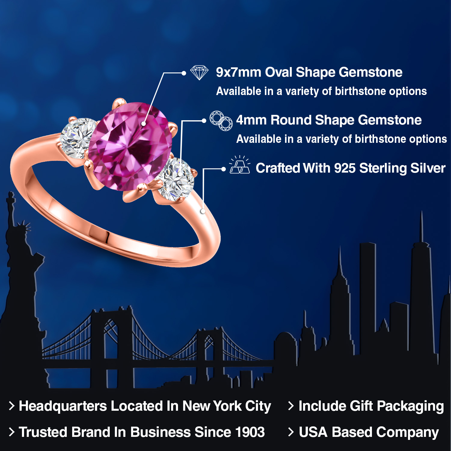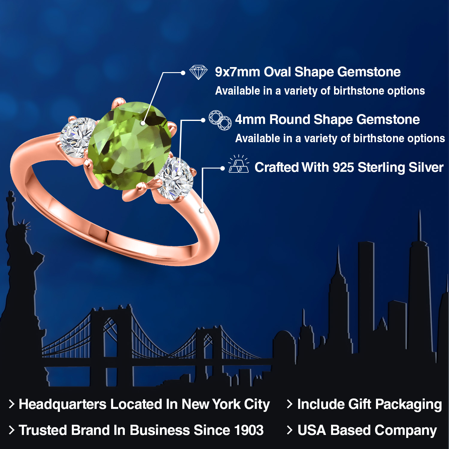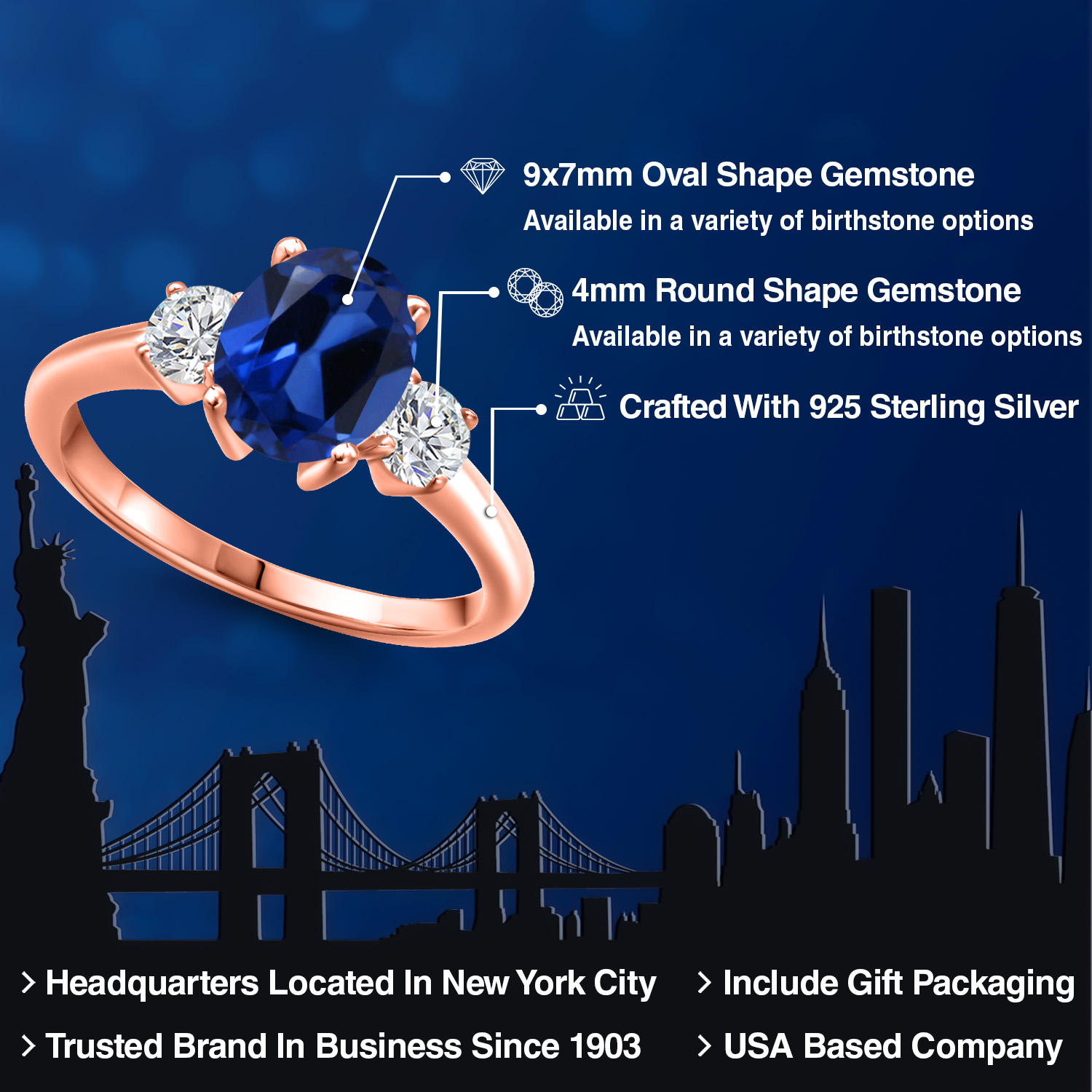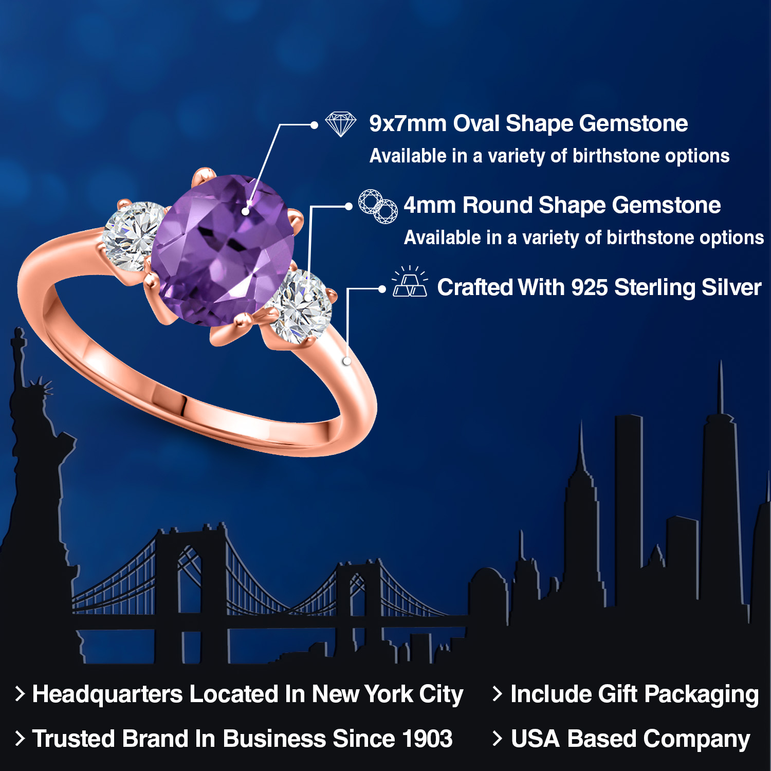 18K Rose Gold Plated Silver Gemstone Birthstone and Lab Grown Diamond 3-Stone Engagement Ring for Women | Oval 9X7MM and Round 4MM | Three Stone Wedding Anniversary Promise Ring | Sizes 5, 6, 7, 8, 9