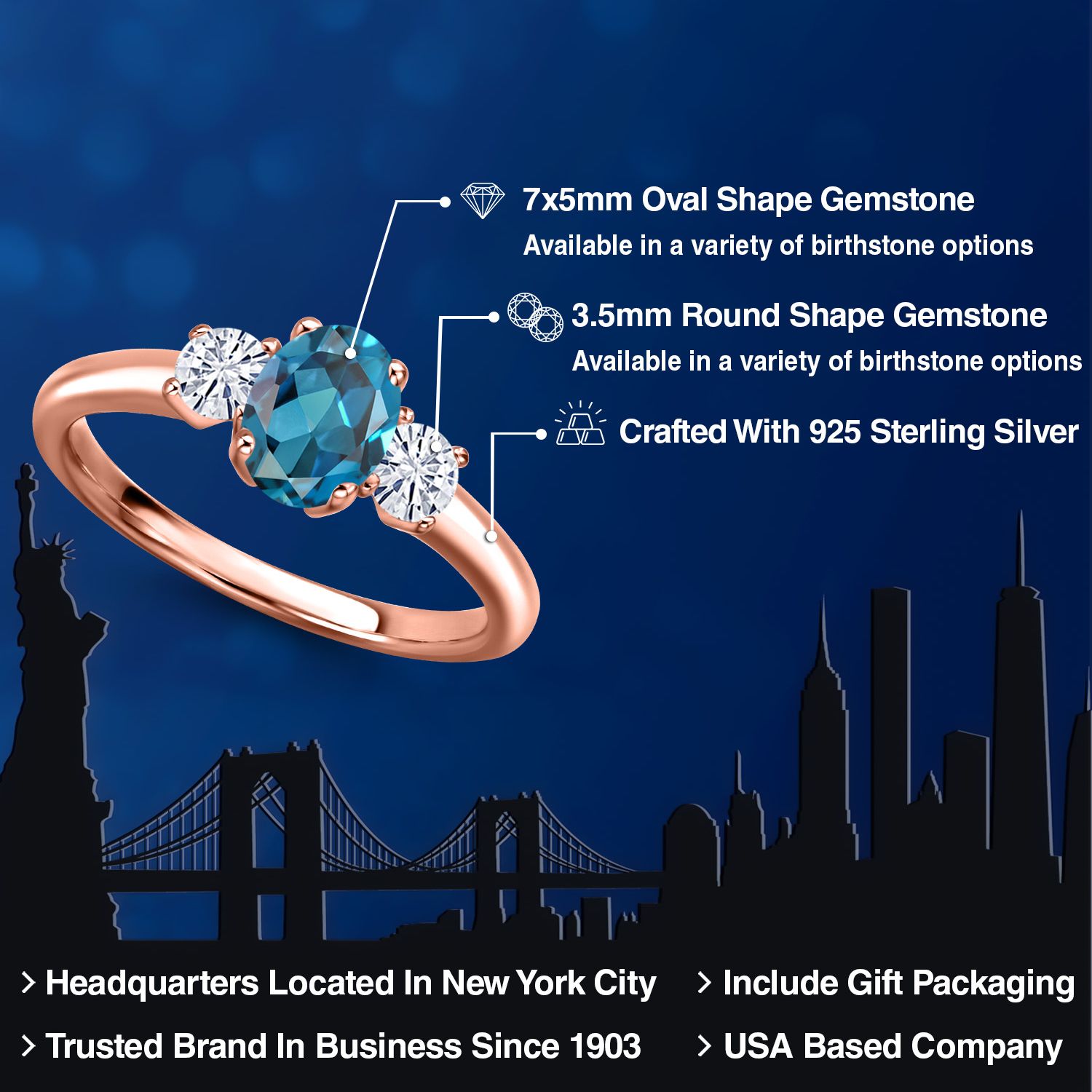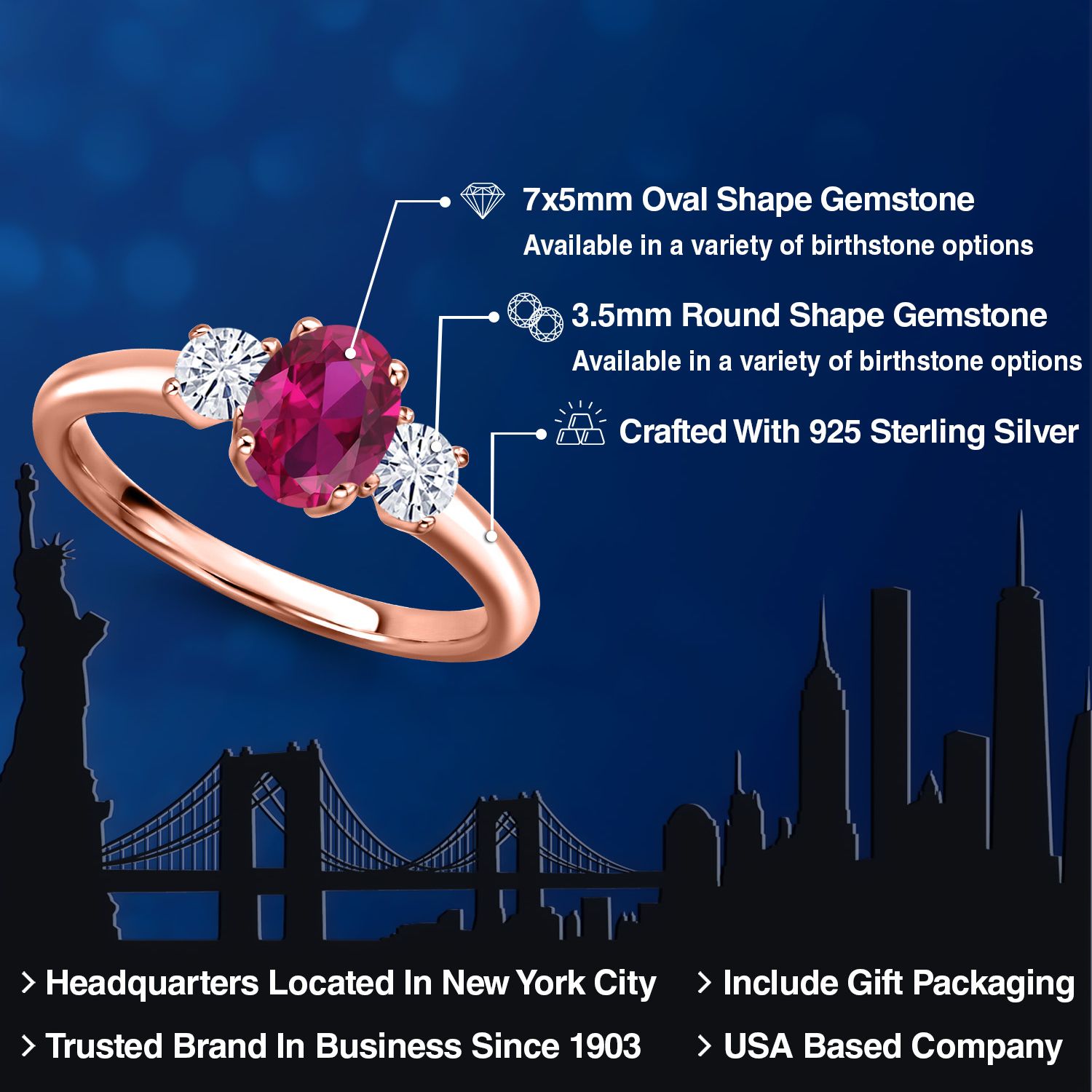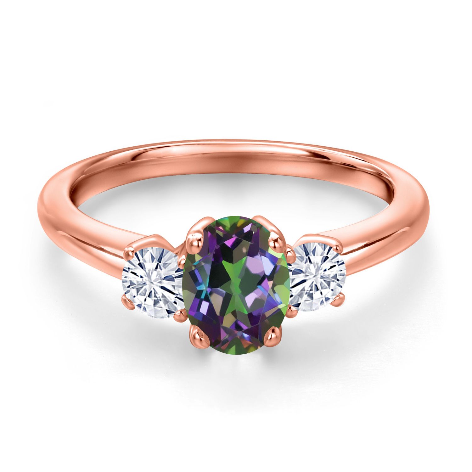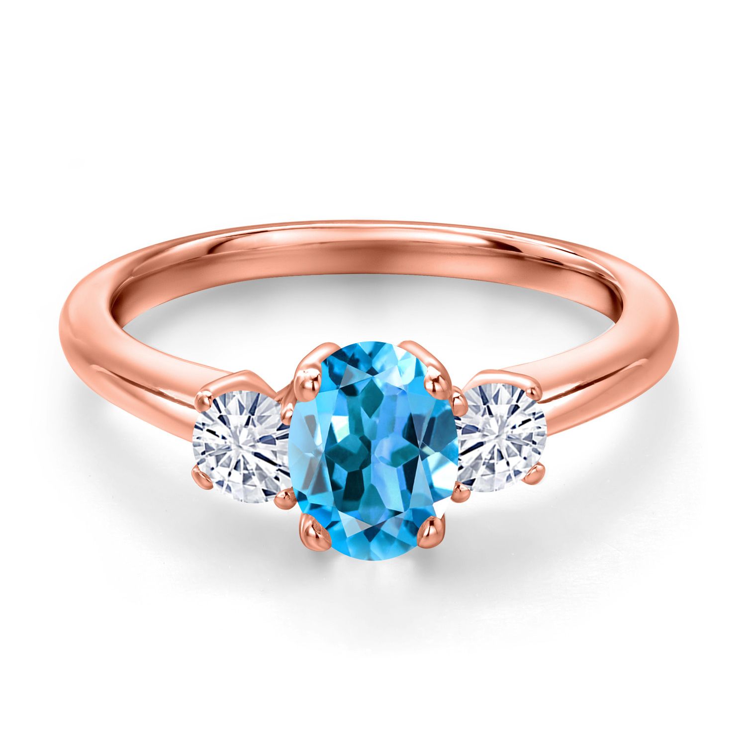 18K Rose Gold Plated Silver Gemstone Birthstone and White Moissanite 3-Stone Engagement Ring for Women | Oval 7X5MM and Round 3MM | Wedding Anniversary Promise Ring | Sizes 5, 6, 7, 8, 9
